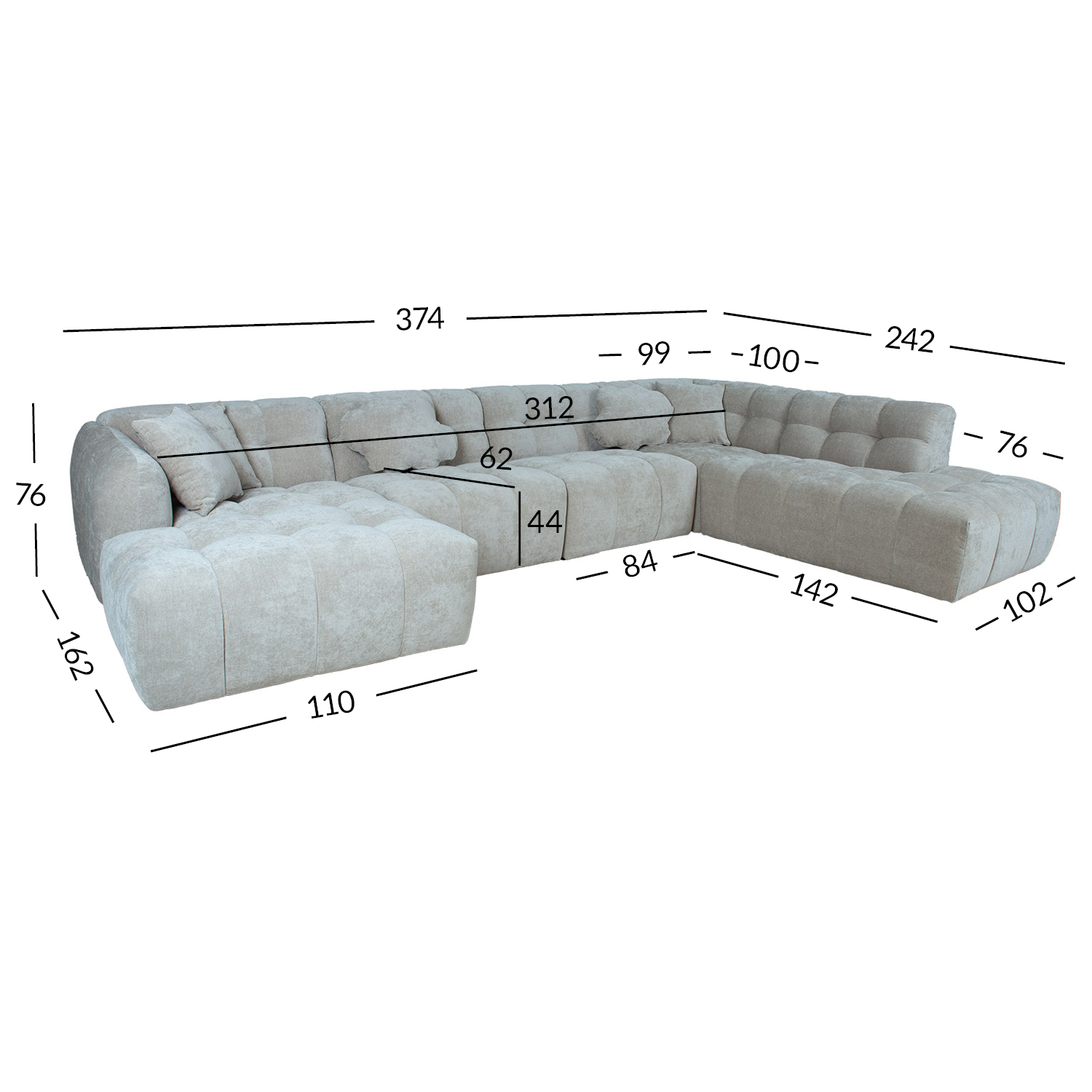 Bendrieji matmenys 374×162/242xH76 cm.