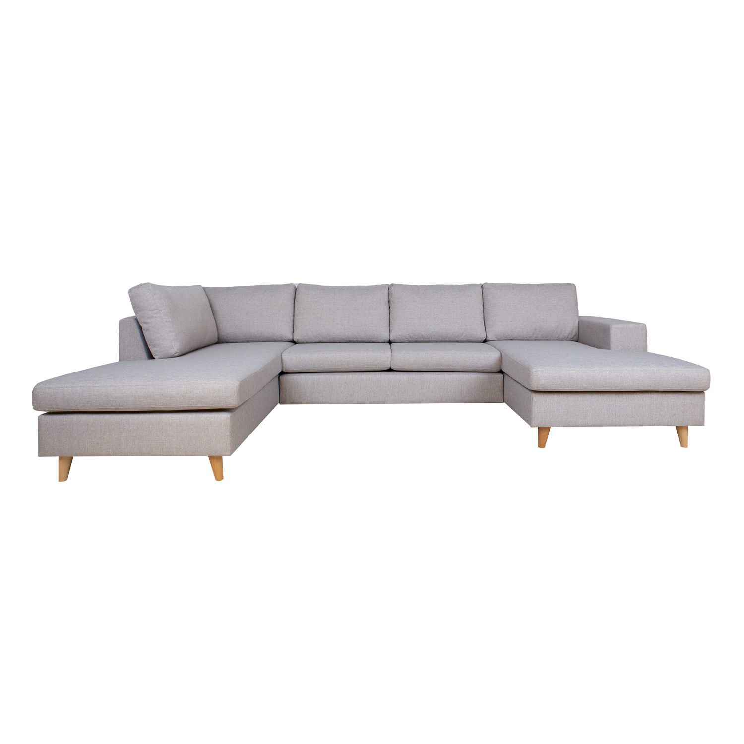 Kampinė sofa-lova HARALD kairysis kampas, smėlio spalvos. Didelė U formos kampinė sofa žavi savo švariu ir neutraliu dizainu ir puikiai dera prie įvairių interjero stilių. Dėl patogių minkštų pagalvėlių sofa yra puiki vieta atsipalaiduoti, o prireikus joje galima sutalpinti daug sėdinčių žmonių. Rėmas pagamintas iš beržo faneros ir medžio masyvo. Sėdėjimo patogumą užtikrina zigzaginė pakaba. Visos sėdynių pagalvėlės išimamos. Sėdimųjų pagalvių viduje yra patvarus HR faneros apmušalas, padengtas minkštomis poliesterio putomis. Laisvos atlošo pagalvėlės užpildytos smulkintu porolonu. Sėdynės ir atlošo pagalvių užvalkalai nuimami ir skalbiami. Sofos korpusas ir pagalvėlės aptrauktos aukštos kokybės apmušalų audiniu, Martindale vertė 90 000 – 100 000. Bendrieji sofos matmenys: 318×185/140xH92 cm. Ilgiausias kampas yra kairėje pusėje, žiūrint iš priekio. Sofos aukštis iki rėmo yra 73 cm. Sėdynės aukštis 47 cm. Sėdynės gylis 50 cm. Sėdynių pagalvės 90/70x167xH15cm, 93/68x126xH15cm. Vidutinio dydžio sėdynių pagalvių matmenys 70x65xH15cm/2vnt. Atlošo pagalvėlės yra 70x48x18cm/3vnt, 97/83x48x18cm/1vnt ir 80/68x48xH18cm/1vnt. Sofa turi medines kojas. Kojos yra 13 cm aukščio. Sofa pagaminta Estijoje.