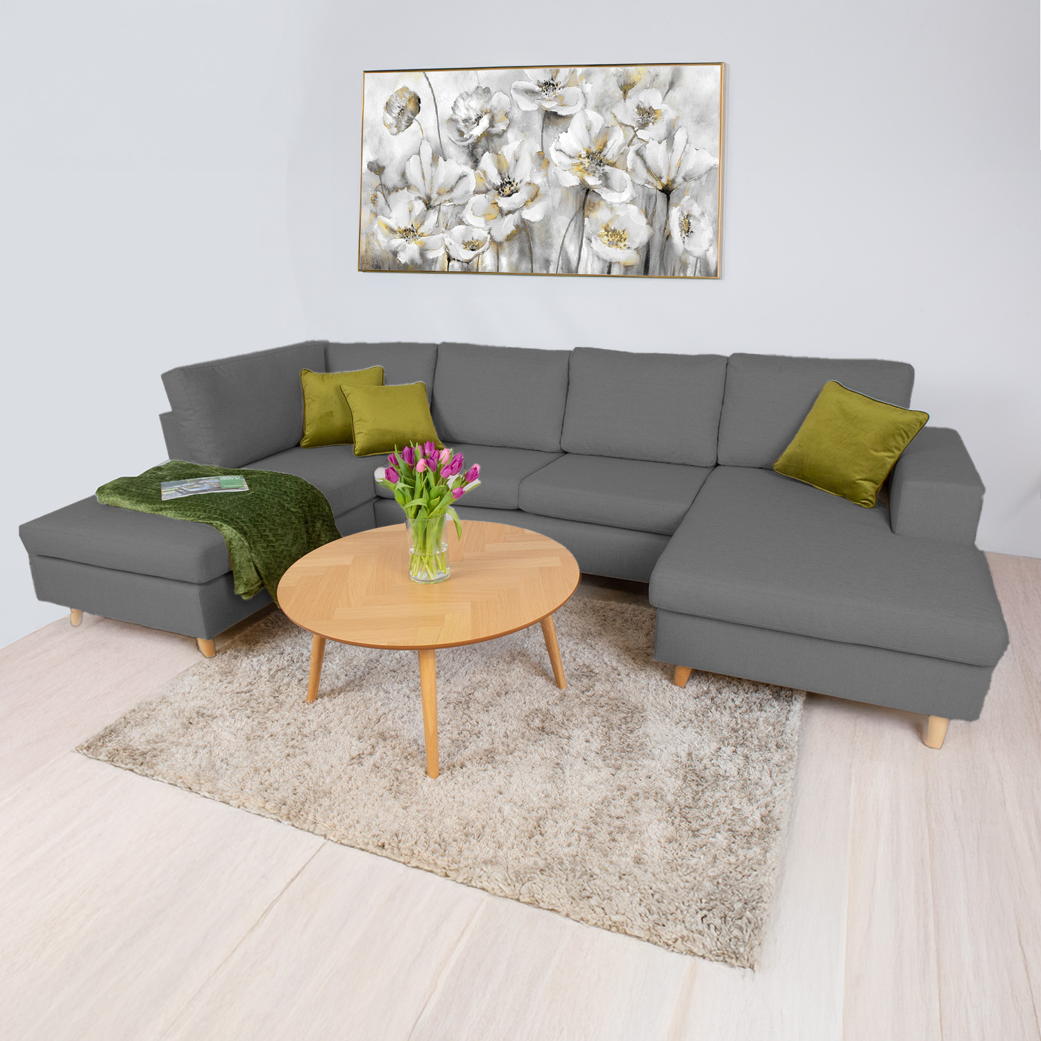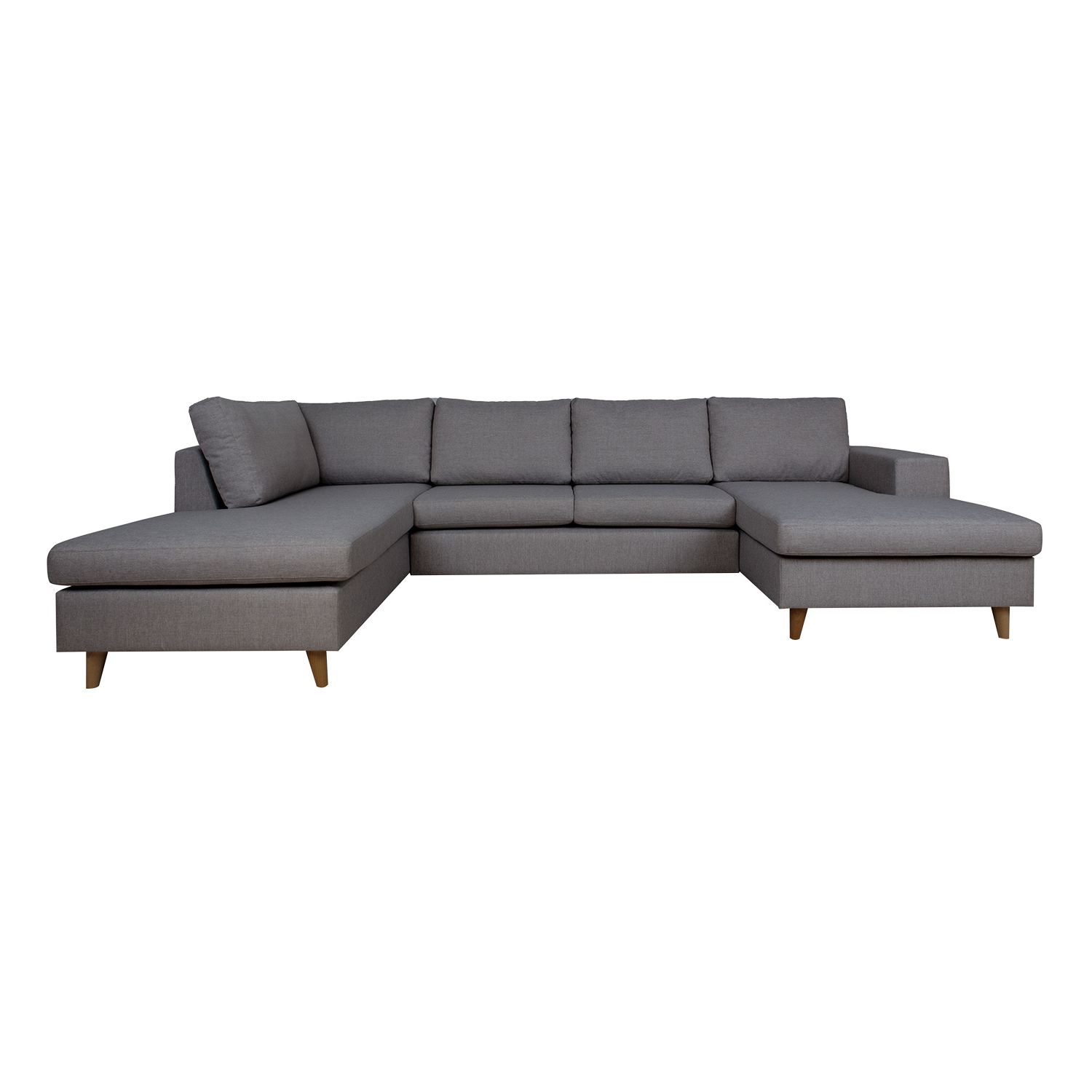 Kampinė sofa HARALD, kairysis kampas, tamsiai pilka. Didelė U formos kampinė sofa žavi švariu, neutraliu dizainu ir puikiai dera prie įvairių interjero stilių. Dėl maloniai minkštų pagalvėlių sofa yra puiki vieta atsipalaiduoti, o prireikus joje gali tilpti daug sėdinčių žmonių. Rėmas pagamintas iš beržo faneros ir medžio masyvo. Sėdėjimo patogumą užtikrina zigzaginė pakaba. Visos sėdynių pagalvėlės nuimamos. Sėdimųjų pagalvių viduje yra patvarus HR faneros apmušalas, padengtas minkštomis poliesterio putomis. Laisvos atlošo pagalvėlės užpildytos smulkintu porolonu. Sėdynės ir atlošo pagalvių užvalkalai yra nuimami ir skalbiami. Sofos korpusas ir pagalvėlės aptrauktos aukštos kokybės apmušalų audiniu, Martindale vertė 90 000 – 100 000. Bendrieji sofos matmenys: 318×185/140xH92 cm. Ilgiausias kampas yra kairėje pusėje, žiūrint iš priekio. Sofos aukštis iki rėmo yra 73 cm. Sėdynės aukštis 47 cm. Sėdynės gylis 50 cm. Sėdynių pagalvės 90/70x167xH15cm, 93/68x126xH15cm. Vidutinio dydžio sėdynių pagalvių matmenys 70x65xH15cm/2vnt. Atlošo pagalvėlės yra 70x48x18cm/3vnt, 97/83x48x18cm/1vnt ir 80/68x48xH18cm/1vnt. Sofa turi medines kojas. Kojos yra 13 cm aukščio. Sofa pagaminta Estijoje.