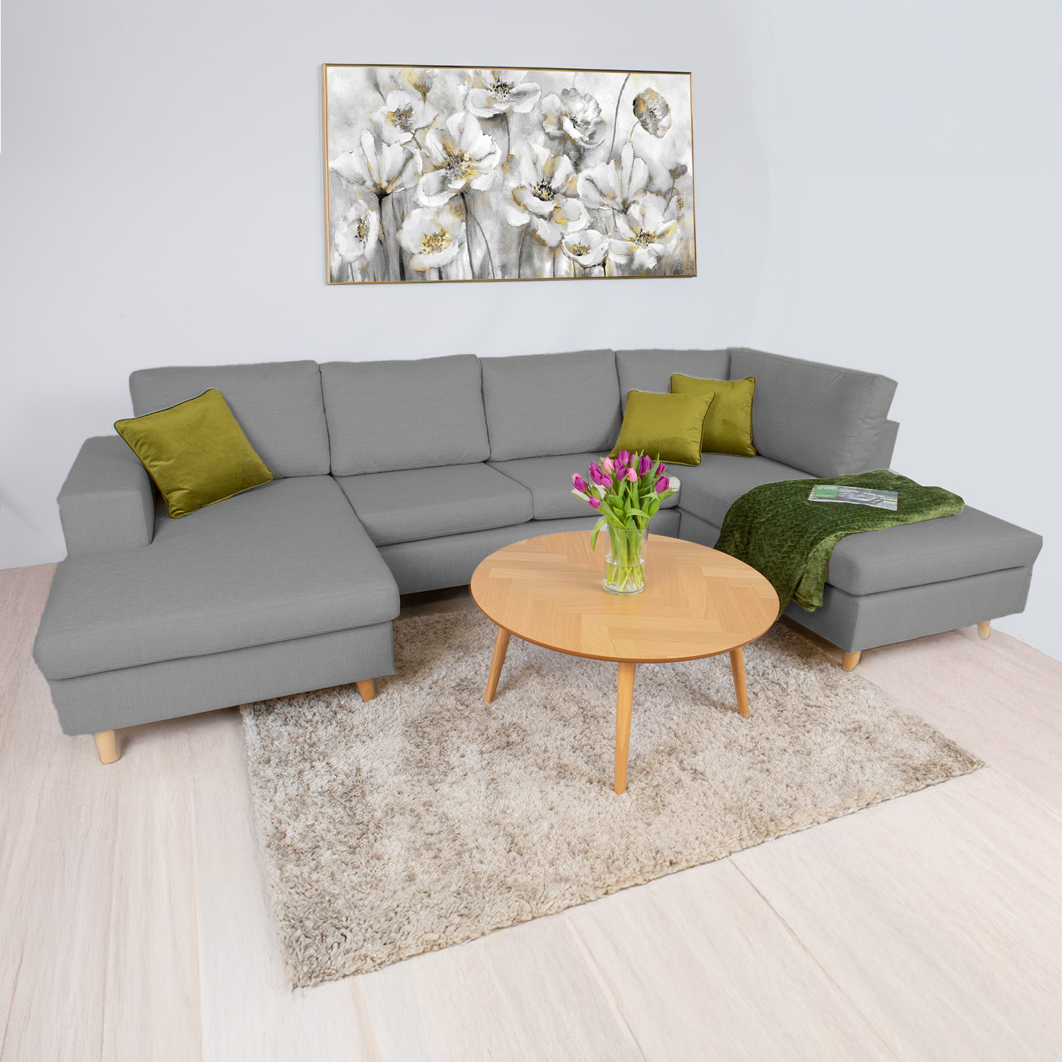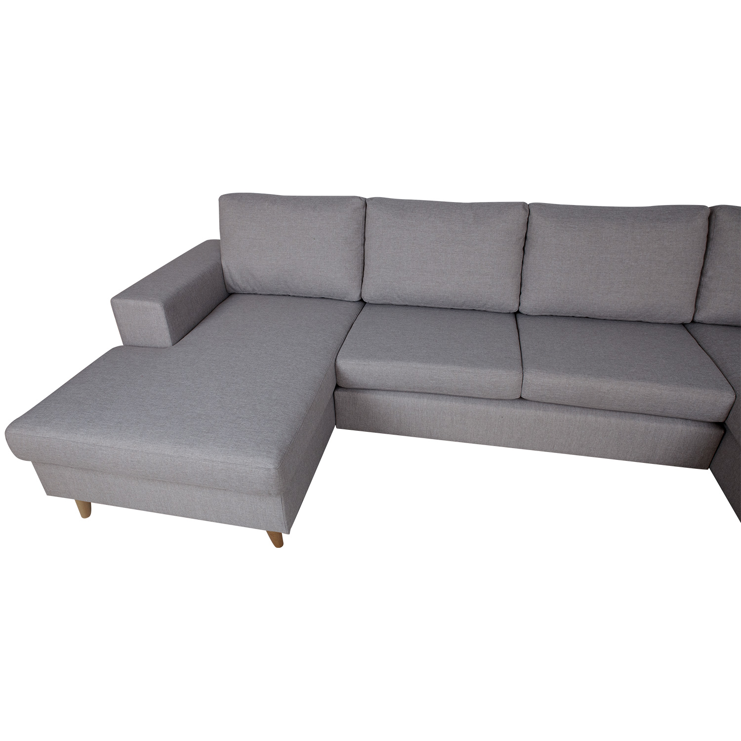 Kampinė sofa HARALD dešinysis kampas, pilka. Didelė U formos kampinė sofa žavi savo švariu ir neutraliu dizainu ir puikiai dera prie įvairių interjero stilių. Dėl patogių minkštų pagalvėlių sofa yra puiki vieta atsipalaiduoti, o prireikus joje gali tilpti daug sėdinčių žmonių. Rėmas pagamintas iš beržo faneros ir medžio masyvo. Sėdėjimo patogumą užtikrina zigzaginė pakaba. Visos sėdynių pagalvėlės nuimamos. Sėdimųjų pagalvių viduje yra patvarus HR faneros apmušalas, padengtas minkštomis poliesterio putomis. Laisvos atlošo pagalvėlės užpildytos smulkintu porolonu. Sėdynės ir atlošo pagalvių užvalkalai yra nuimami ir skalbiami. Sofos korpusas ir pagalvėlės aptrauktos aukštos kokybės apmušalų audiniu, Martindale vertė 90 000 – 100 000. Bendrieji sofos matmenys: 318×140/185xH92 cm. Ilgiausias kampas yra dešinėje priekinio vaizdo pusėje. Sofos aukštis iki rėmo yra 73 cm. Sėdynės aukštis 47 cm. Sėdynės gylis 50 cm. Sėdynių pagalvės 90/70x167xH15cm, 93/68x126xH15cm. Vidutinio dydžio sėdynių pagalvių matmenys 70x65xH15cm/2vnt. Atlošo pagalvėlės yra 70x48x18cm/3vnt, 97/83x48x18cm/1vnt ir 80/68x48xH18cm/1vnt. Sofa turi medines kojas. Kojos yra 13 cm aukščio. Sofa pagaminta Estijoje.