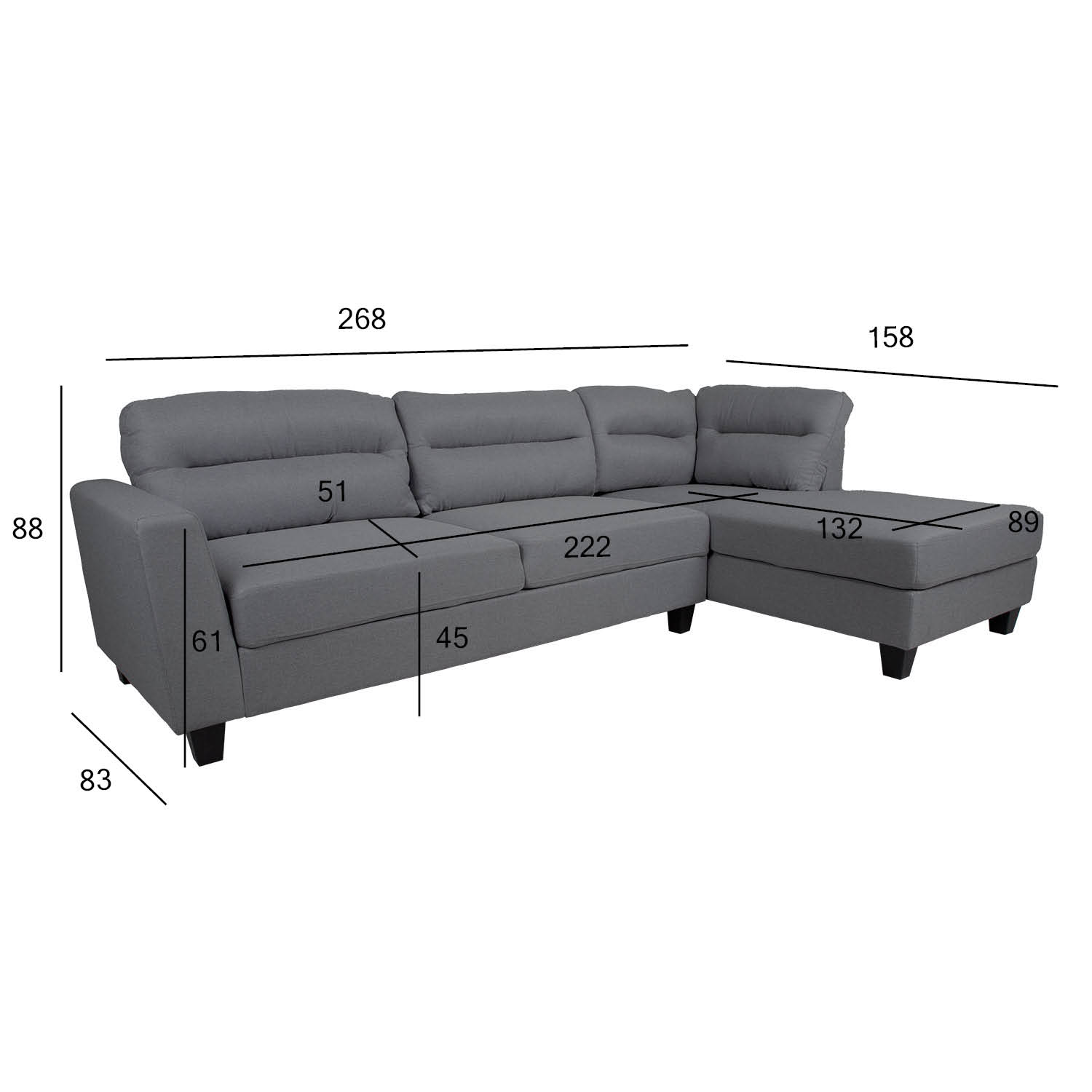 Kampinė sofa HELSINKI, dešinysis kampas, tamsiai pilka. Rėmas pagamintas iš medžio masyvo ir faneros. Apmušalai pagaminti iš 25-28 kg/m³ tankio poliuretano putų. Sėdynės viduje yra kišeninių spyruoklių blokas. Atviros atlošo pagalvėlės prie atlošo tvirtinamos užtrauktuku ir dirželiu. Pagalvėlės užpildytos poliesterio putplasčiu. Užvalkalo medžiagą: 100 % poliesterio audinys. Bendrieji sofos matmenys: 268×83/158xH88 cm. Sėdimosios dalies plotis 165+57 cm, sėdimosios dalies gylis 51/132 cm, sėdimosios dalies aukštis 45 cm. Porankio aukštis nuo žemės 61 cm. Sofa turi tamsios spalvos plastikines kojeles.