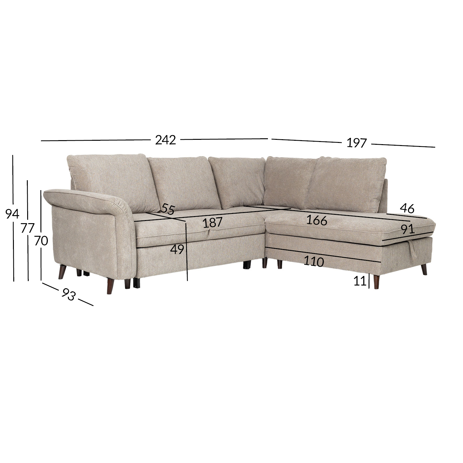 Bendrieji sofos matmenys: 242×93/197xH94 cm. Sėdimosios dalies plotis 187 cm, sėdimosios dalies gylis 55/166 cm, sėdimosios dalies aukštis 49 cm. Porankių aukštis nuo žemės 70 cm. Sofos aukštis iki rėmo krašto 77cm.