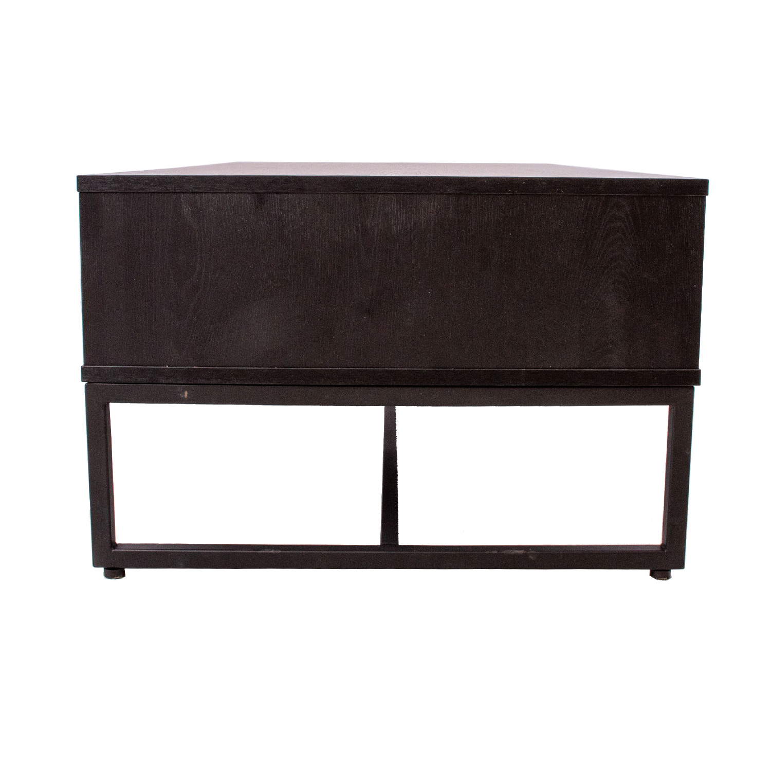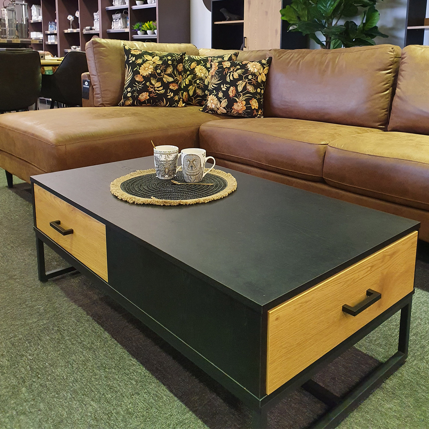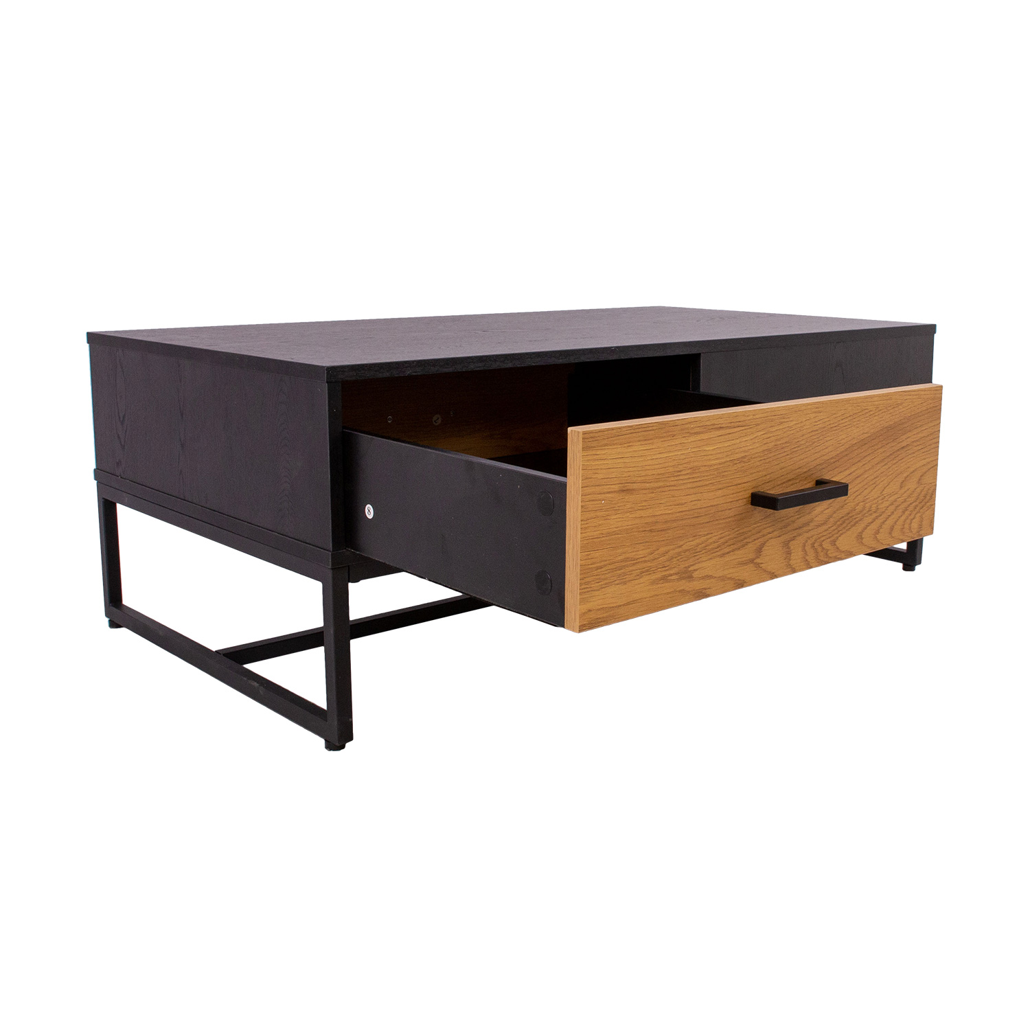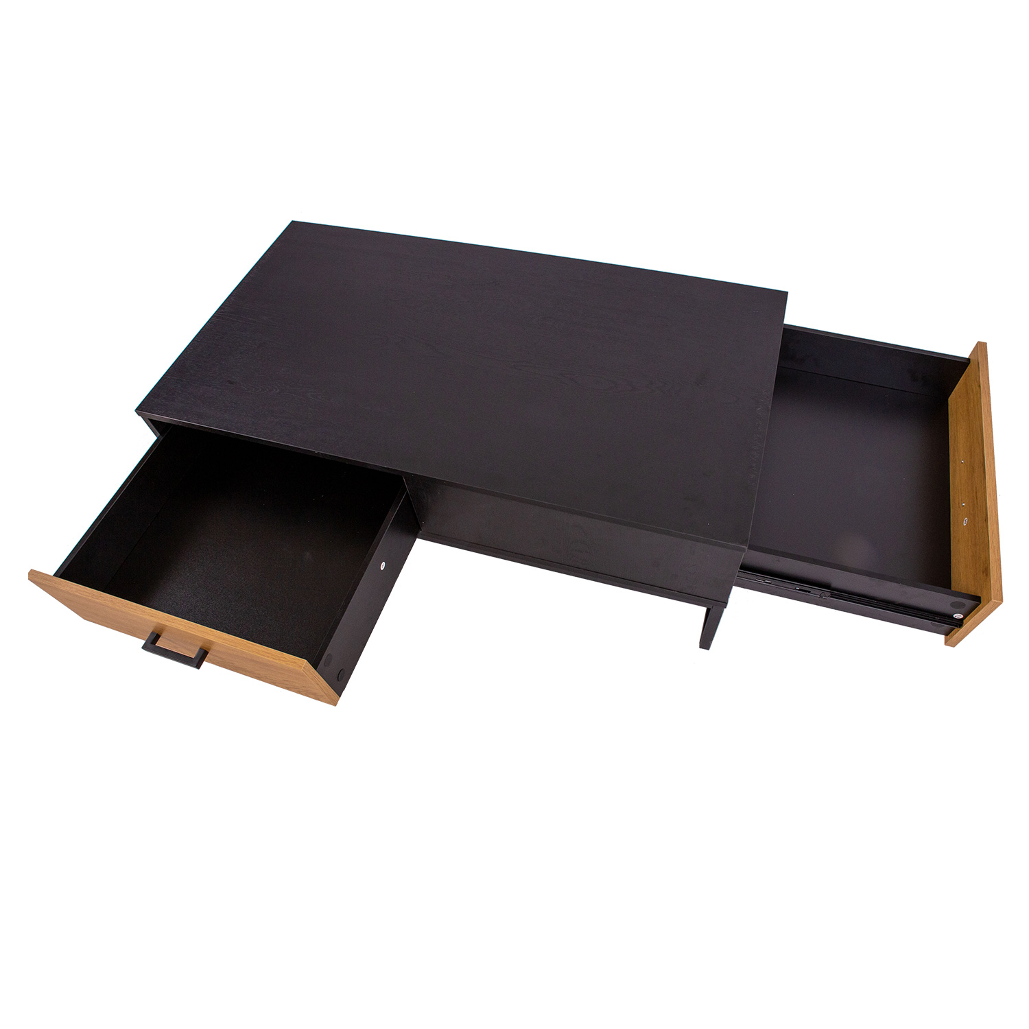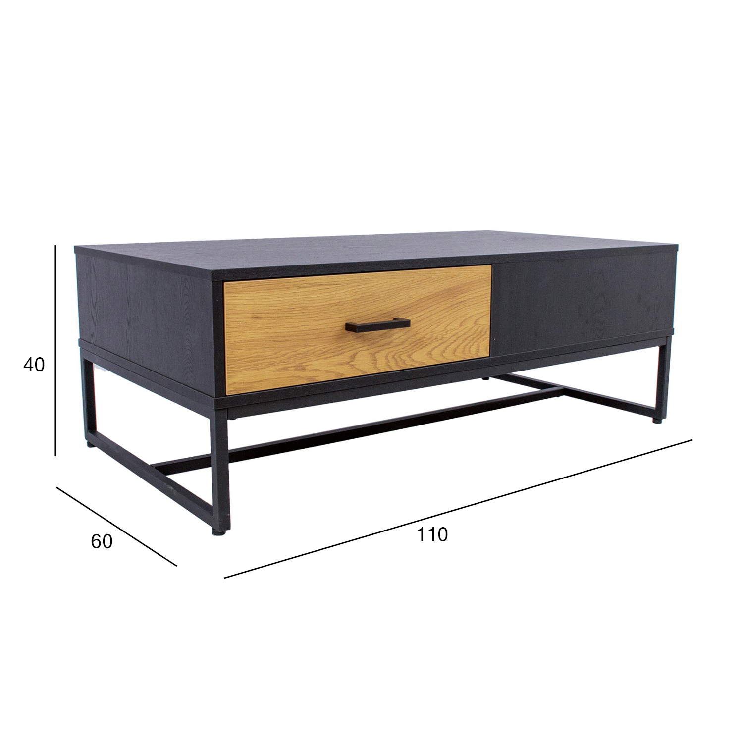 Sofos prekystalis AMSTERDAM 110x60xH40cm. Medžiaga: melamino stalviršis, spalva: ąžuolas/juoda. Juodos spalvos metalinis rėmas. Tyliai užsidarantys stalčių šliaužikliai. Juodos aliuminio rankenėlės.