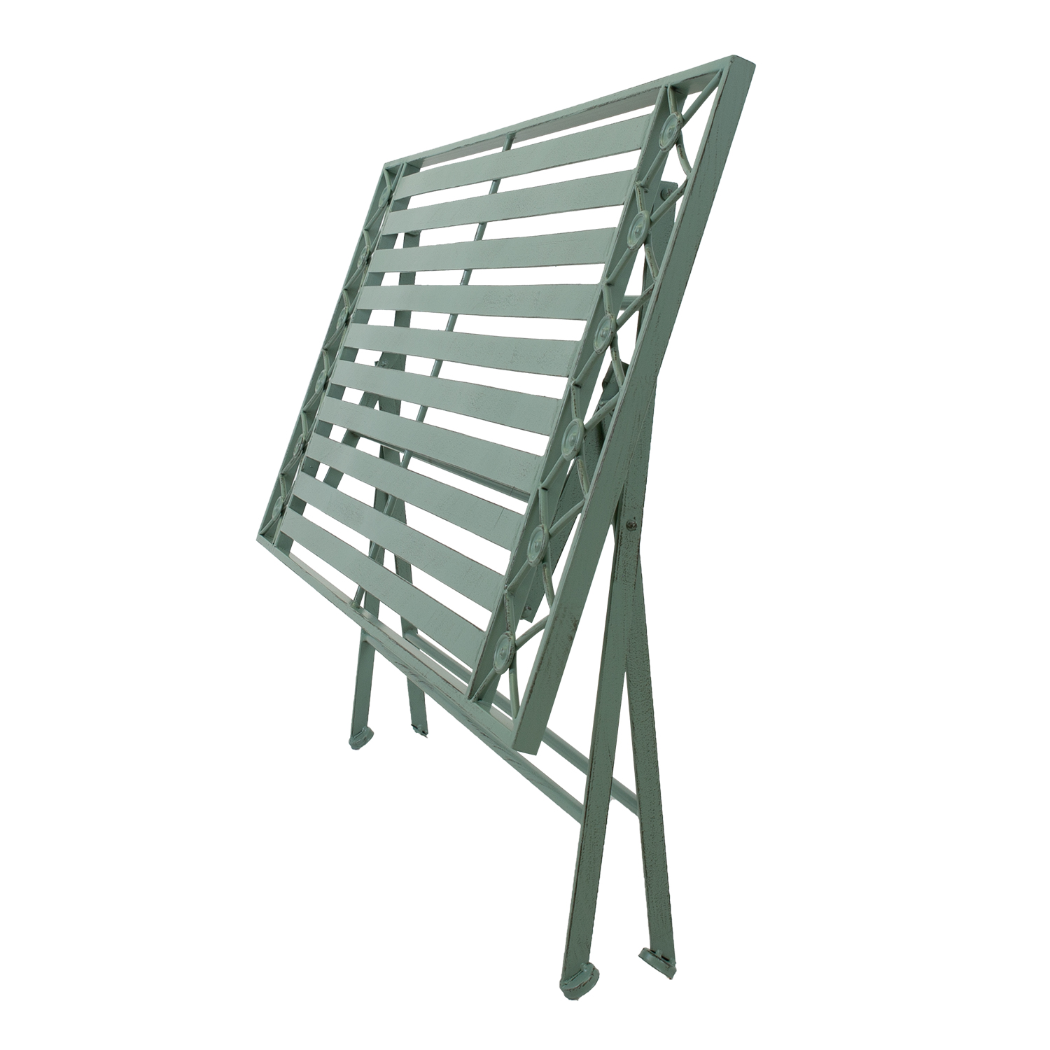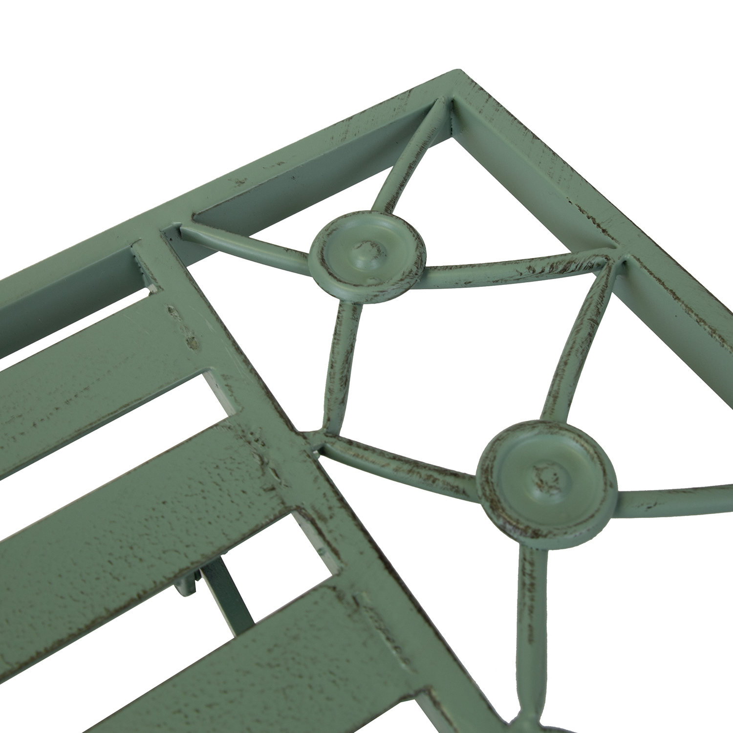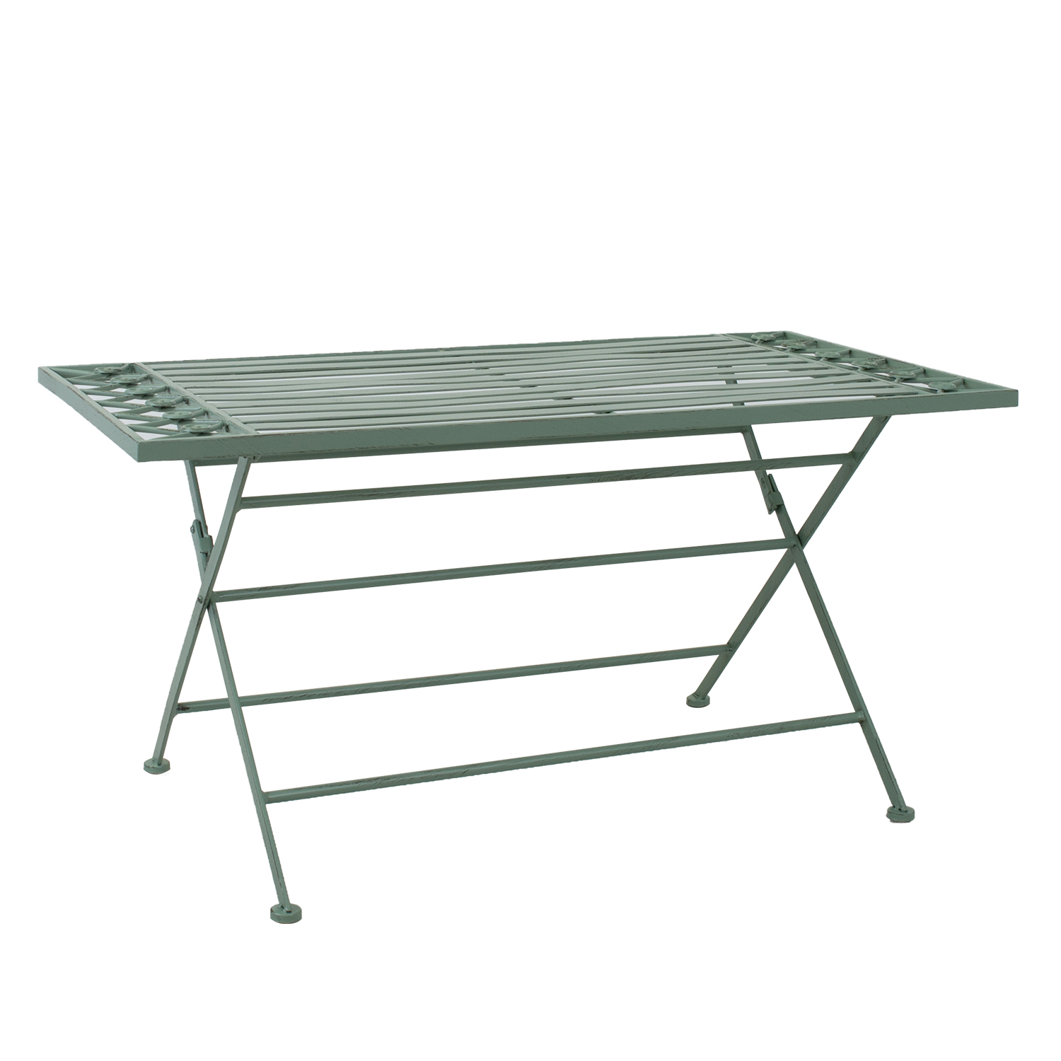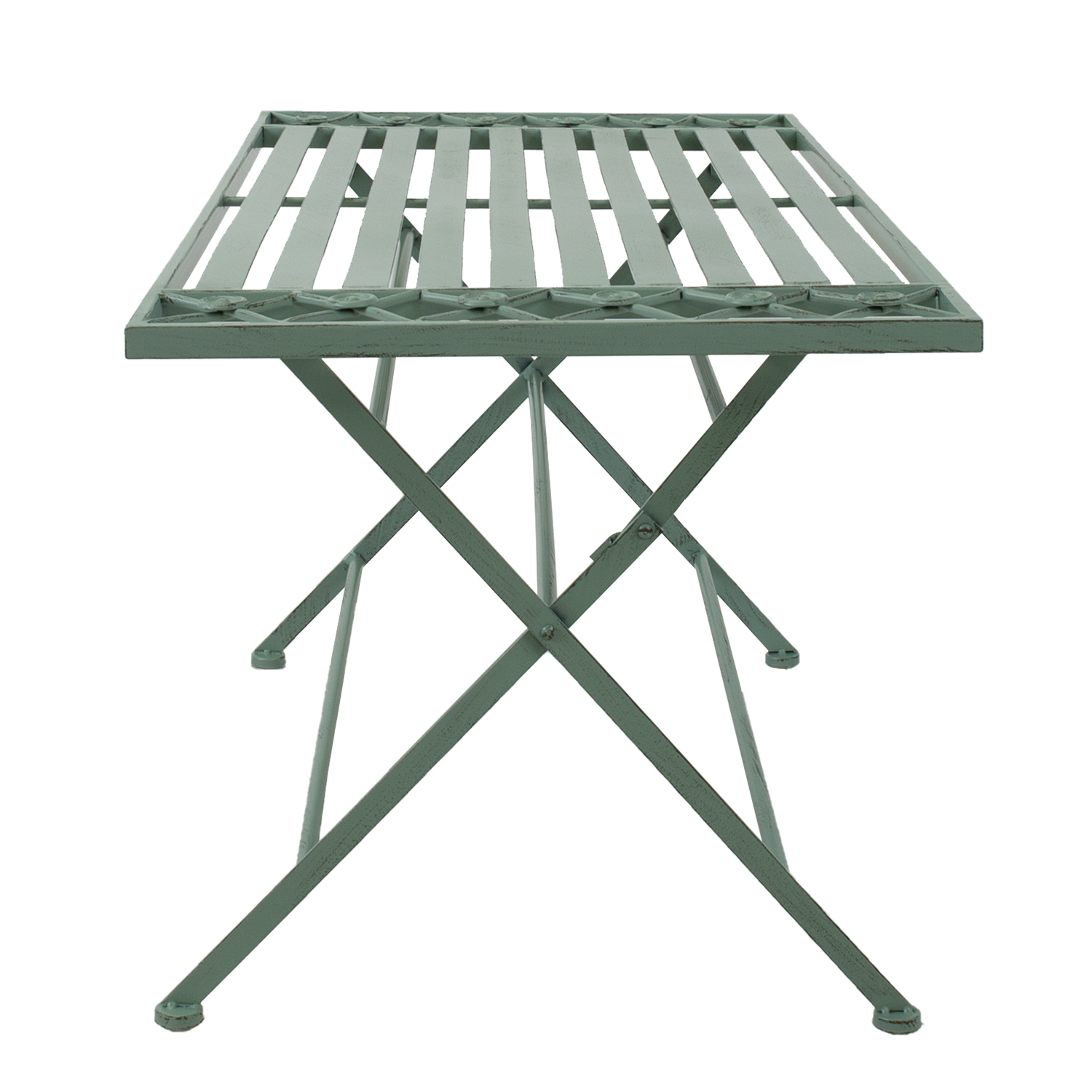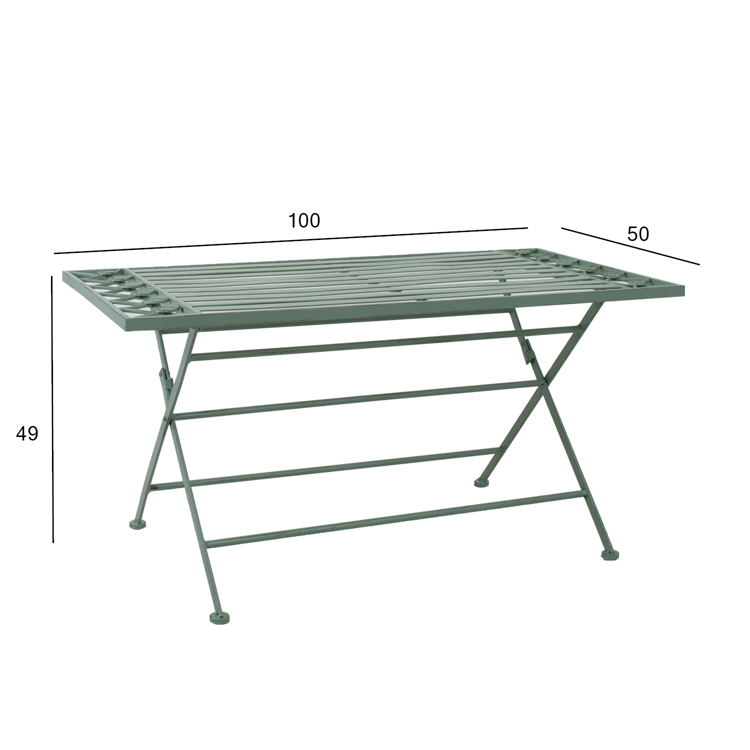 Sofos staliukas MINT sulankstomas 100x50xH49cm, antikvarinės žalios spalvos. Kaltinio metalo baldai yra stilingi ir ilgaamžiai! Gaminys padengtas elektroforezės ir miltelinio dažymo deriniu, kuris užtikrina puikų atsparumą rūdims. Surinktas stalas užima nedaug vietos, jį lengva laikyti ir perkelti. PRIEŽIŪRA IR PRIEŽIŪRA: Metaliniai baldai beveik nereikalauja priežiūros, tereikia reguliariai valyti. Pasibaigus vasaros sezonui, rekomenduojame sodo baldus laikyti patalpoje. Pasibaigus vasaros mėnesiams, baldus reikėtų laikyti sode. Sandėliavimui naudokite sausą ir gerai vėdinamą patalpą.