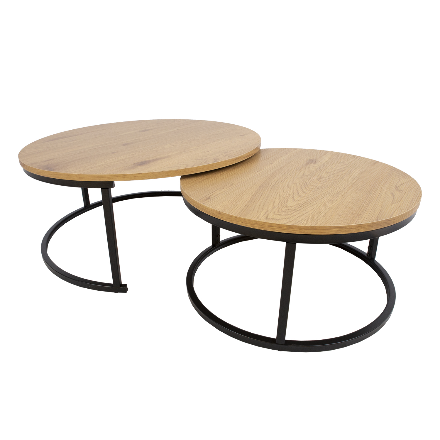 Sofos staliukas BRITU, 2 vnt., šviesus medis. Šviesaus medžio dekoro stalviršis pagamintas iš 18 mm storio MDF plokštės. Stalo rėmas ir kojos pagamintos iš metalo ir padengtos juodais milteliniais dažais. Stalo matmenys D80xH35 cm, D60xH32 cm.