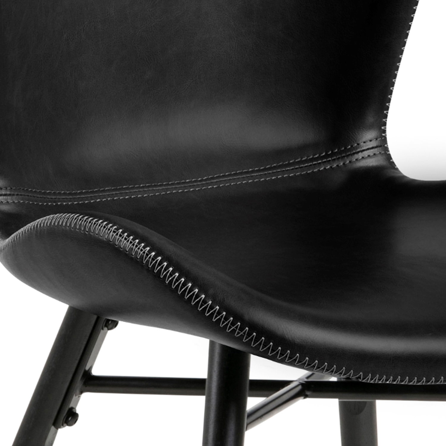 Kėdė BATILDA 47x56xH82,5 cm, sėdynė ir atlošas: oda, spalva: juoda, kojos: kaučiukmedis, spalva: juoda. Sėdynės aukštis 46,5 cm, audinys: odos išvaizdos retro juoda PU247, kėdės kojos su zigzago formos dygsniais, juodas metalinis rėmas po kėde. Ribinis svoris: 110 kg.