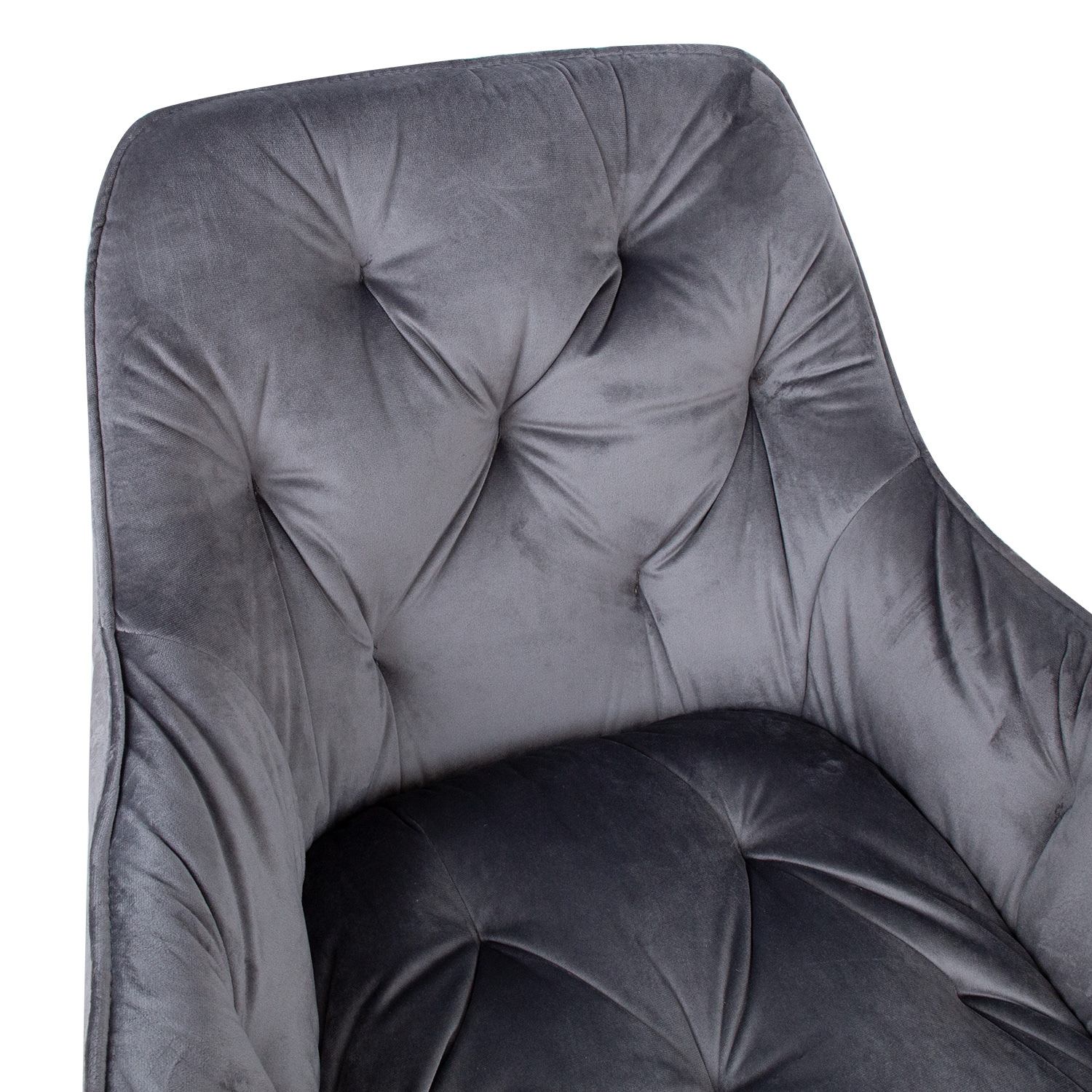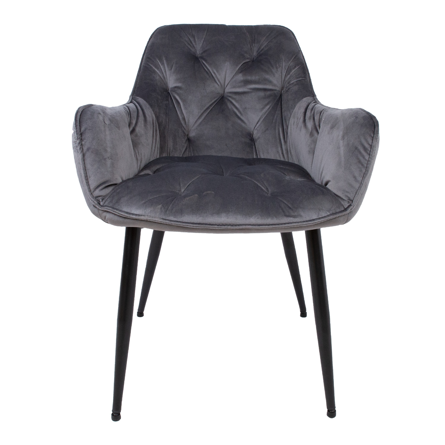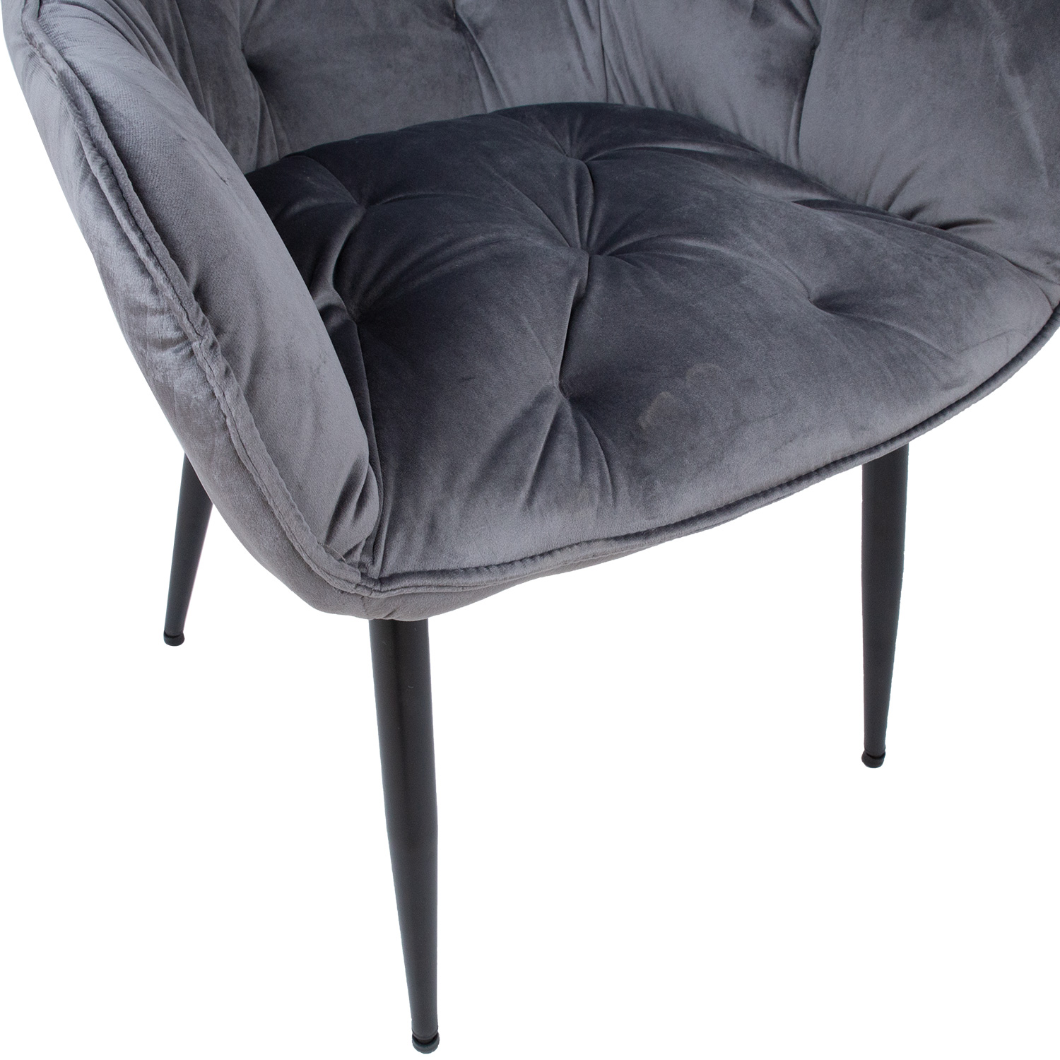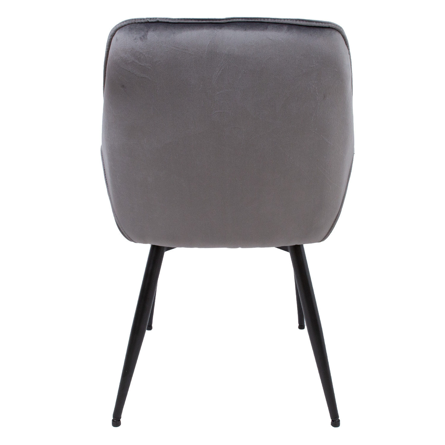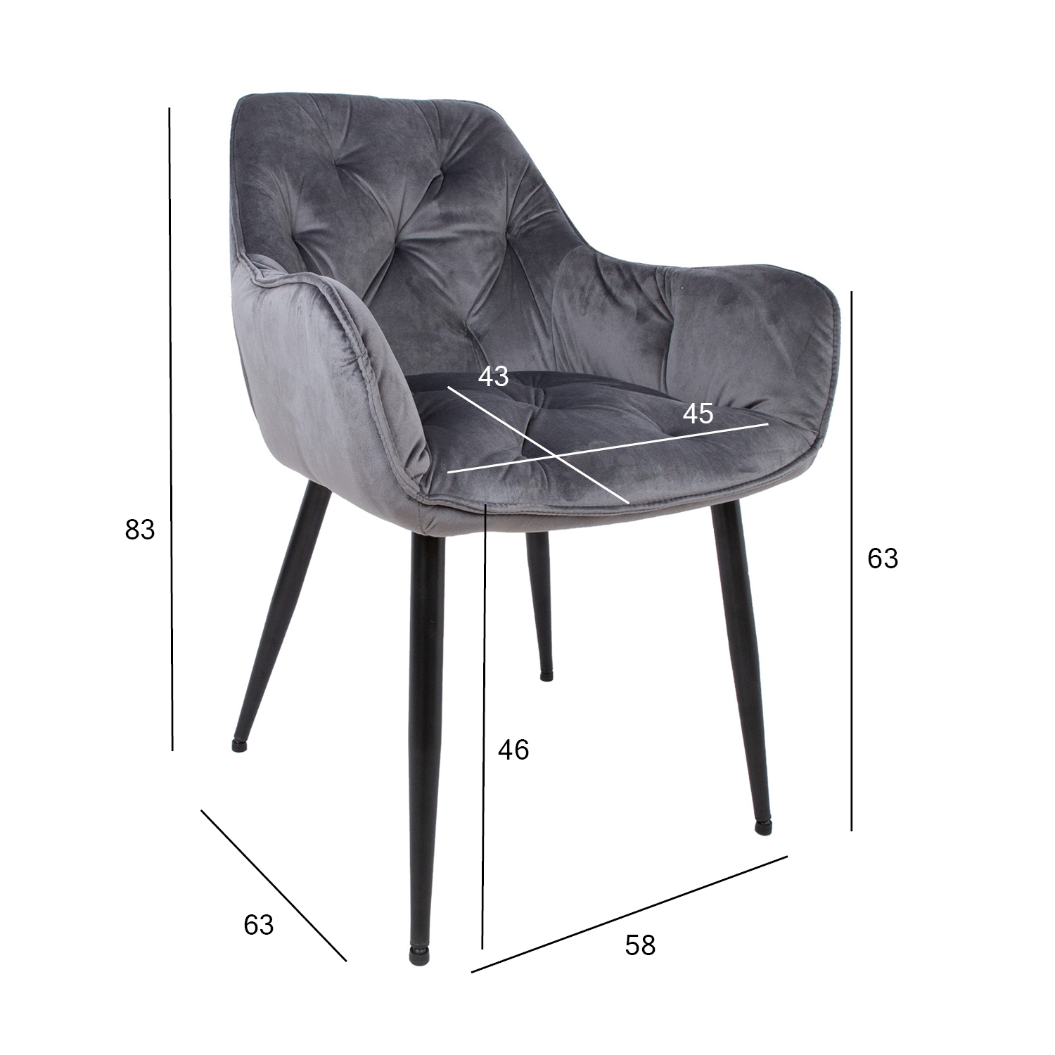 Įrankis BRITA pasišaipė. Sėdimoji dalis lengvai apmušta ir aptraukta pilku aksominiu audiniu. Sėdynės aukštis 47,5 cm. Užvalkalo medžiaga: 100% poliesteris, Martindale 25 000. Sėdynės rėmas: metalas ir fanera. Apmušalas: putų poliuretanas. Metalinės kojos padengtos juodais milteliniais dažais. Bendrieji kėdės matmenys: 58x63H83cm. Sėdynės plotis 40 cm, sėdynės gylis 43 cm, sėdynės aukštis 47 cm. Atlošo aukštis 43 cm. Ribinis svoris 120 kg.