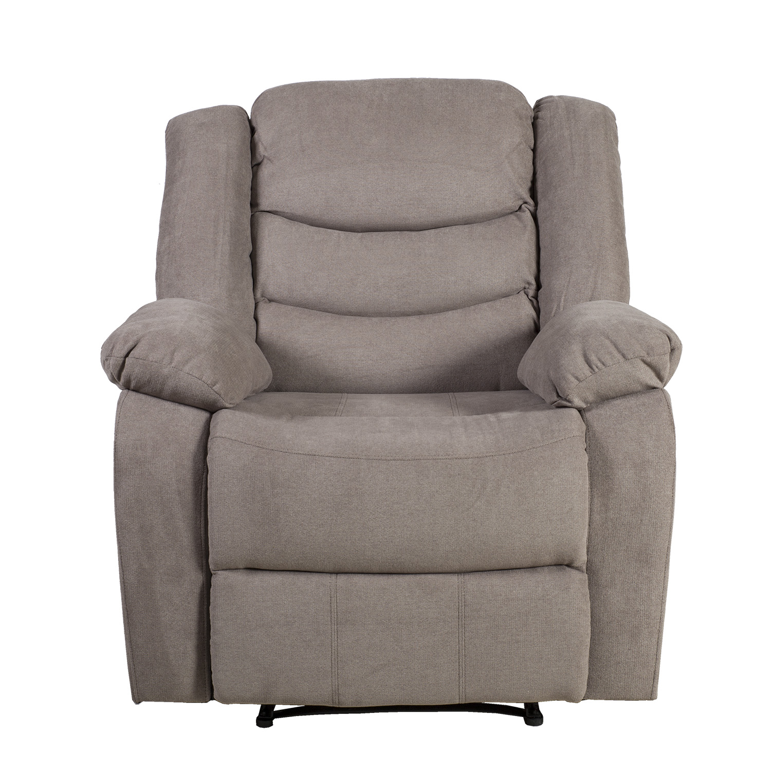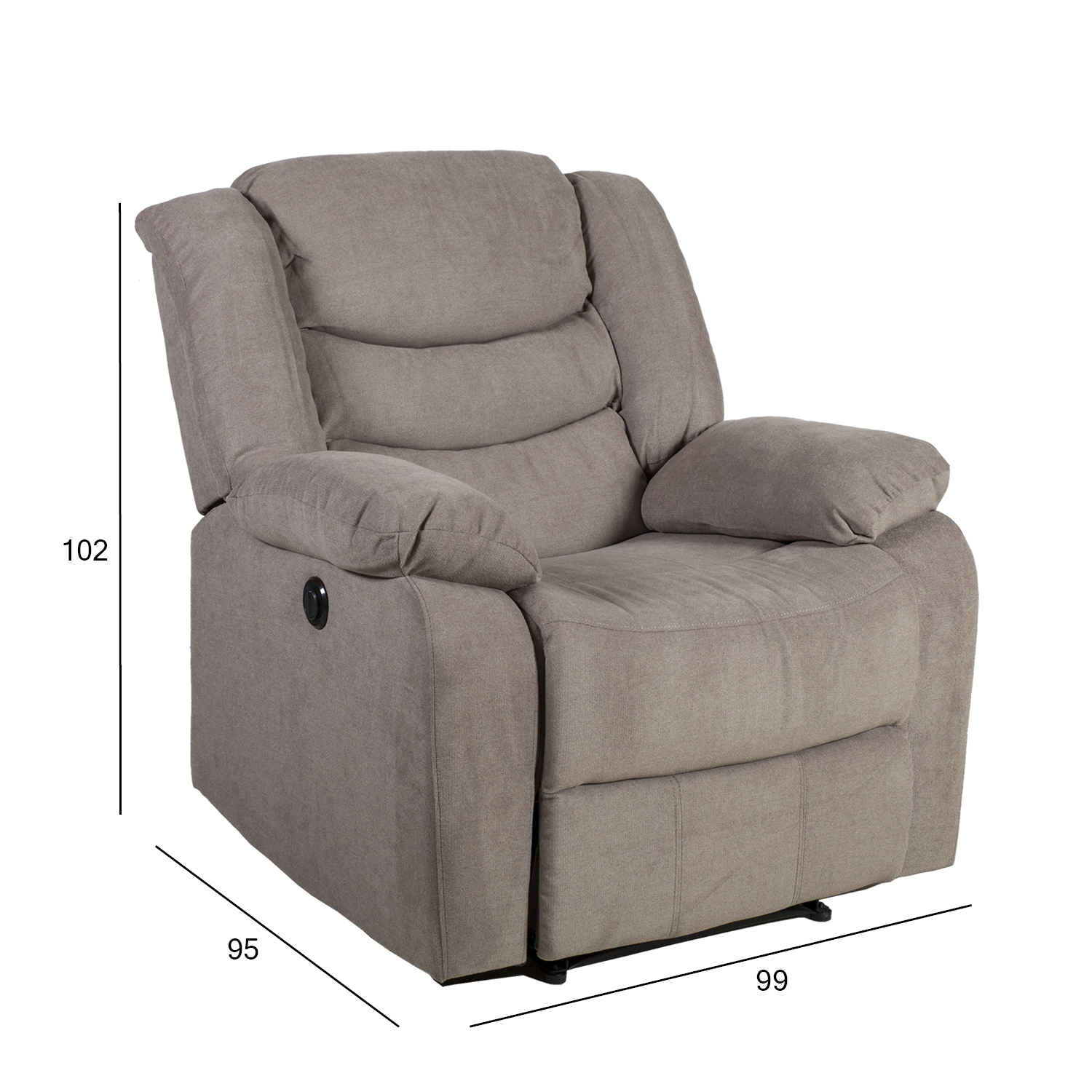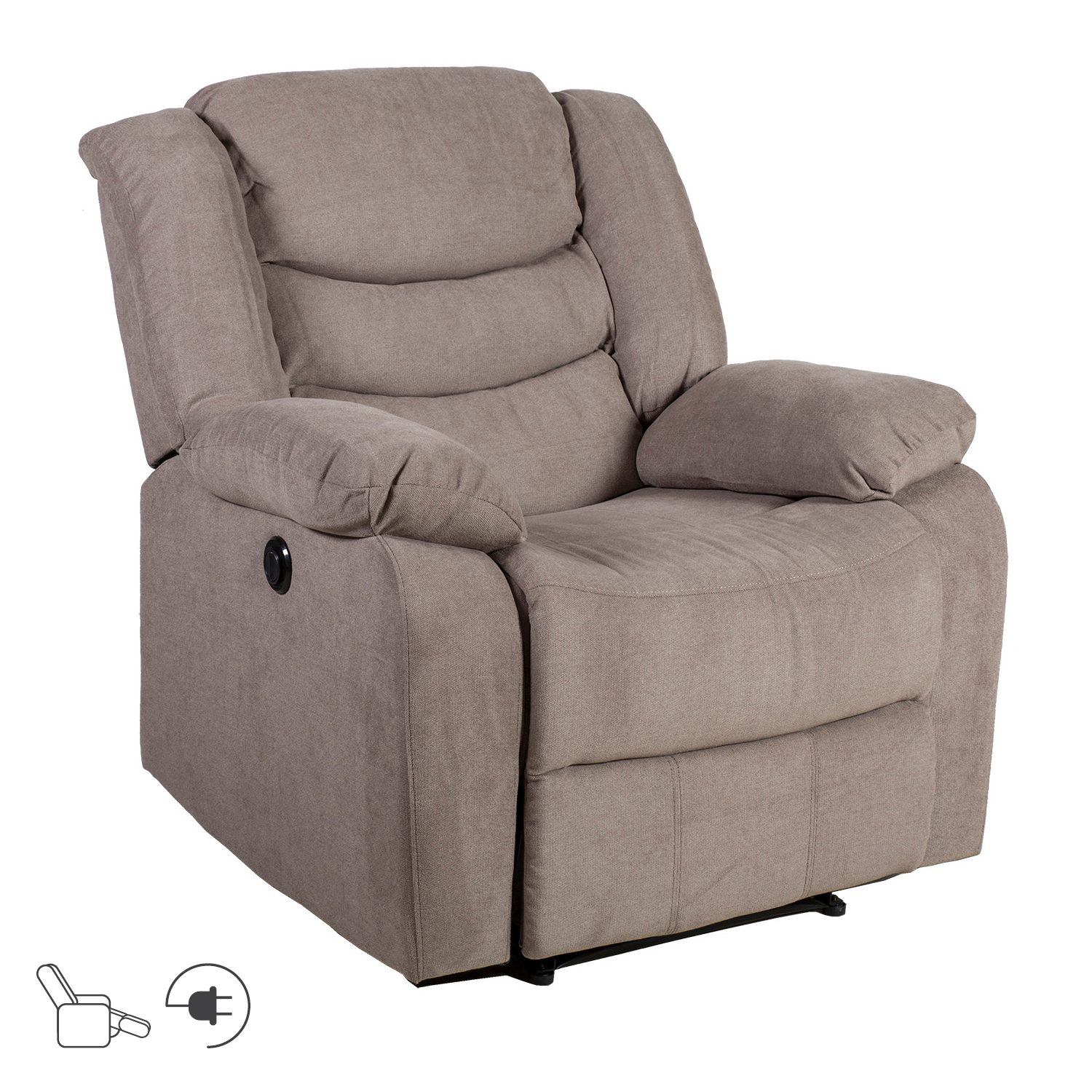Atraminė kėdė CYRUS recliner, taupe spalvos. Šis fotelis labai patogus ir minkštas. Kėdės atlošo mechanizmai valdomi elektra ir gali būti valdomi mygtuku, esančiu išorinėje porankio pusėje. Galima reguliuoti ir atlošą, ir kojų atramą. Pakėlus kojų atramą, atlošas sklandžiai pereina į atsilenkimo padėtį. Fotelis aptrauktas rudai pilku poliesterio audiniu. Rėmas pagamintas iš medžio, faneros ir metalo. Gaminys turi zigzaginę ir kišeninę pakabą. Apmušalas: poliuretano putos 28 kg/m³, dakronas. Gaminio matmenys 99x95xH102 cm.