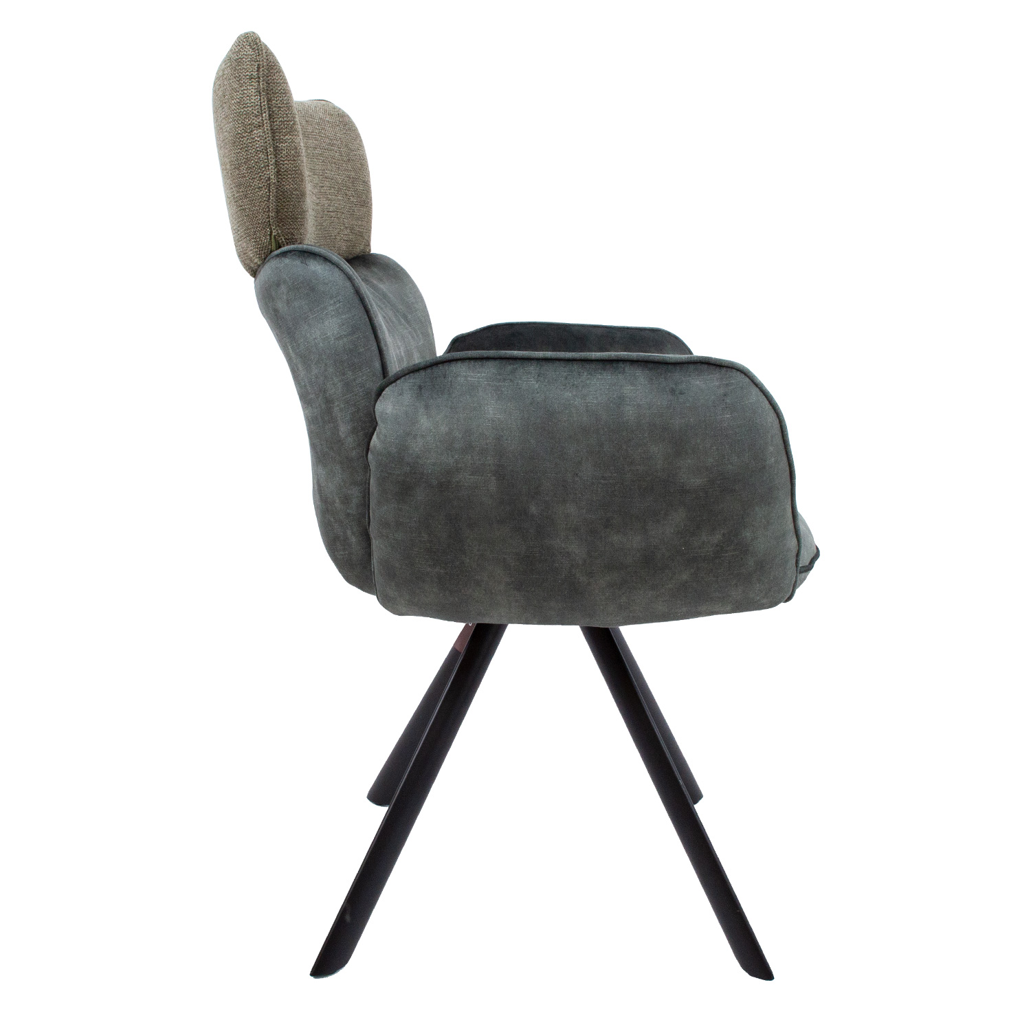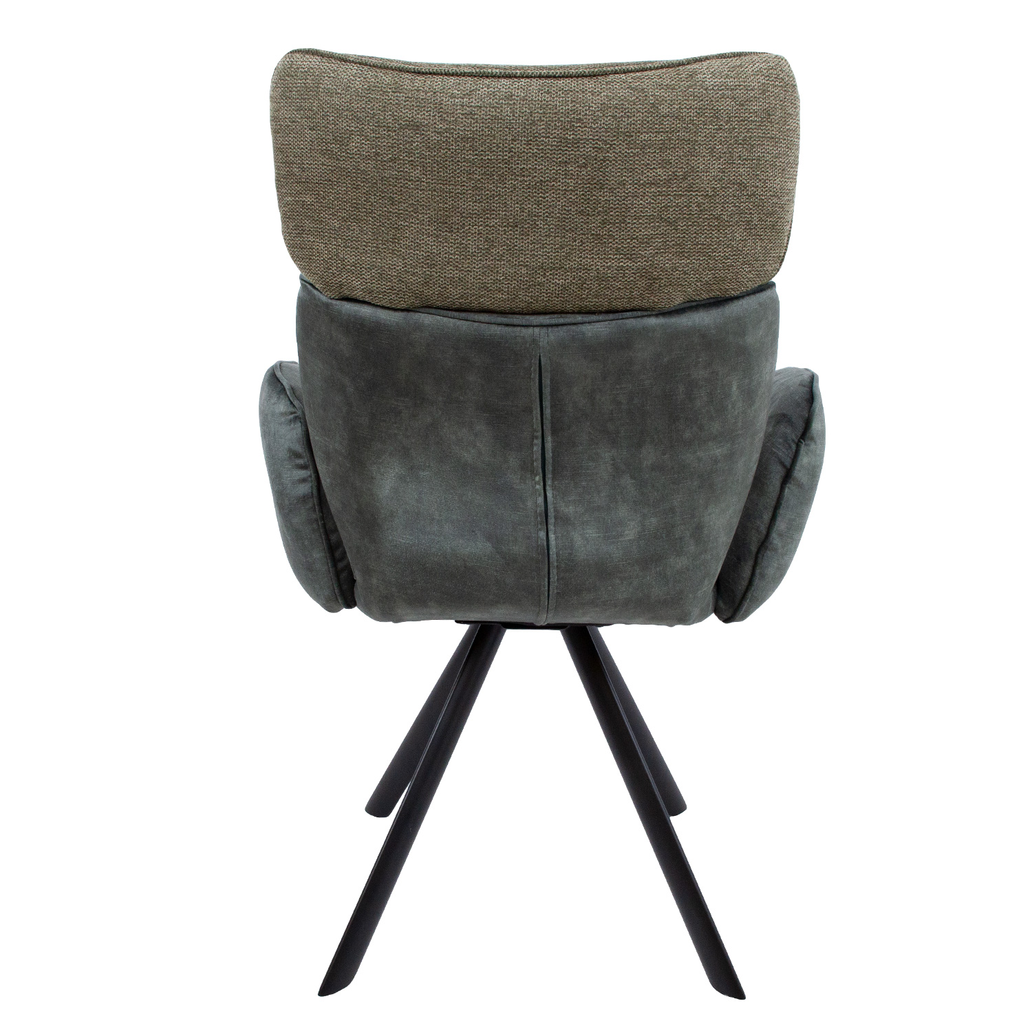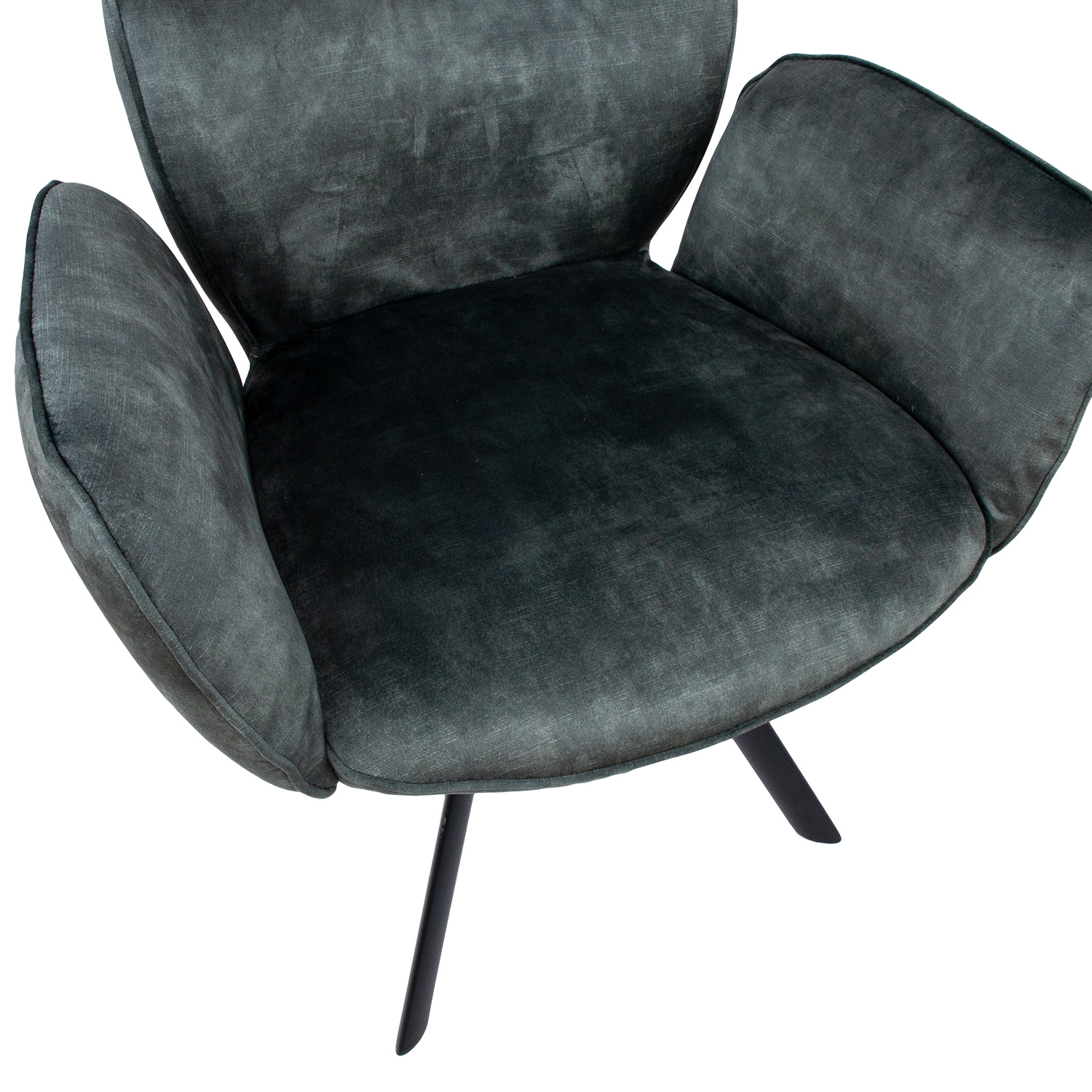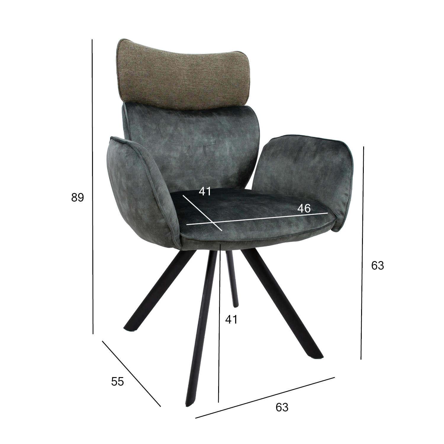 Įrankis EDDY su rankenomis 63x55xH89cm, žalias akmuo. Valgomojo kėdė su patogia sėdyne ir porankiais, lengvai minkšta ir aptraukta poliesterio audiniu. Naudojami tonas į toną, bet sijingos paviršiaus tekstūros aksominiai audiniai. Juodos spalvos milteliniu būdu dengtos metalinės kojos. Sėdimosios dalies aukštis 48 cm, sėdimosios dalies plotis 45 cm, sėdimosios dalies gylis 42 cm. Atlosho aukštis 47 cm. Porankių aukštis nuo žemės 64 cm. Ribinis svoris 120 kg.