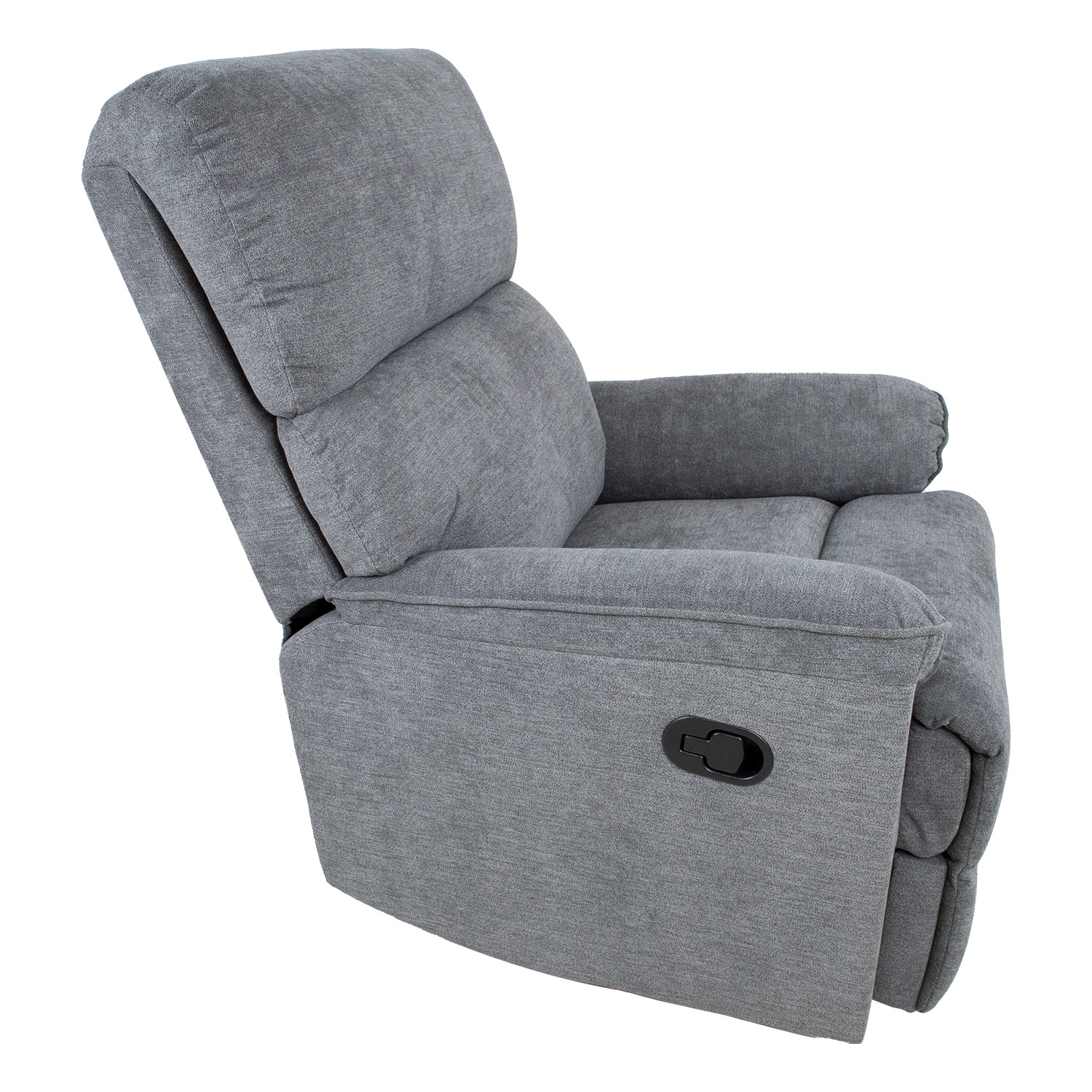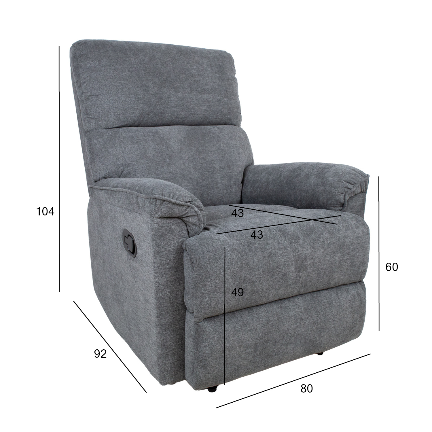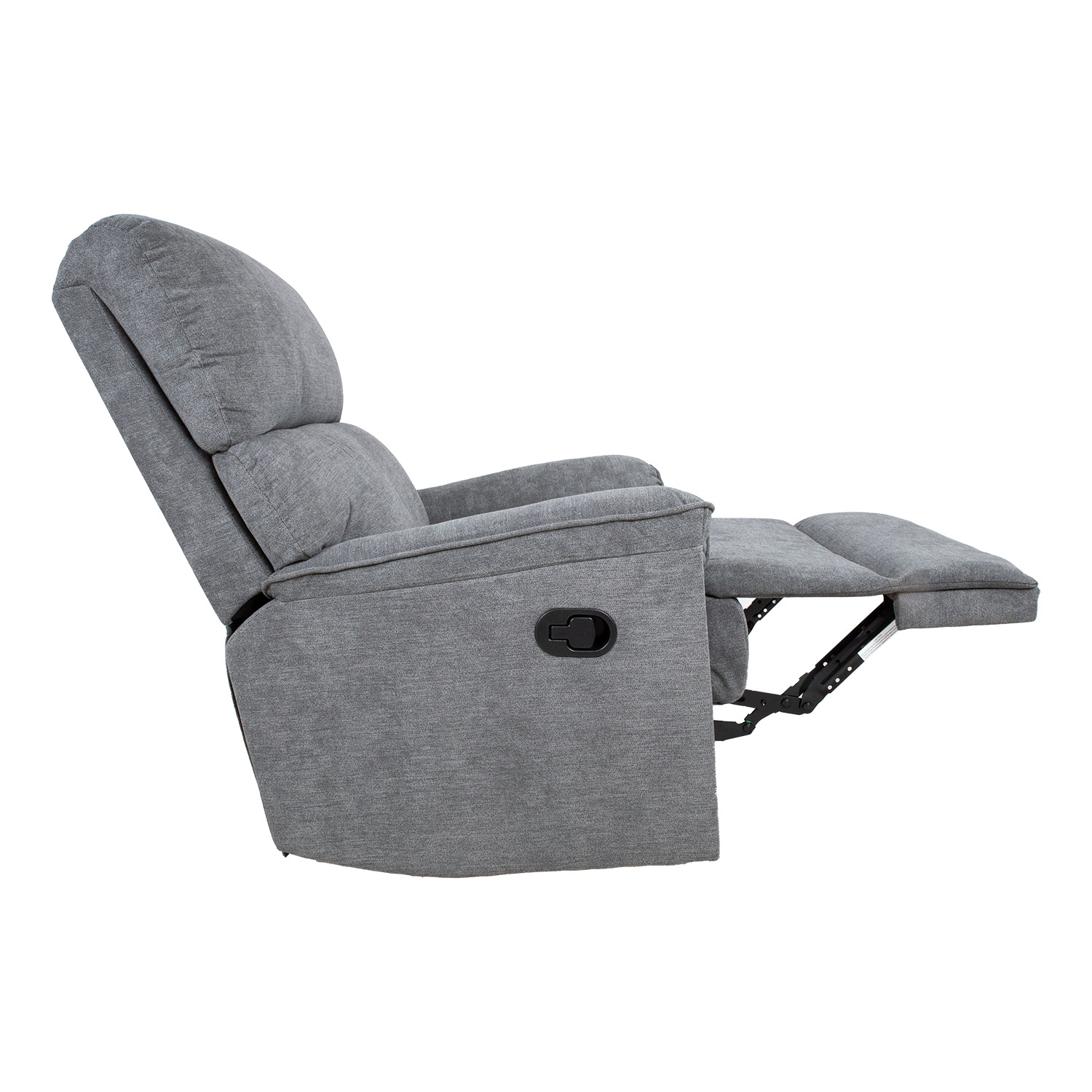 Fotelis GUSTAV manual recliner 80x92xH104cm, pilkos spalvos. Kėdė su rankiniu mechanizmu kojų atramos padėčiai keisti. Pakėlus kojų atlošą atlošas juda tolygiai. Norėdami pakelti kojų atramą, patraukite aukštyn svirtį, esančią sėdynės išorėje. Stumtelėjus kojų atramą žemyn, ji automatiškai užsifiksuoja pradinėje padėtyje. Užvalkalo medžiaga: 100 % poliesterio audinys, Martindale vertė nuo 10 000 iki 15 000. Rėmas: medis, metalas. Apmušalas: poliuretano putos 24 kg/m³. Bendrieji fotelio matmenys: 80x92xH104 cm. Sėdynės plotis 43 cm, sėdynės gylis 43 cm, sėdynės aukštis 49 cm. Atlošo aukštis 66 cm. Porankių aukštis nuo žemės 60 cm.