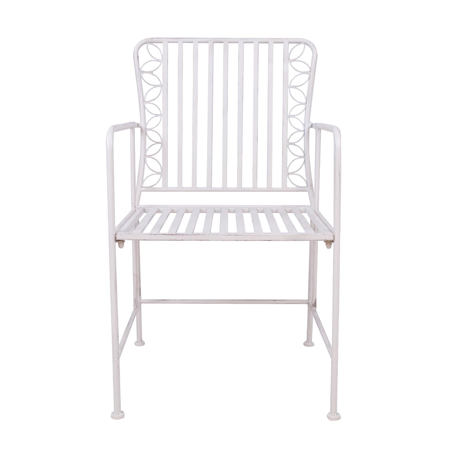Kėdė JASMINE 54x53xH92cm, antikvarinis baltas metalas. Sėdynės plotis 49 cm, gylis 42 cm, aukštis 44 cm. Porankio aukštis nuo žemės 68 cm. Ribinis svoris 100 kg. PRIEŽIŪRA IR PRIEŽIŪRA: metaliniai baldai praktiškai nereikalauja priežiūros, pakanka reguliariai valyti. Pasibaigus vasaros sezonui, rekomenduojame sodo baldus laikyti patalpoje. Dėl vasaros sezonui, reikėtų laikyti sode. Sandėliavimui naudokite sausą ir gerai vėdinamą patalpą.