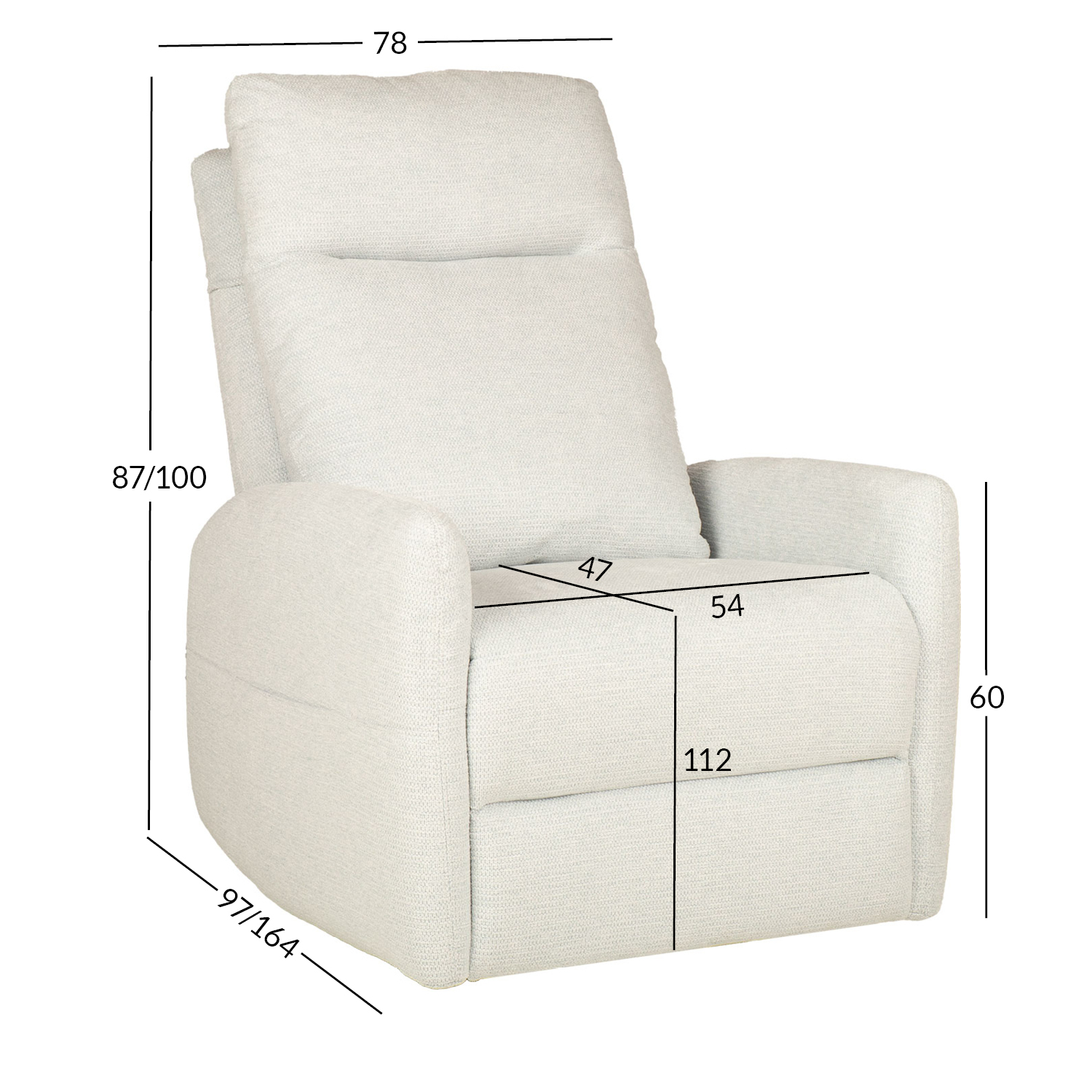 Fotelio matmenys: 78×97-164xH87-100 cm. Sėdimosios dalies plotis 54 cm, sėdimosios dalies gylis 47 cm, sėdimosios dalies aukštis 112 cm. Porankio aukštis nuo žemės 60 cm.