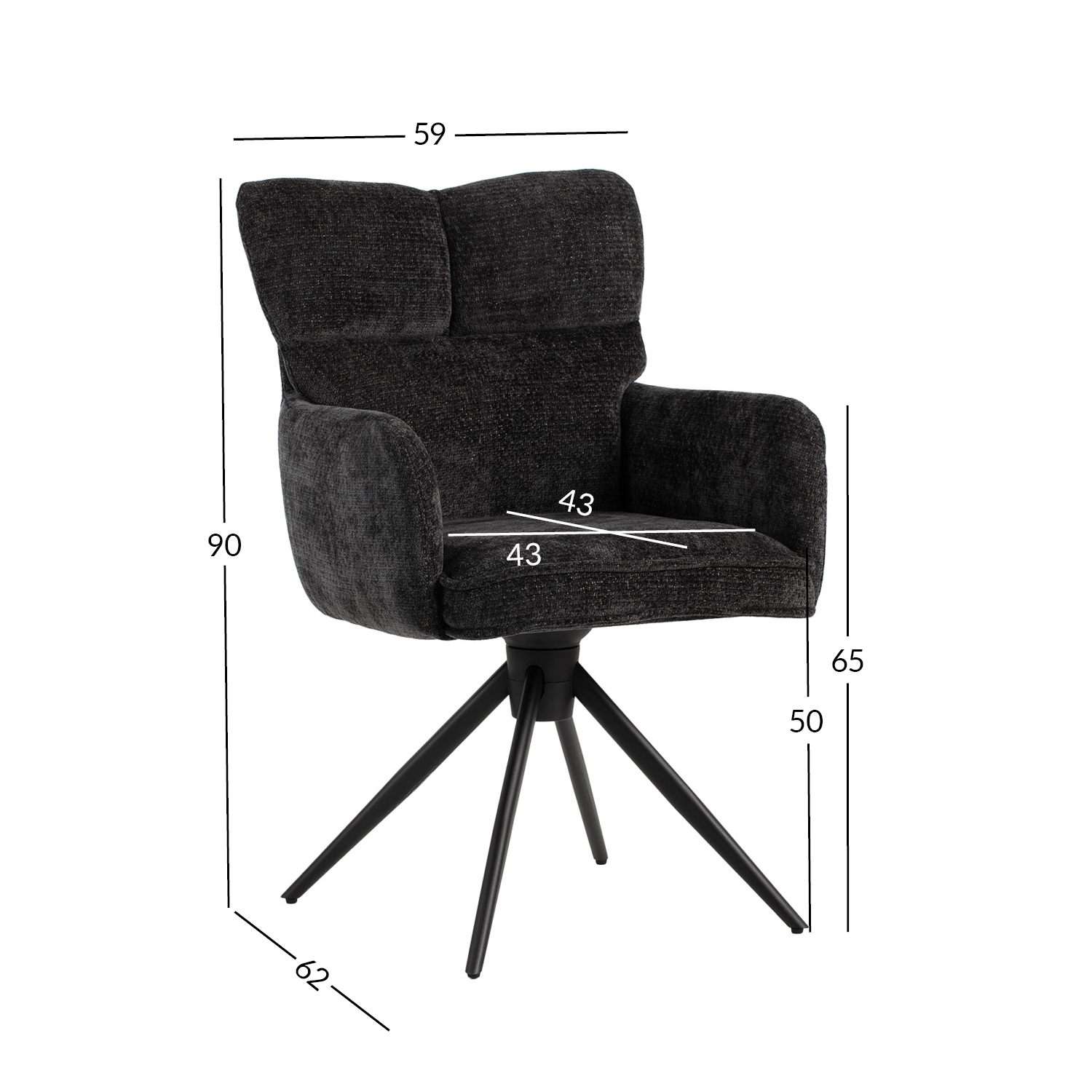 Bendrieji kėdės matmenys yra 58x60x95,5 cm. Sėdynės plotis 47 cm, gylis 44 cm, aukštis 50 cm. Porankių aukštis nuo žemės 65 cm.