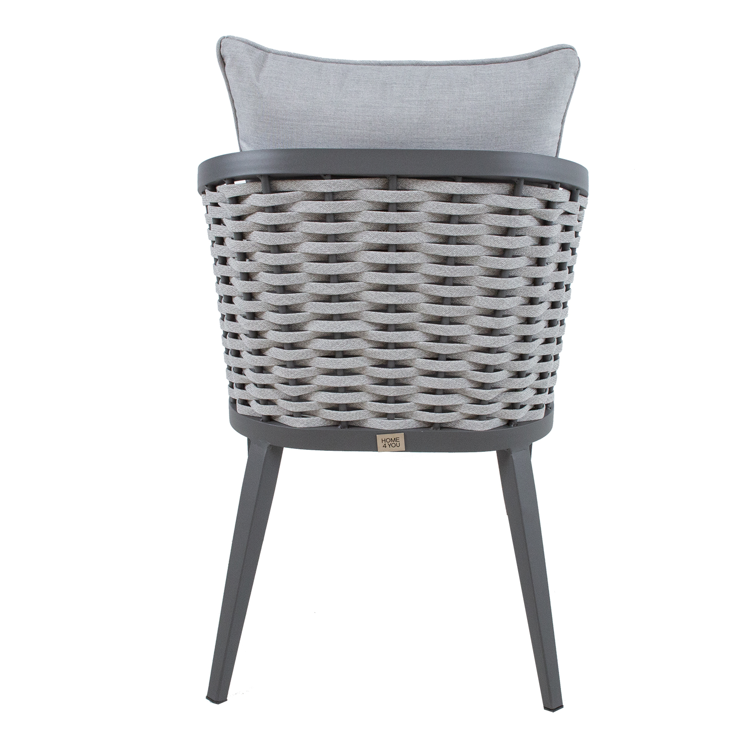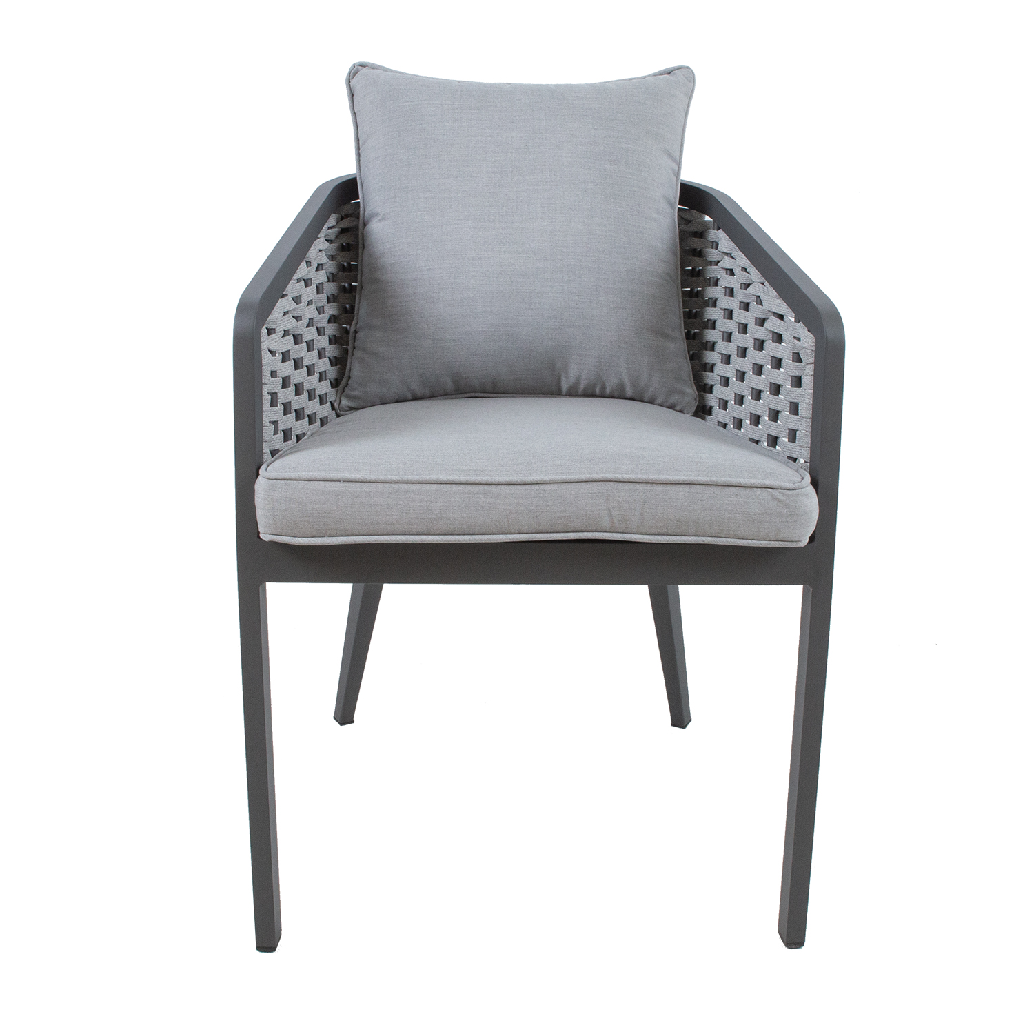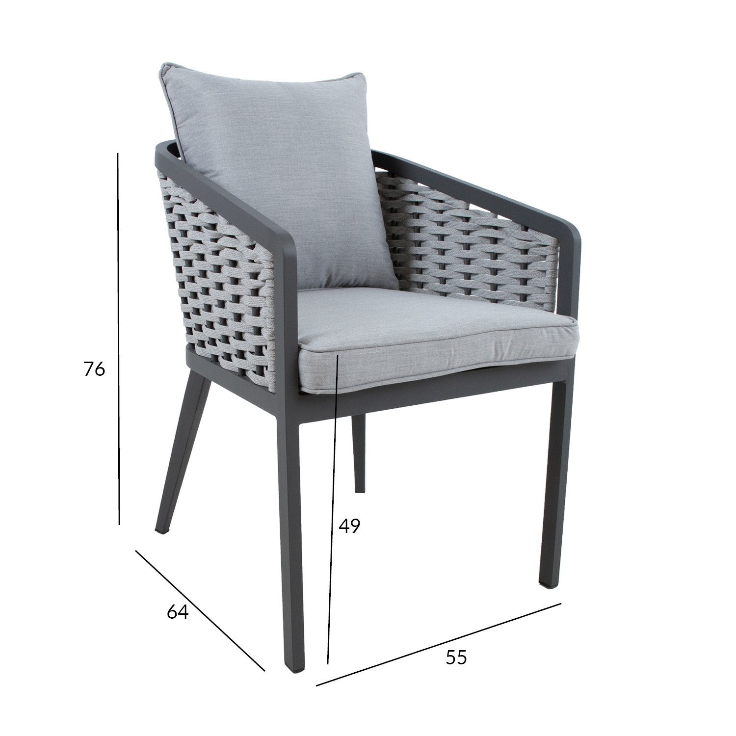 Įrankis MARIE 55x64xH76cm, pilkos spalvos. Kėdės kojos ir karkasas pagaminti iš aliuminio ir nudažyti pilka milteline danga. Atlošas aptrauktas šviesiai pilku virvės pynimu. Pridedamos patogios ir minkštos pagalvėlės. Pagalvėlės pagamintos iš šviesiai pilko olefino audinio. Ribinis svoris 100 kg. Gaminys labai atsparus besikeičiančioms oro sąlygoms ir lengvai prižiūrimas. Tik pagalvėles reikia apsaugoti nuo atmosferos poveikio. PRIEŽIŪRA: pasibaigus vasaros sezonui, rekomenduojame sodo baldus laikyti patalpoje. Pasibaigus vasaros sezonui, sodo baldus reikėtų laikyti sode. Sandėliavimui naudokite sausą ir gerai vėdinamą patalpą.