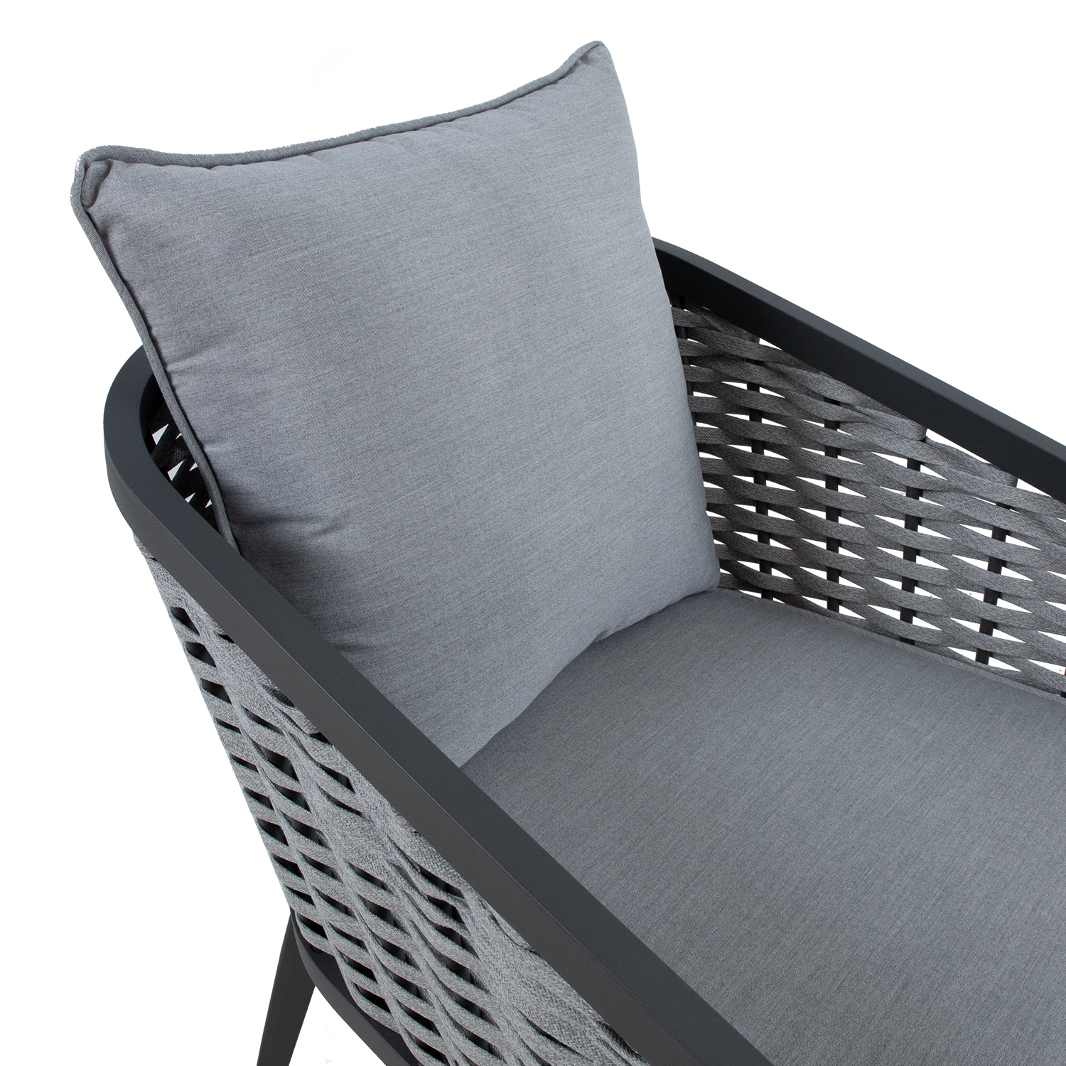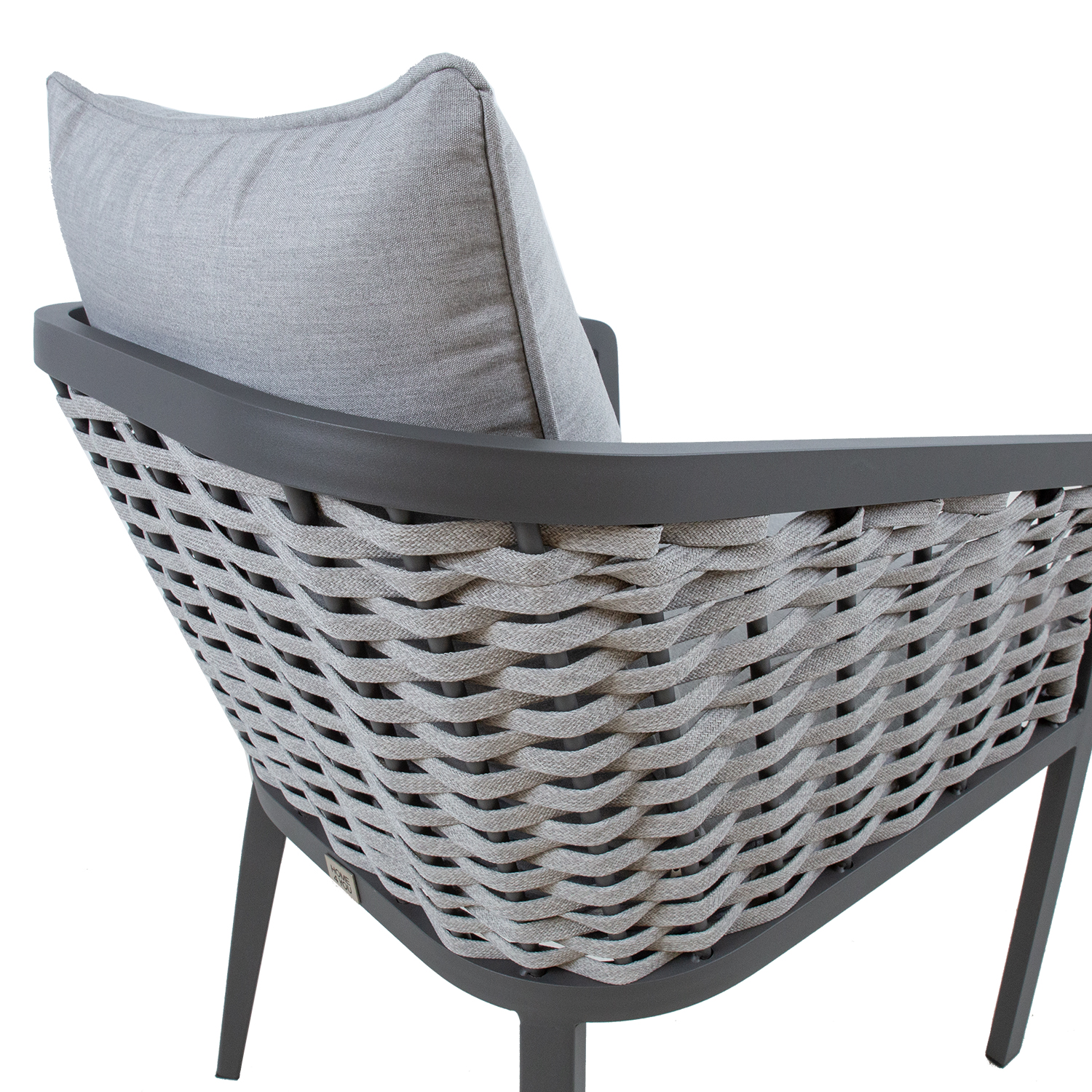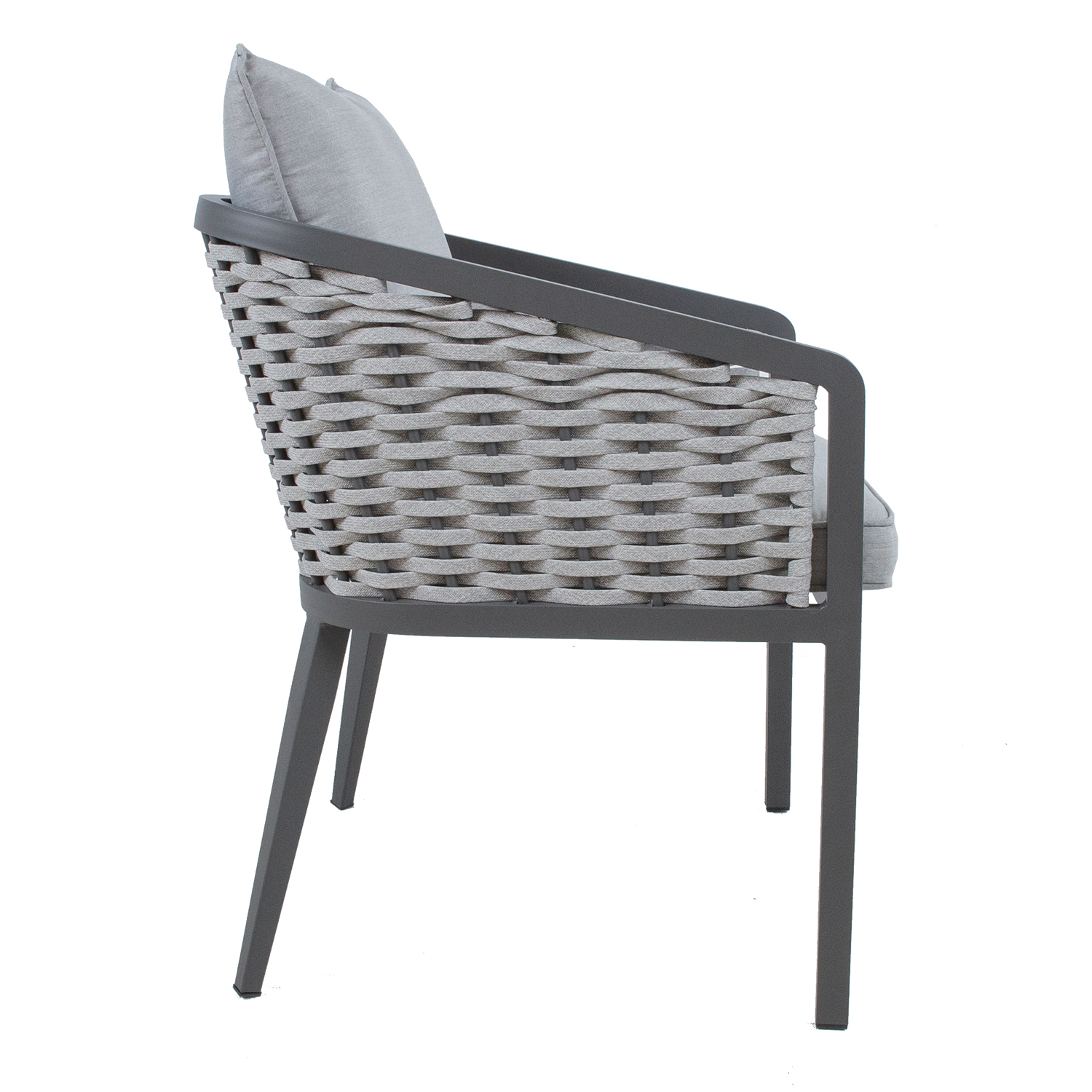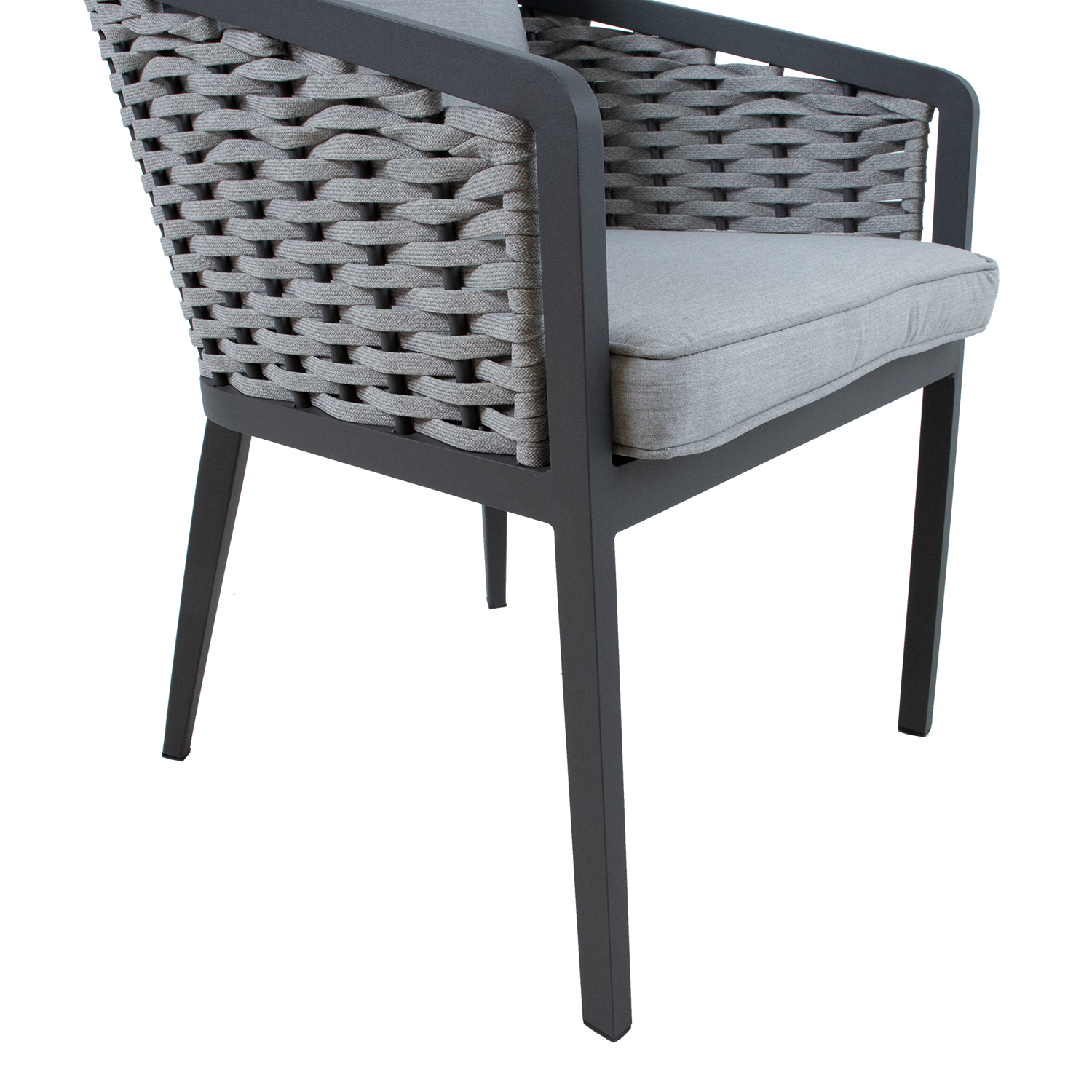 Įrankis MARIE 55x64xH76cm, pilkos spalvos. Kėdės kojos ir karkasas pagaminti iš aliuminio ir nudažyti pilka milteline danga. Atlošas aptrauktas šviesiai pilku virvės pynimu. Pridedamos patogios ir minkštos pagalvėlės. Pagalvėlės pagamintos iš šviesiai pilko olefino audinio. Ribinis svoris 100 kg. Gaminys labai atsparus besikeičiančioms oro sąlygoms ir lengvai prižiūrimas. Tik pagalvėles reikia apsaugoti nuo atmosferos poveikio. PRIEŽIŪRA: pasibaigus vasaros sezonui, rekomenduojame sodo baldus laikyti patalpoje. Pasibaigus vasaros sezonui, sodo baldus reikėtų laikyti sode. Sandėliavimui naudokite sausą ir gerai vėdinamą patalpą.