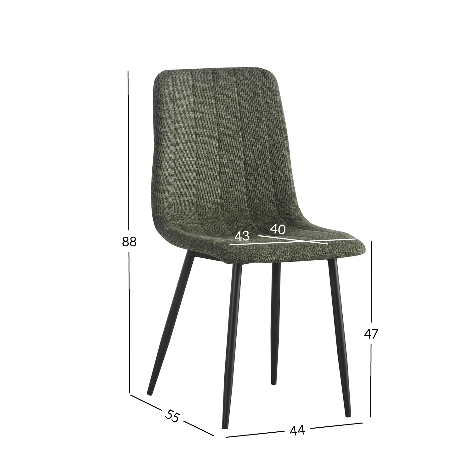 Bendrieji kėdės matmenys: 44x55xH88 cm. Sėdynės plotis 43 cm, sėdynės gylis 40 cm, sėdynės aukštis 47 cm.