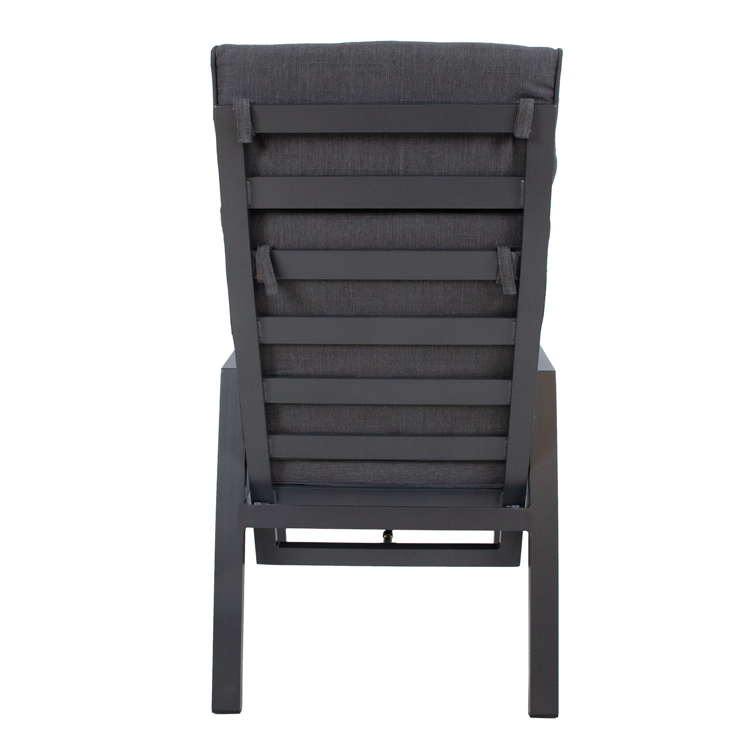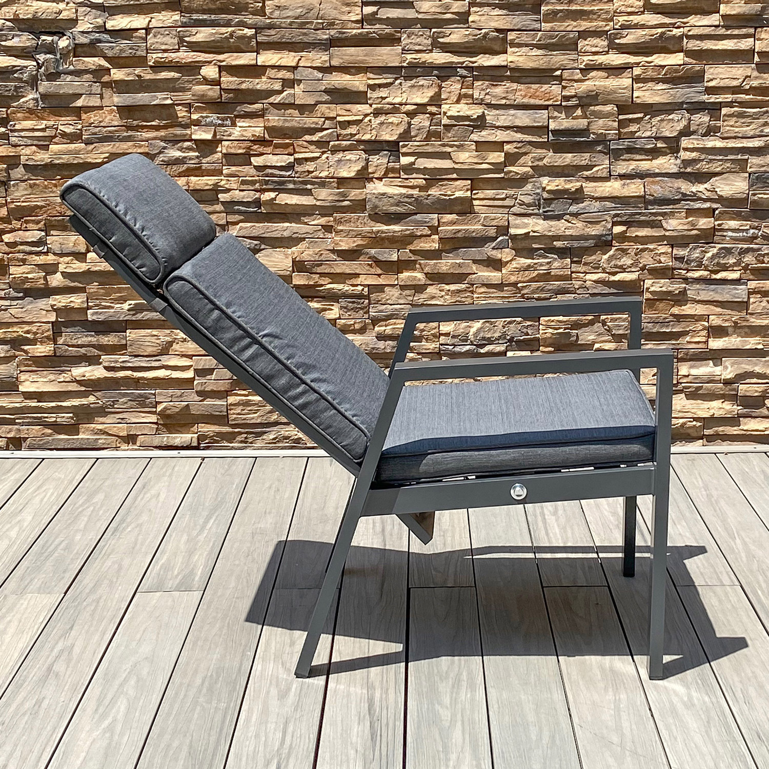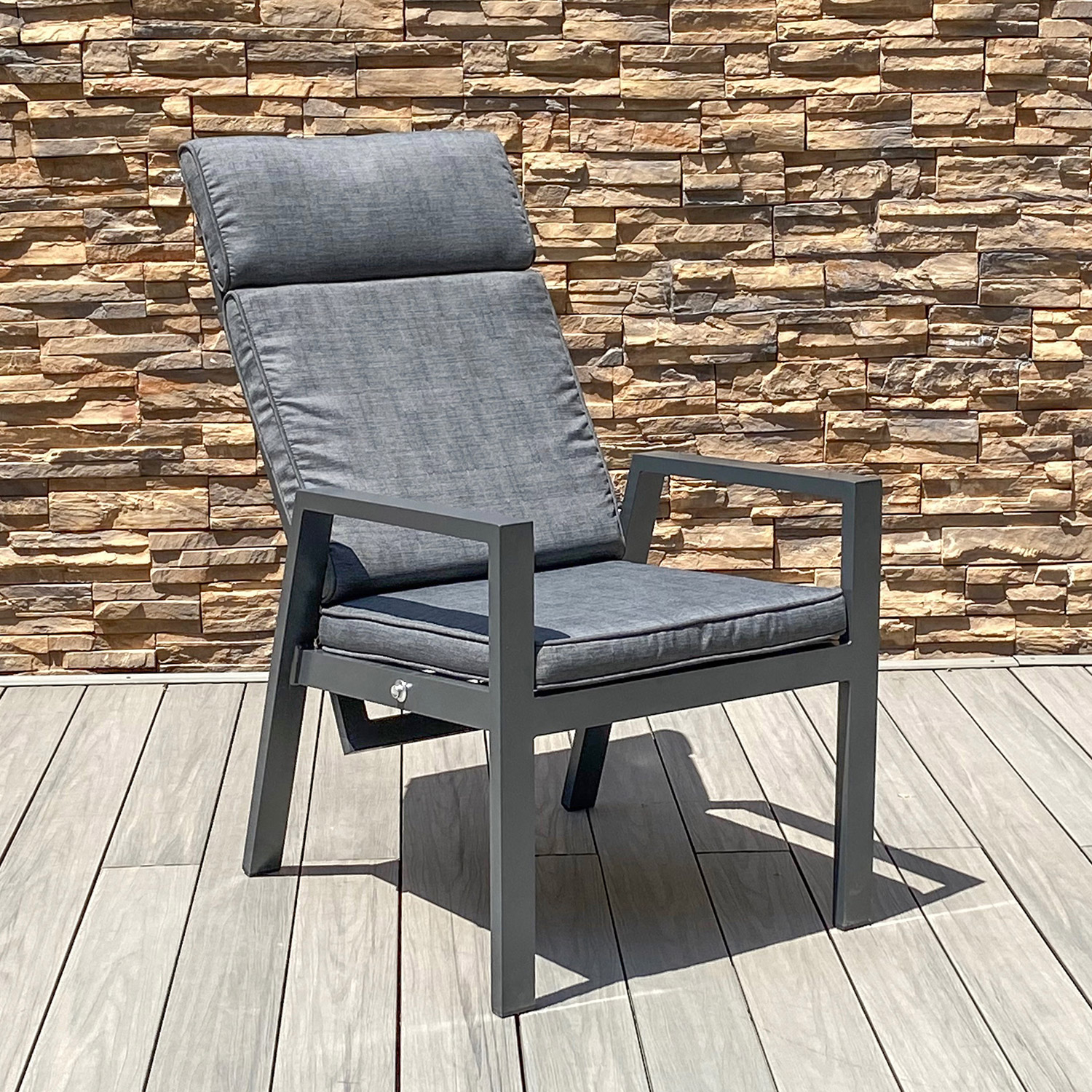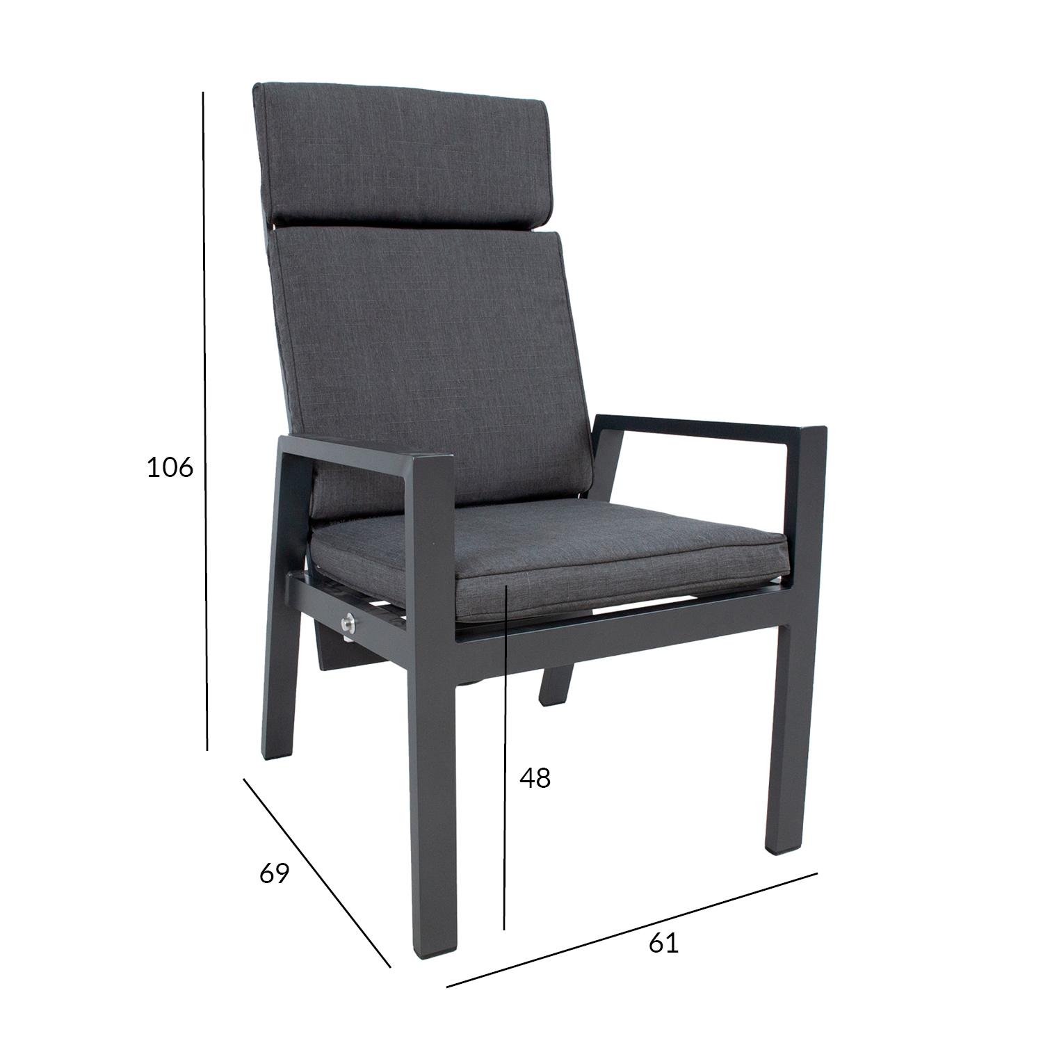 Kėdė TOMSON su reguliuojamu atlošu 61x69xH106cm, tamsiai pilka. Kėdės rėmas pagamintas iš aliuminio ir padengtas tamsiai pilka milteline danga. Kėdės atlošas reguliuojamas dujine virvele. Reguliavimo rankenėlė yra dešinėje kėdės sėdynės pusėje. Į komplektą įeina sėdynės pagalvėlė. Sėdynės pagalvėlės matmenys 122x51xH6 cm. Pagalvėlės užvalkalas pagamintas iš pilko olefino audinio. Pagalvėlės užvalkalą galima nuimti ir skalbti. Kėdės sėdimosios dalies plotis – 50 cm, sėdimosios dalies gylis – 48 cm, sėdimosios dalies aukštis – 40,5/46,5 cm. Porankio aukštis nuo žemės 61 cm. Ribinis svoris 120 kg. Gaminys labai patvarus kintamomis oro sąlygomis, jį lengva prižiūrėti. Tik pagalvėles reikia apsaugoti nuo atmosferos poveikio. PRIEŽIŪRA: pasibaigus vasaros sezonui, rekomenduojame sodo baldus laikyti patalpoje. Jeigu vasaros sezonui, sodo baldus reikėtų laikyti namuose. Prieš laikydami baldus išvalykite ir išdžiovinkite. Sandėliavimui naudokite sausą ir gerai vėdinamą patalpą.