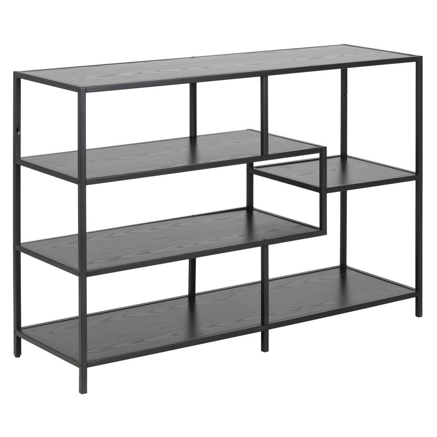 Lentyna SEAFORD 114x35xH78cm. Ši visiškai juoda knygų lentyna – tai skirtingų paviršių derinys. Juodos salos išvaizdos lentynos sumontuotos su metaliniu rėmu. Taip lentyna lengvai priderinama prie bet kokių namų. Dėl asimetriško dizaino ji tampa dar patrauklesnė. Lentynos: juodas salos spalvos melaminas, rėmas: metalinis, juodas. PRIEŽIŪRA: paprastai melamino paviršiams nereikia daug priežiūros. Naudokite šluostę, ištrintą muiluotu vandeniu, ir sausai nuvalykite paviršių. Venkite naudoti šveitimo miltelius ar nailonines pirštines, nes jie balina arba braižo laminatą. Netrinkite paviršiaus kietais daiktais.
