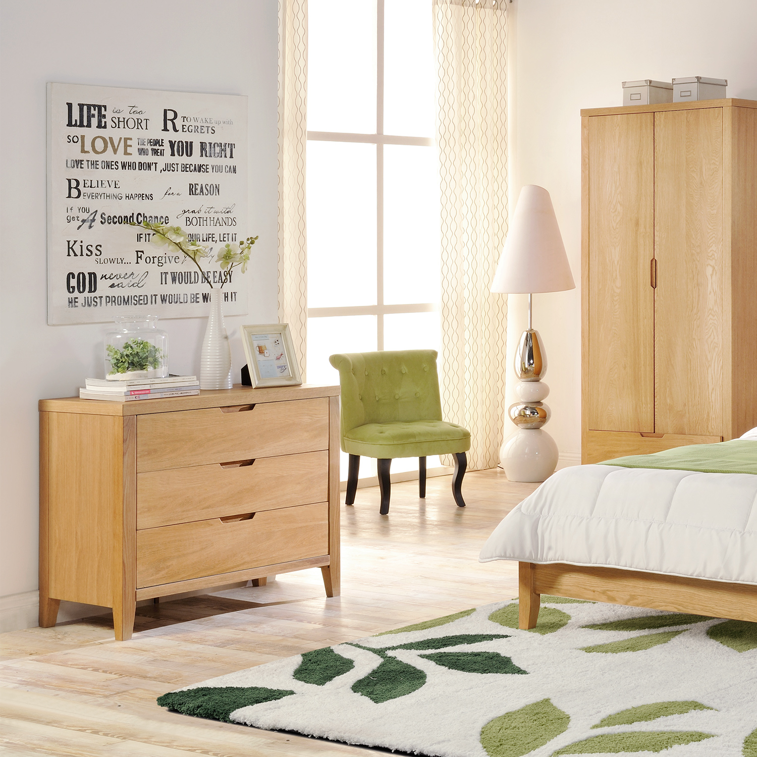 CHAMBA 3 stalčių 90x45xH75cm. Rėmas pagamintas iš medžio masyvo. Viršutinė plokštė: 19 mm MDF, šoninės plokštės ir stalčių priekiai: baldinė plokštė. Spintelė dengta natūralia ąžuolo fanera. Stalčiai turi metalinius bėgelius.