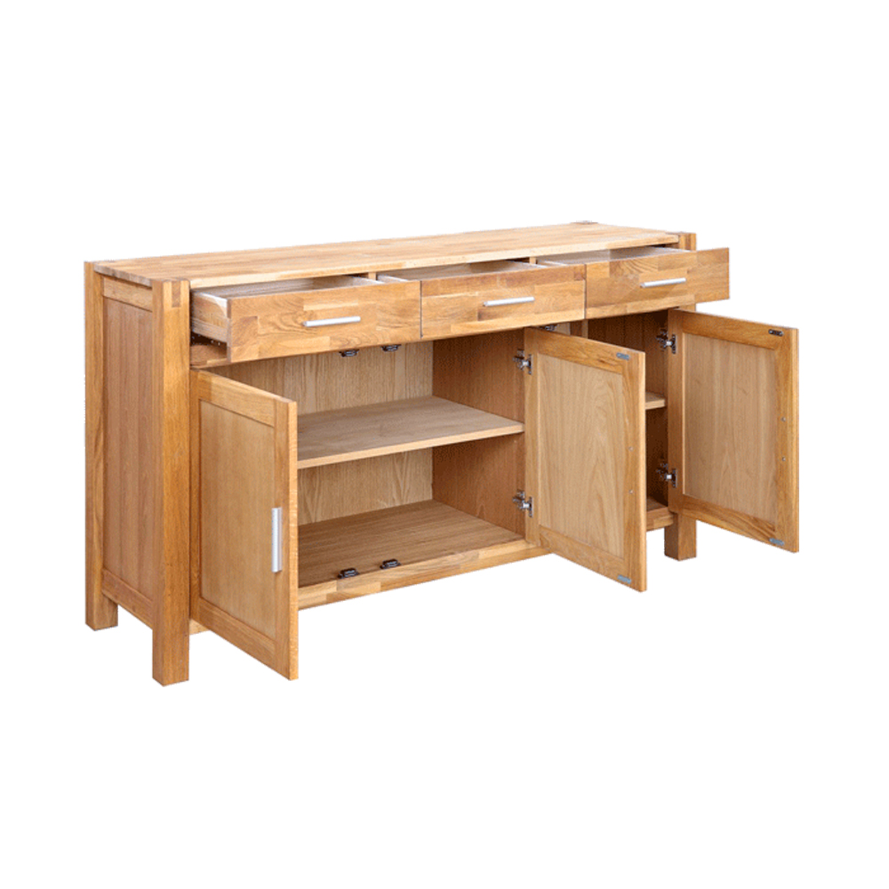 CHICAGO NEW 140x44xH86cm, ąžuolas. Korpusas pagamintas iš medžio masyvo. Viršutinė plokštė: 19 mm MDF, šoninės plokštės ir stalčių priekiai: baldinė plokštė. Spintelė dengta natūralia ąžuolo fanera. Spintelėje yra 3 stalčiai ir 3 durelės. Spintelės viduje yra viena lentyna. Durelės ir stalčiai turi sidabrines aliuminio rankenėles.