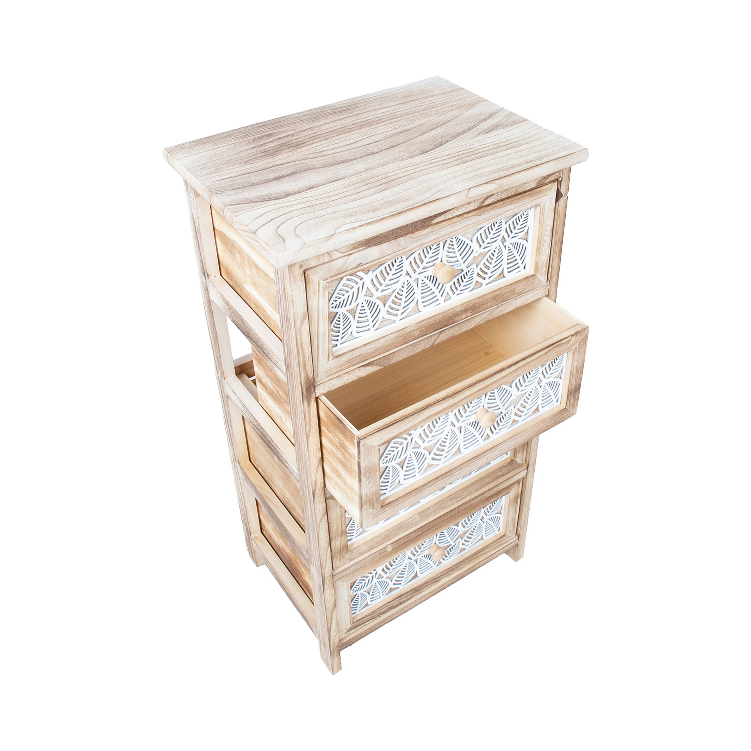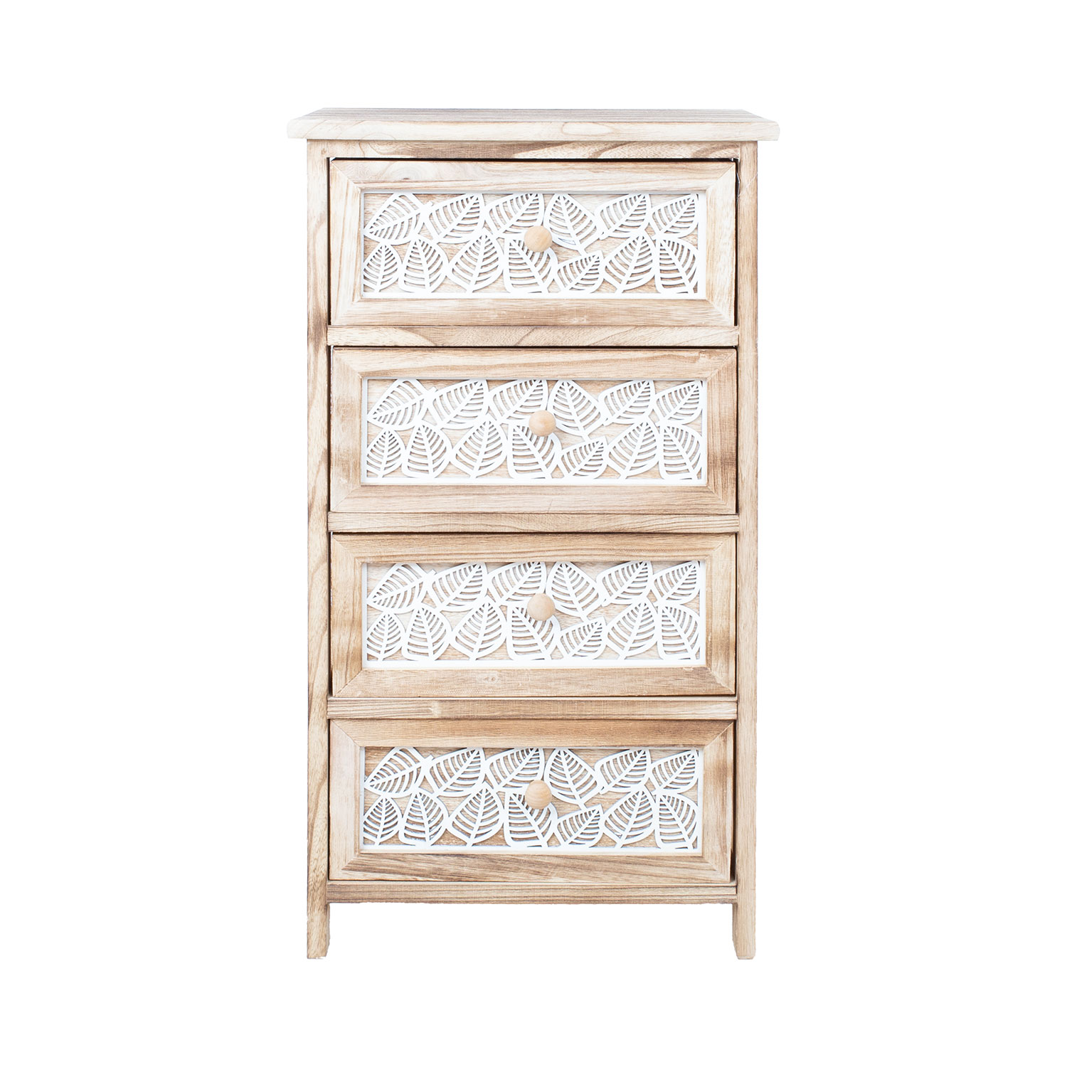 Stalčių priekinės panelės dekoruotos baltų lapų motyvais.