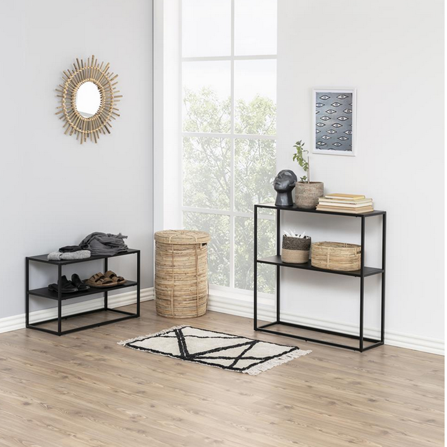 Įneškite į savo namus pramoninio stiliaus įspūdį, naudodami metalinį konsolinį staliuką. Milteliais dengtas metalas suteikia kambariui šiuolaikiškumo, o dėl elegantiško dizaino jis tinka bet kur. Naudokite konsolinį staliuką ne tik kaip šaunų būdą erdvei padidinti, bet ir kaip papildomą daiktadėžę. Medžiaga: matinis juodas milteliniu būdu dengtas plienas. Matmenys: 79,5x26xH80,5 cm.
