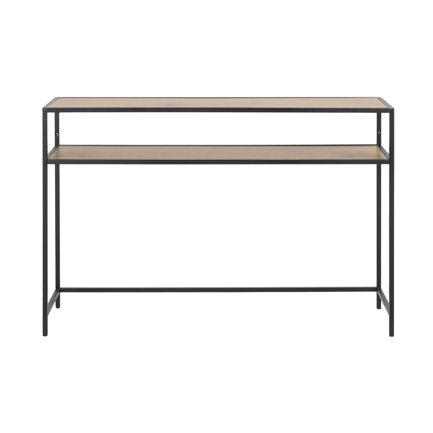 Konsolinis staliukas SEAFORD 120x35xH79cm. Naudodami šį universalų konsolinį staliuką išnaudokite savo erdvę maksimaliai. Tinka tiek svetainei, tiek kambariui. Ant lentynos galite padėti daiktus, kuriuos reikia laikyti po ranka. Juodais milteliais dengtas metalinis rėmas suteikia staliukui pramoninį įspūdį ir užtikrina stabilumą. Stalviršis: laminuota baldinė plokštė, spalva: ąžuolas. Rėmas: metalas, spalva: juoda. PRIEŽIŪRA: Naudokite muiluotu vandeniu nusausintą šluostę ir sausai nuvalykite paviršių. Venkite naudoti šveitimo miltelius ar nailonines pirštines, nes jie gali išbalinti arba subraižyti medžiagą. Netrinkite paviršiaus kietais daiktais.