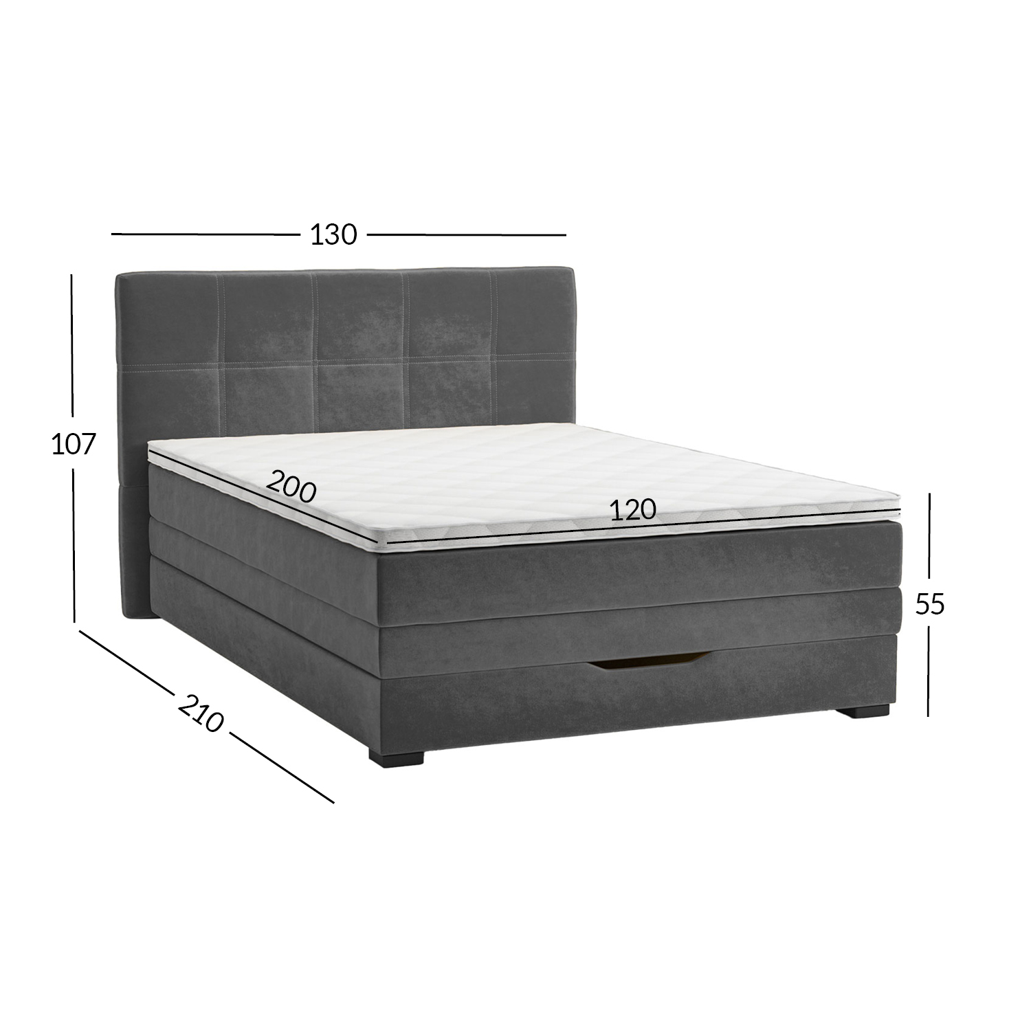 Bendrieji lovos matmenys yra 210x130xH55/107 cm.