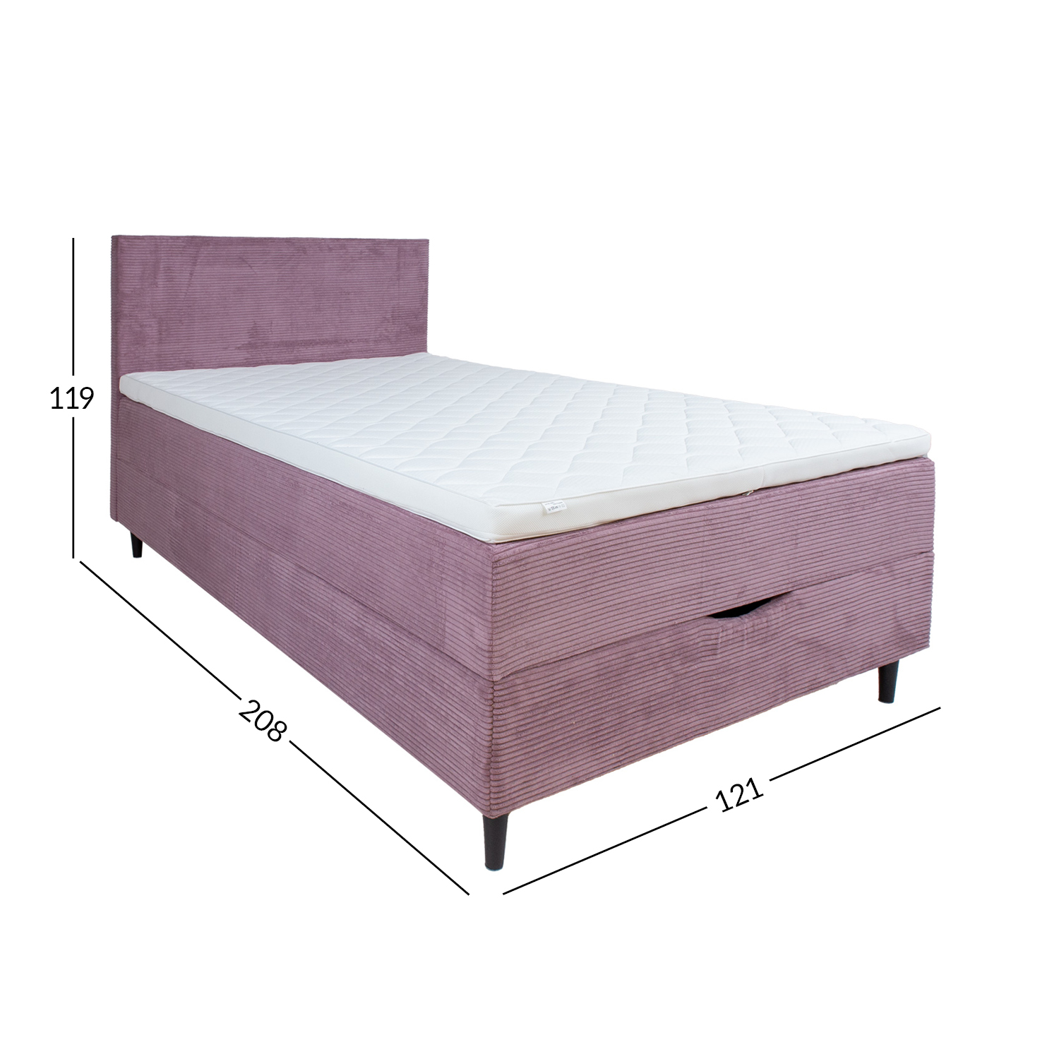 Lovos čiužinys pagamintas iš porolono ir yra 7 cm storio. Po čiužiniu yra kišeninis spyruoklinis čiužinys. 210 spyruoklių/m2, spyruoklių aukštis 13 cm. Čiužinio standumas: vidutinis. Lovos rėmas pagamintas iš medžio, medžio drožlių plokštės ir medienos plaušų plokštės. Po lova yra erdvi daiktadėžė. Lovos kojos pagamintos iš medžio, 14 cm aukščio. Lovos galvūgalio plotis toks pat kaip lovos, 7 cm storio, 105 cm aukščio. Į komplektą įeina jungtys. Lovos aukštis nuo žemės yra 70 cm. Gaminio matmenys 121x208xH119 cm.