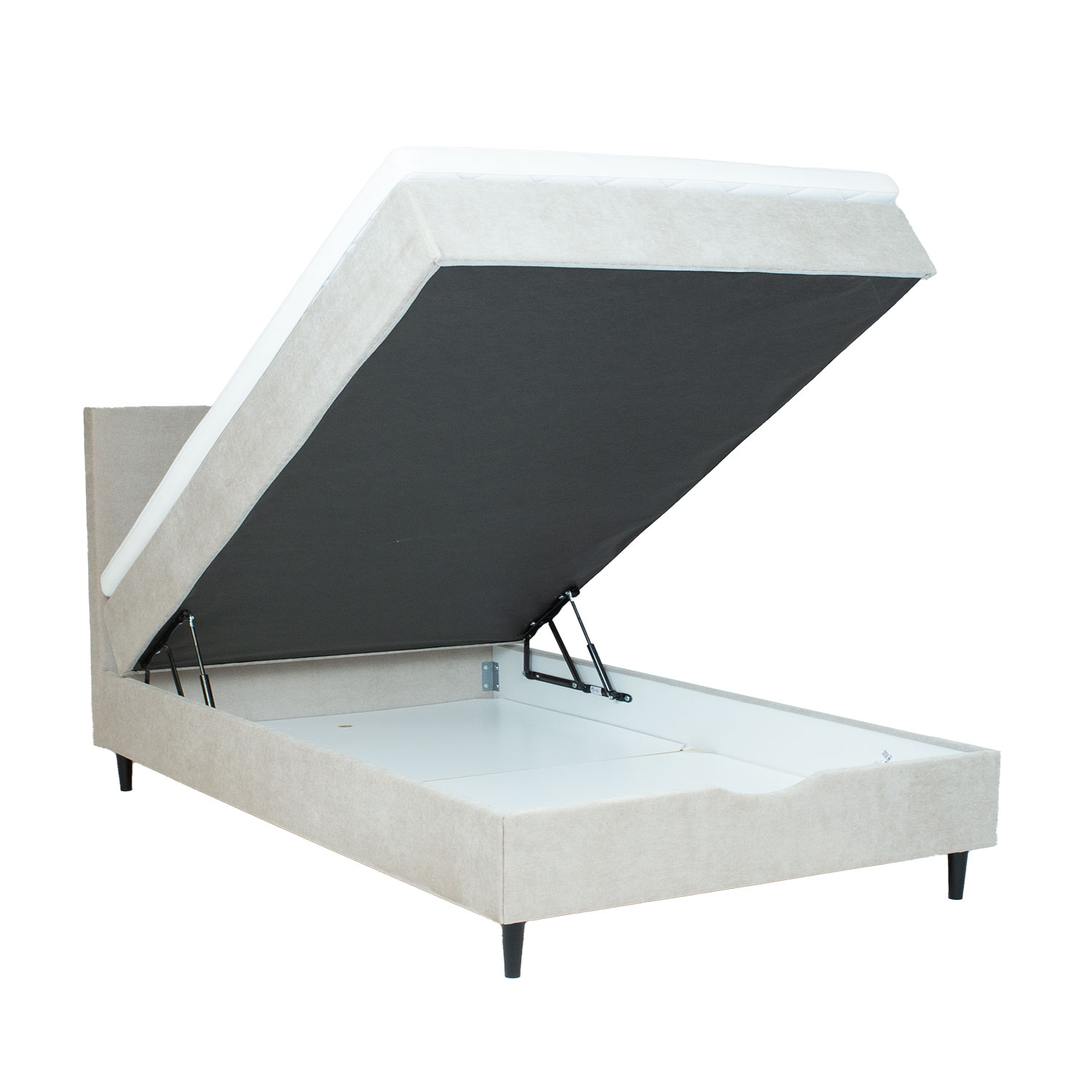 Lovos čiužinys pagamintas iš porolono ir yra 7 cm storio. Po čiužiniu yra kišeninis spyruoklinis čiužinys. 210 spyruoklių/m2, spyruoklių aukštis 13 cm. Čiužinio standumas: vidutinis. Lovos rėmas pagamintas iš medžio, medžio drožlių plokštės ir medienos plaušų plokštės. Po lova yra erdvi daiktadėžė. Lovos kojos pagamintos iš medžio, 14 cm aukščio. Lovos galvūgalio plotis toks pat kaip ir lovos, jis yra 7 cm storio, 105 cm aukščio. Į komplektą įeina jungtys. Lovos aukštis nuo žemės yra 70 cm. Gaminio matmenys 121x208xH119 cm.