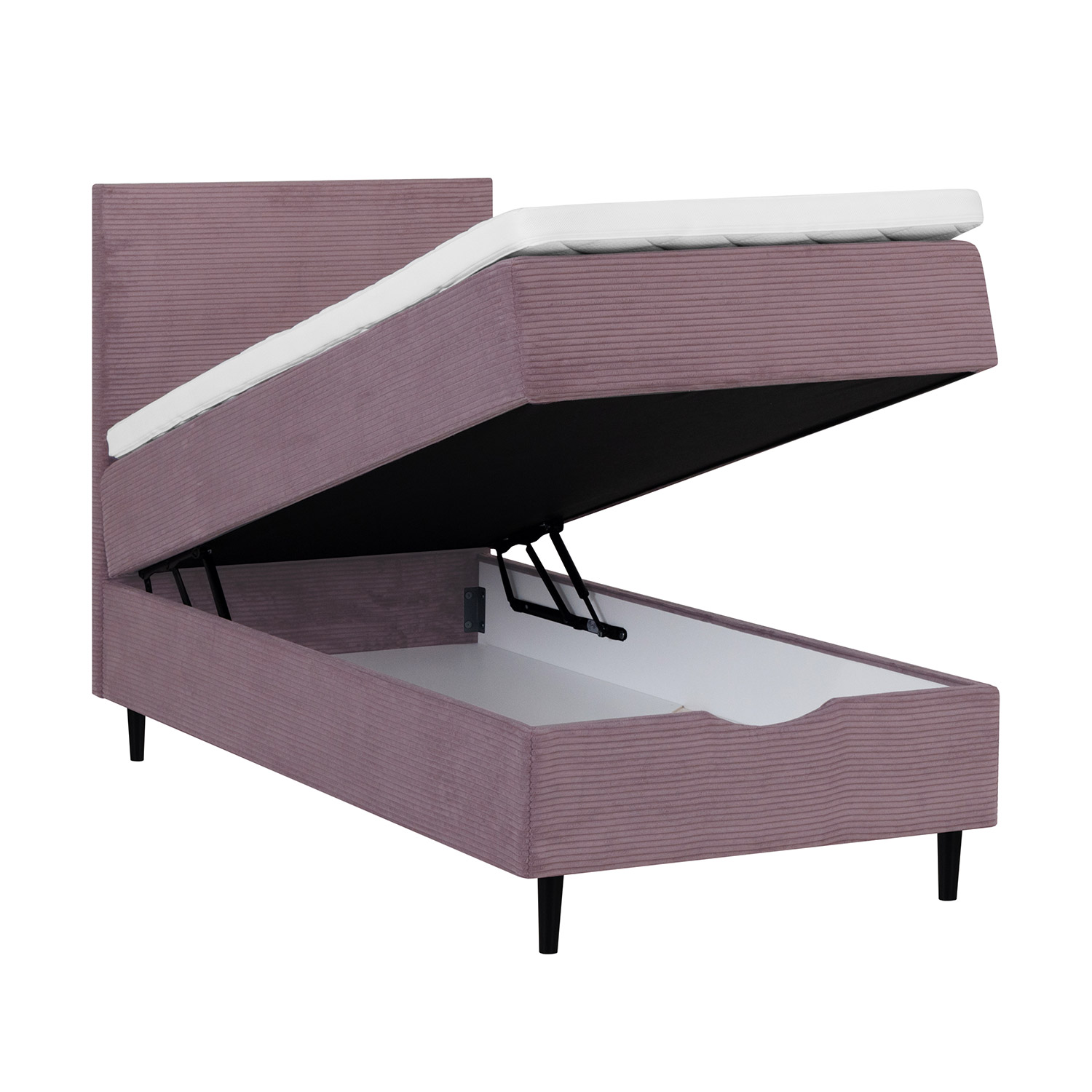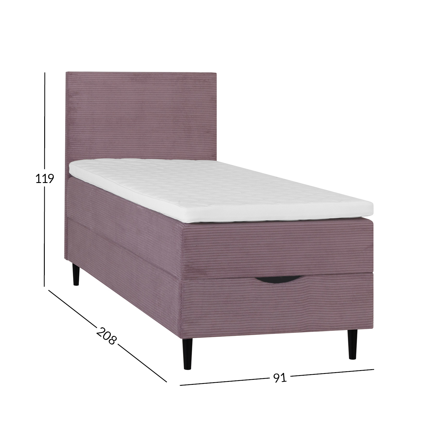 Lovos čiužinys pagamintas iš porolono ir yra 7 cm storio. Po čiužiniu yra kišeninis spyruoklinis čiužinys. 210 spyruoklių/m2, spyruoklių aukštis 13 cm. Čiužinio standumas: vidutinis. Lovos rėmas pagamintas iš medžio, medžio drožlių plokštės ir medienos plaušų plokštės. Po lova yra erdvi daiktadėžė. Lovos kojos pagamintos iš medžio, 14 cm aukščio. Lovos galvūgalio plotis toks pat kaip lovos, 7 cm storio, 105 cm aukščio. Į komplektą įeina jungtys. Lovos aukštis nuo žemės yra 70 cm. Gaminio matmenys 91x208xH119 cm.