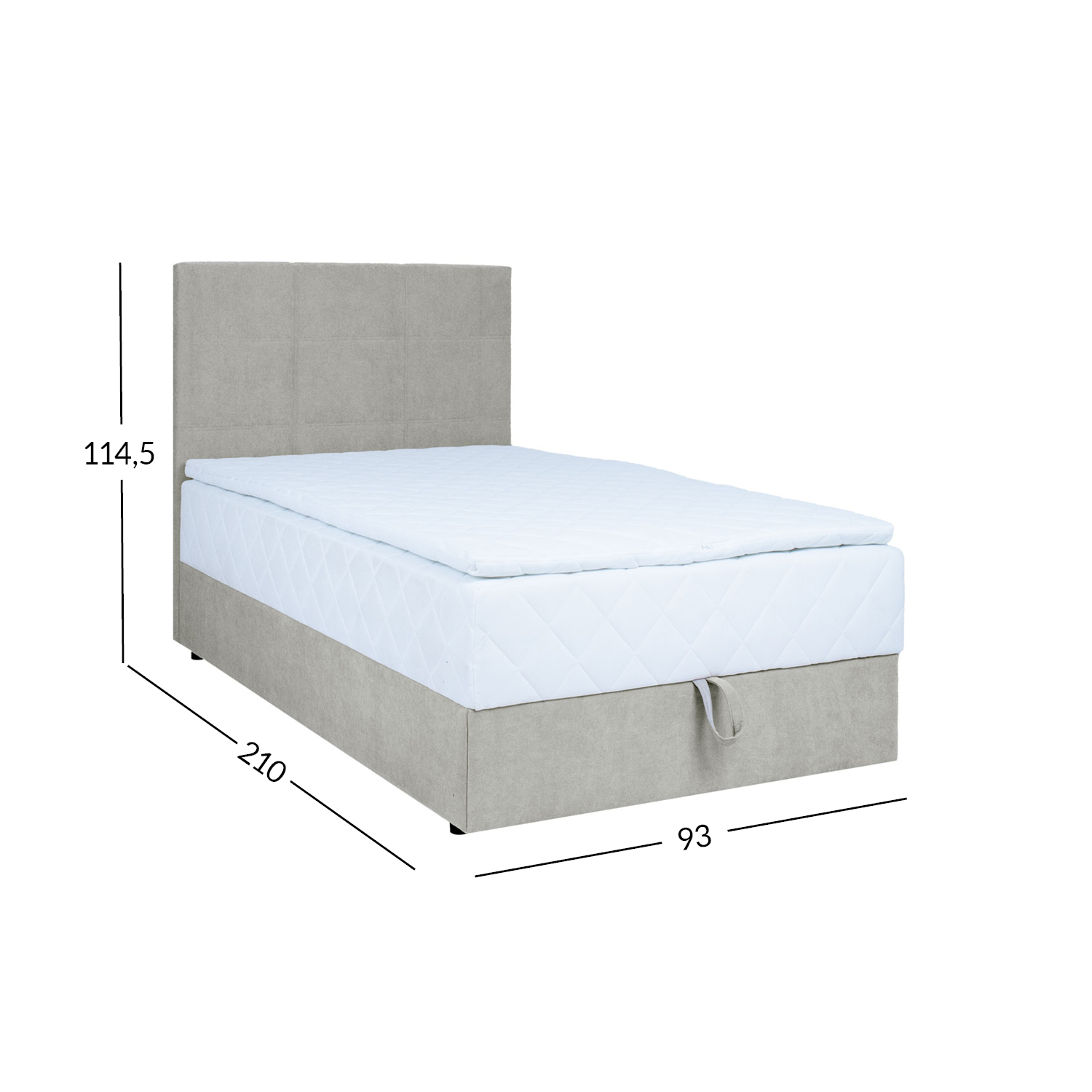 Lovoje yra kišeninis spyruoklinis čiužinys, 210 spyruoklių/m2. Spyruoklių aukštis – 13 cm. Spyruoklės padengtos 2 cm storio 23 kg/m3 porolono sluoksniu. Čiužinio standumas: standus. Čiužinio užvalkalas pagamintas iš 23 kg/m3 porolono. Čiužinys aptrauktas 200 g/m2 poliesterio satino užvalkalu. Po lova yra didelė daiktadėžė, pagaminta iš medžio masyvo ir laminuotos medžio drožlių plokštės. Jos šonai padengti porolonu. Lovos rėmas pagamintas iš medžio masyvo. Lovos rėmas aptrauktas audiniu. Į komplektą įeina tokio pat pločio kaip ir lova lovos galvūgalio stalviršis. Lovos galvūgalio storis – 7 cm. Komplekte yra jungtys galvūgaliui prie lovos pritvirtinti. Lova turi keturias plastikines juodos spalvos kojeles. Lovos kojelių aukštis – 2,5 cm, čiužinio užvalkalo aukštis – 4 cm, čiužinio aukštis – 16 cm. Lovos aukštis – 52 cm. Gaminio matmenys 93x210xH114,5 cm. Gaminys pagamintas ES.