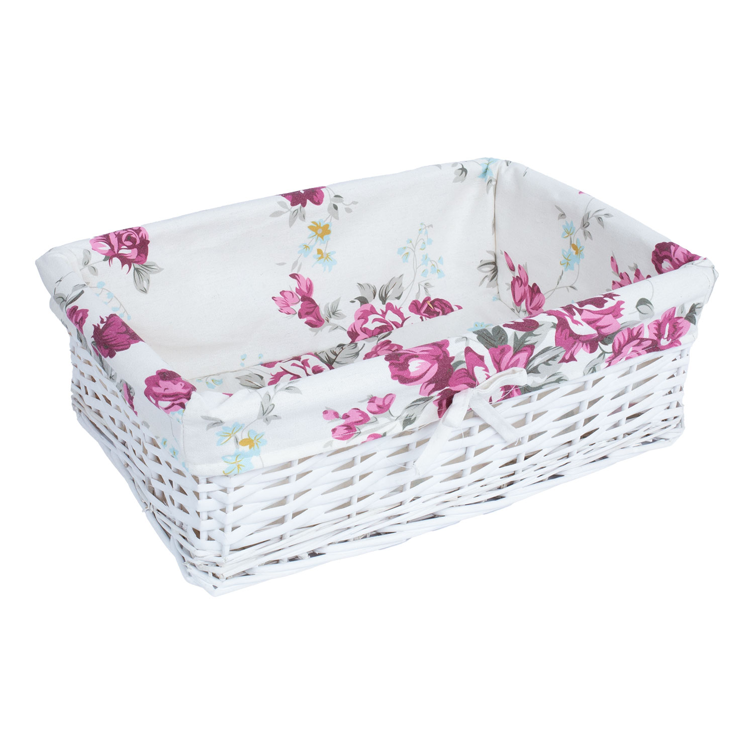 Krepšelio medžiaga: natūrali pintinė, dažyta baltai. Tekstilės pamušalas: medvilnė su gėlių raštu.