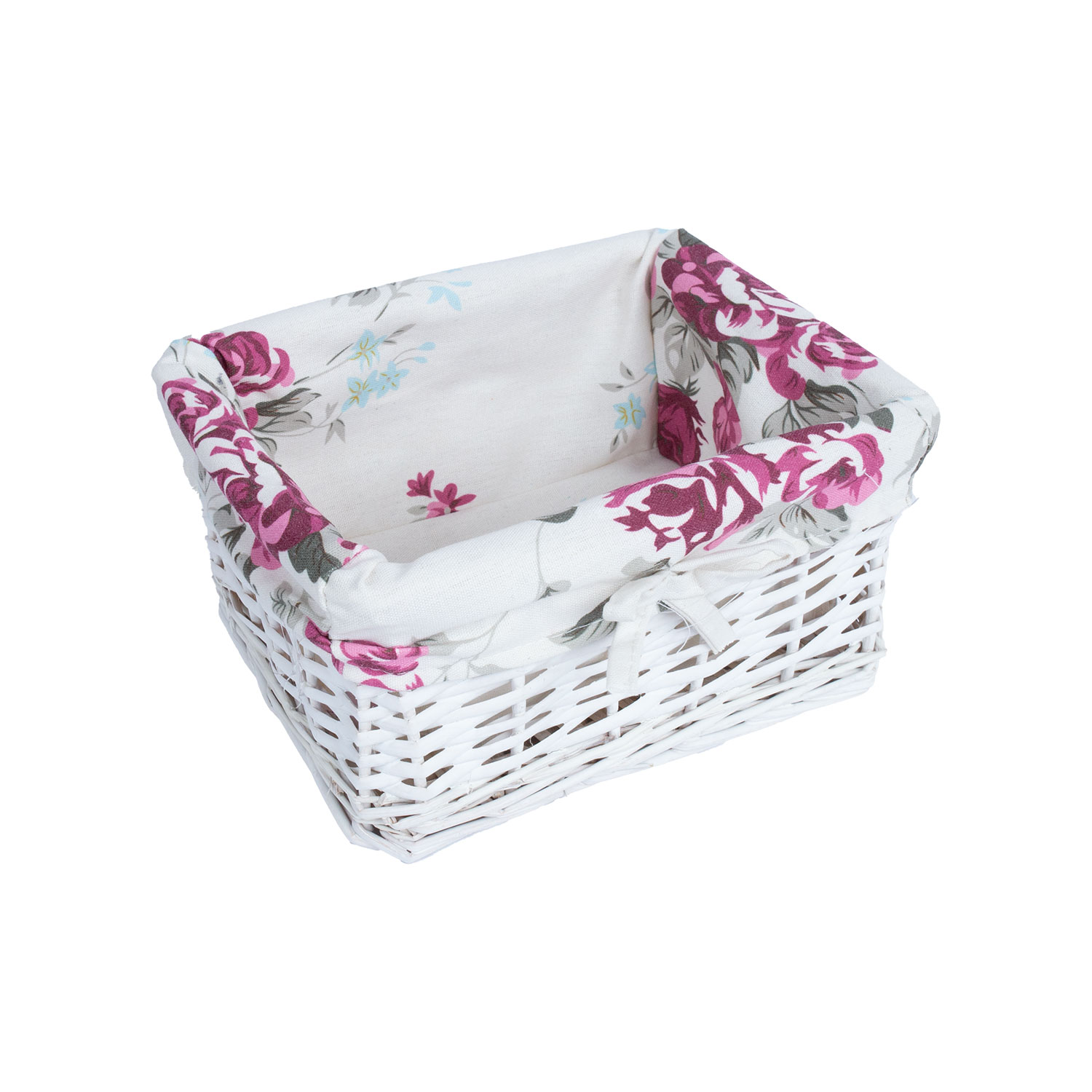 Krepšelio medžiaga: natūrali pintinė, dažyta baltai. Tekstilės pamušalas: medvilnė su gėlių raštu.