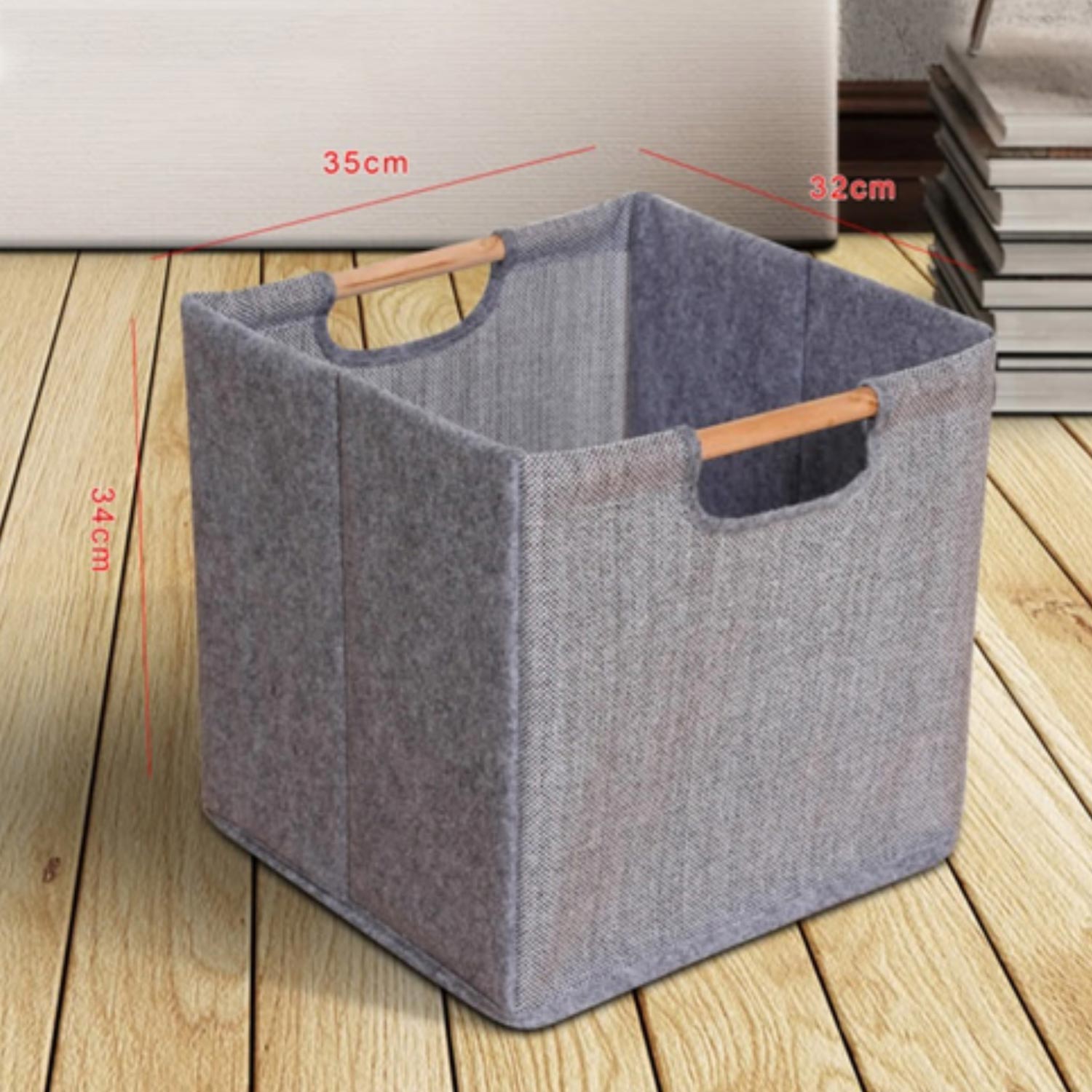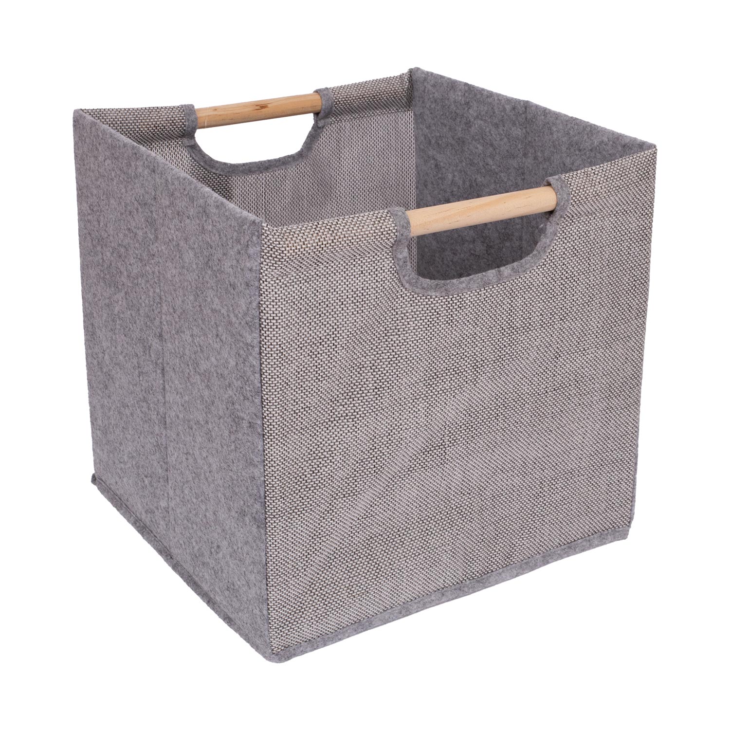 Sulankstomas krepšelis pagamintas iš šviesios spalvos veltinio ir tekstilės. Natūralaus medžio rankenos.