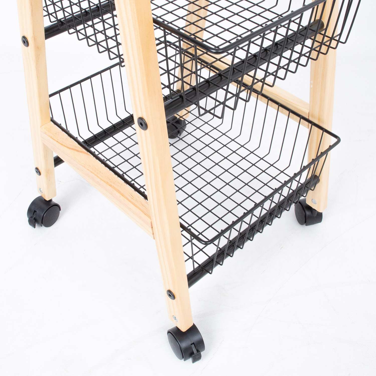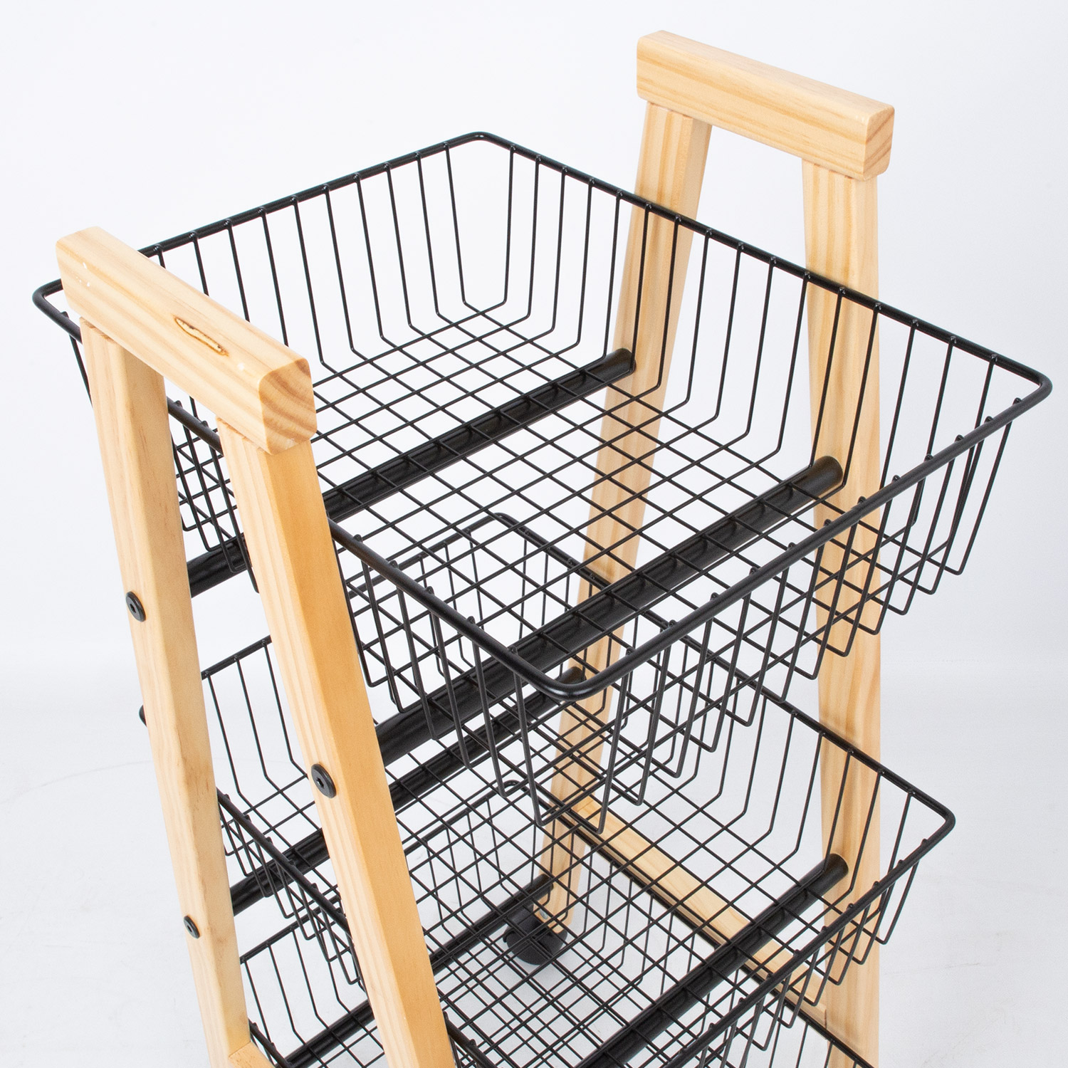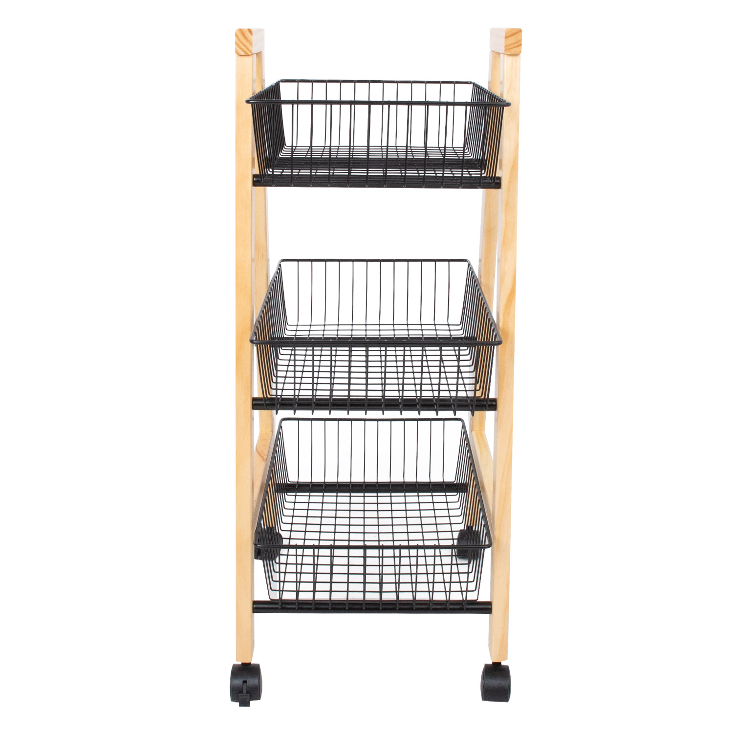 Lentyna BREN juoda, 32x37xH81cm. Funkcionali triguba lentyna, idealiai tinkanti daiktams laikyti sandėliuke, taip pat sandėliuke ar sandėliuke. Lentyna turi ratukus, todėl ją lengva perkelti. Gaminio rėmas pagamintas iš pušies masyvo ir yra natūralios spalvos. Trys plieniniai vieliniai krepšiai dažyti milteliniu būdu juoda spalva. Lentynos matmenys 32x37xH81 cm.