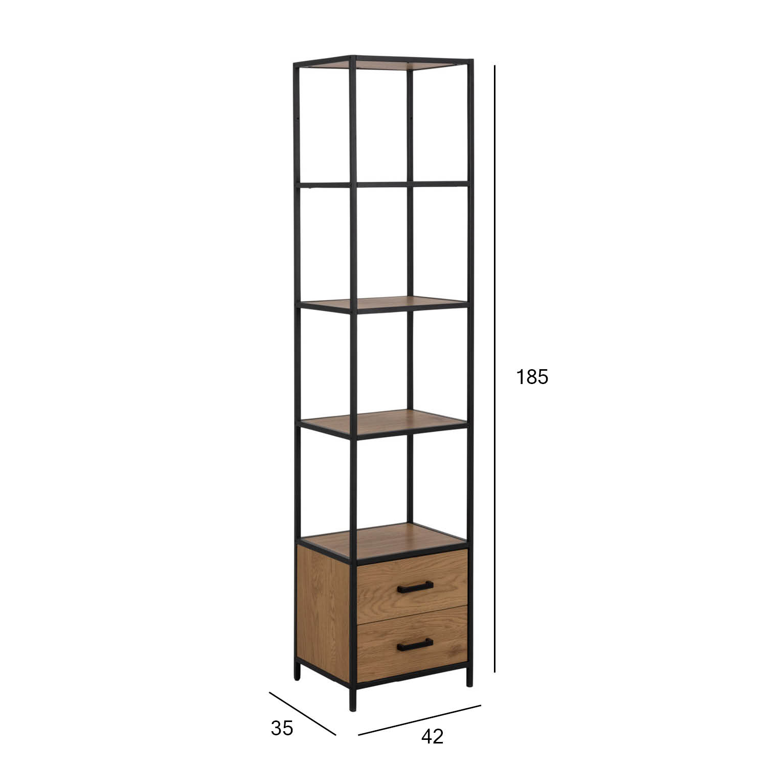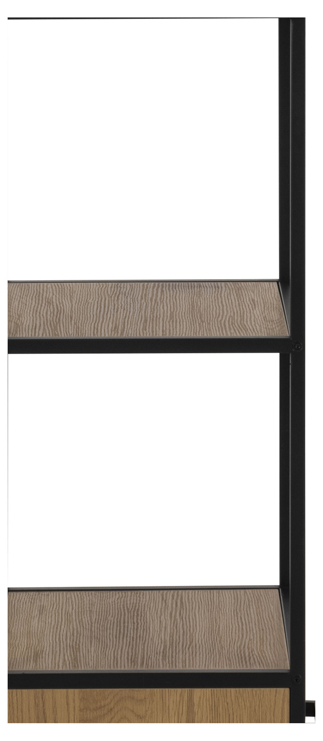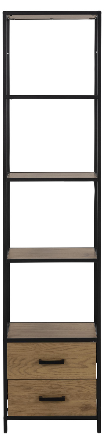 Moderni pramoninio stiliaus knygų spinta. 2 stalčiai ir 3 lentynos. Kontrastingas juodos spalvos milteliniu būdu dengtas metalinis rėmas. Laukinio ąžuolo išvaizda sukuria šiltą ir jaukią atmosferą. Lengva prižiūrėti.