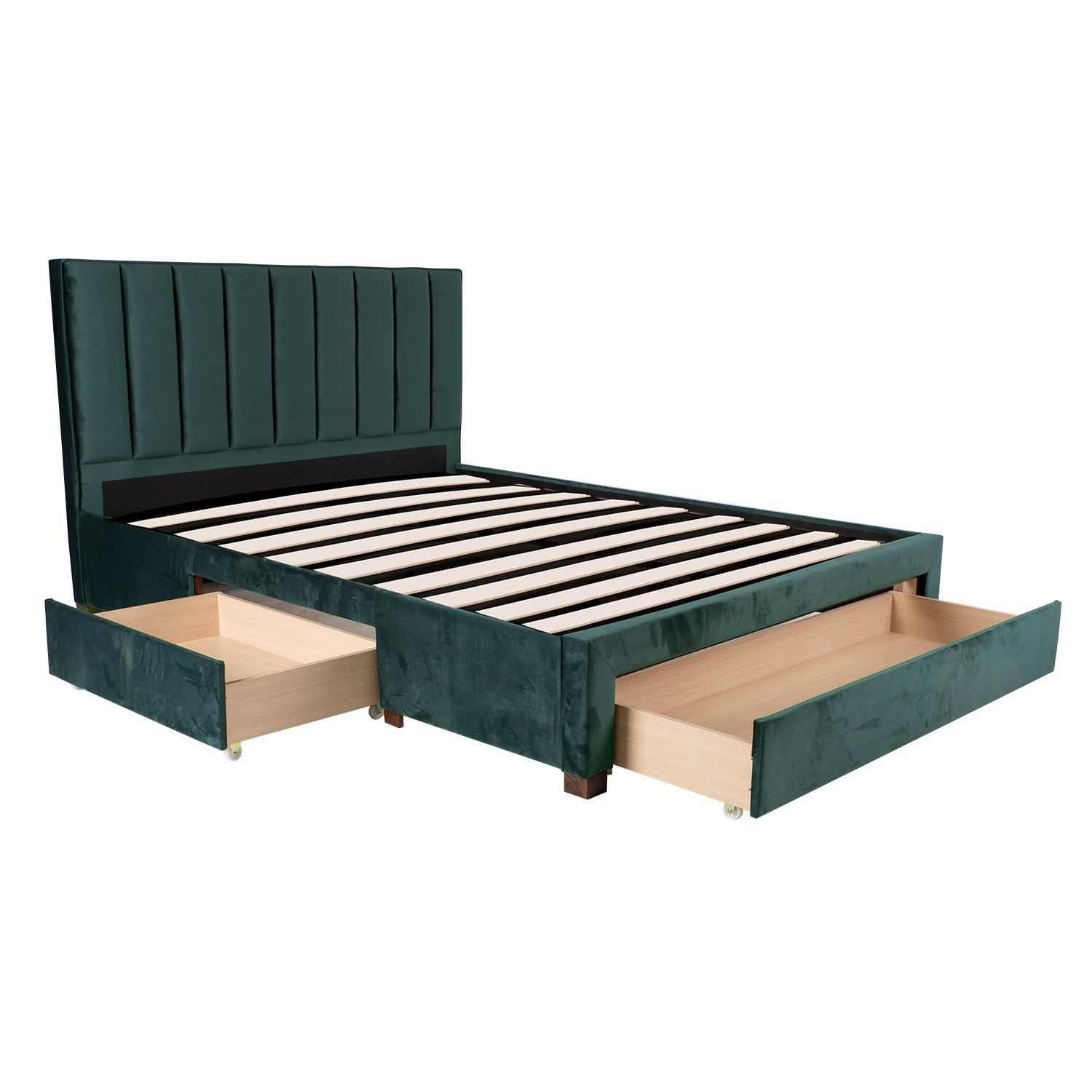 Lova GRACE 160×200 cm, žalia. Lovos rėmo viduje yra erdvūs sandėliukai. Stalčiuose galima laikyti antklodes, pagalves ir kitus daiktus. Lovos korpusas pagamintas iš MDF plokštės ir aptrauktas žalios spalvos poliesterio audiniu. Į komplektą įeina lovos pagrindas, galvūgalis ir lovos pagrindas. Čiužinys į komplektą neįtrauktas. Tinkamas čiužinys yra 160×200 cm. Gaminio matmenys 165x215x111 cm.