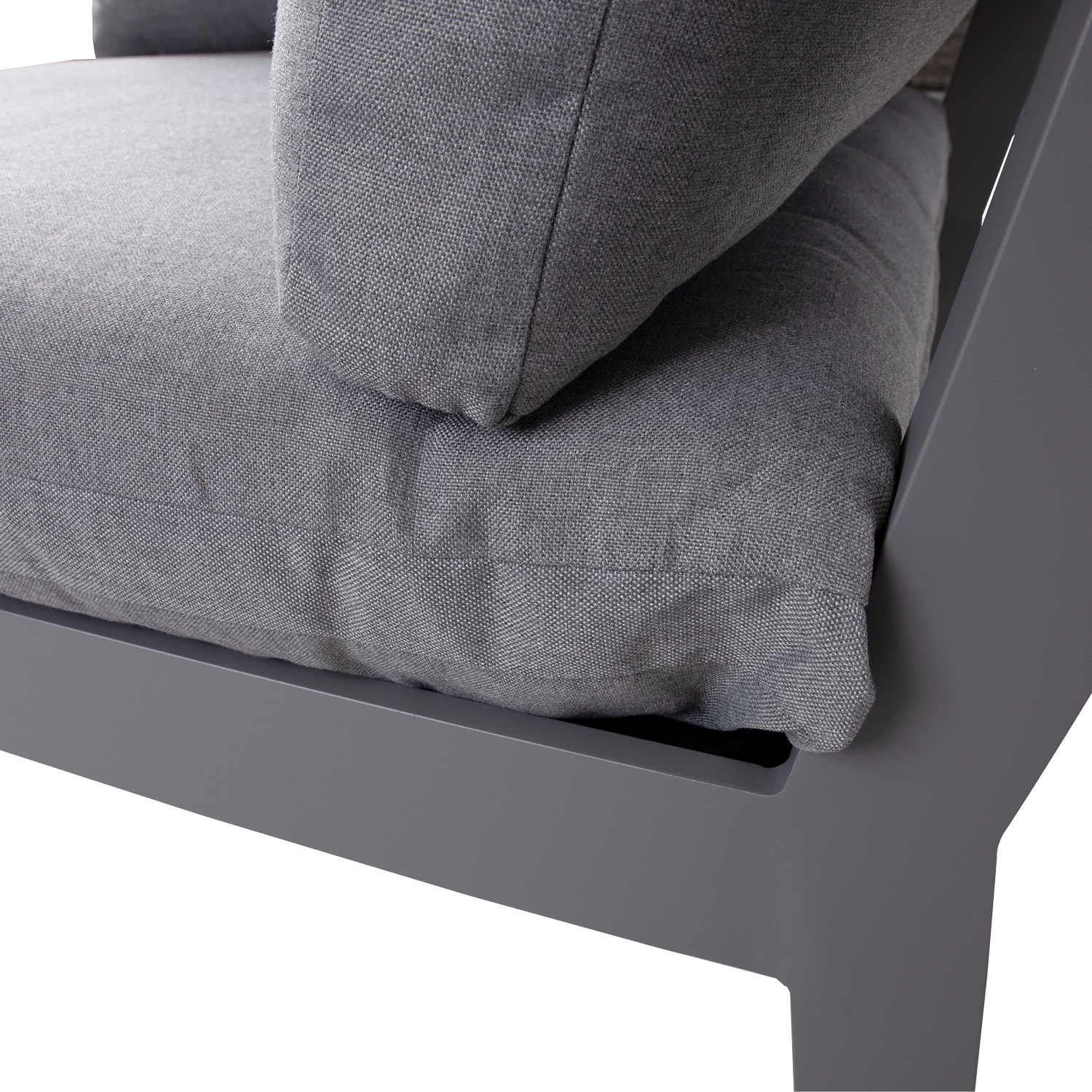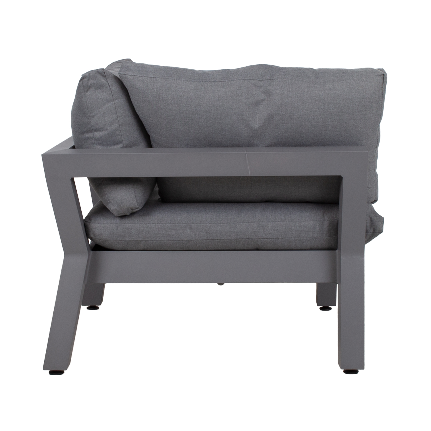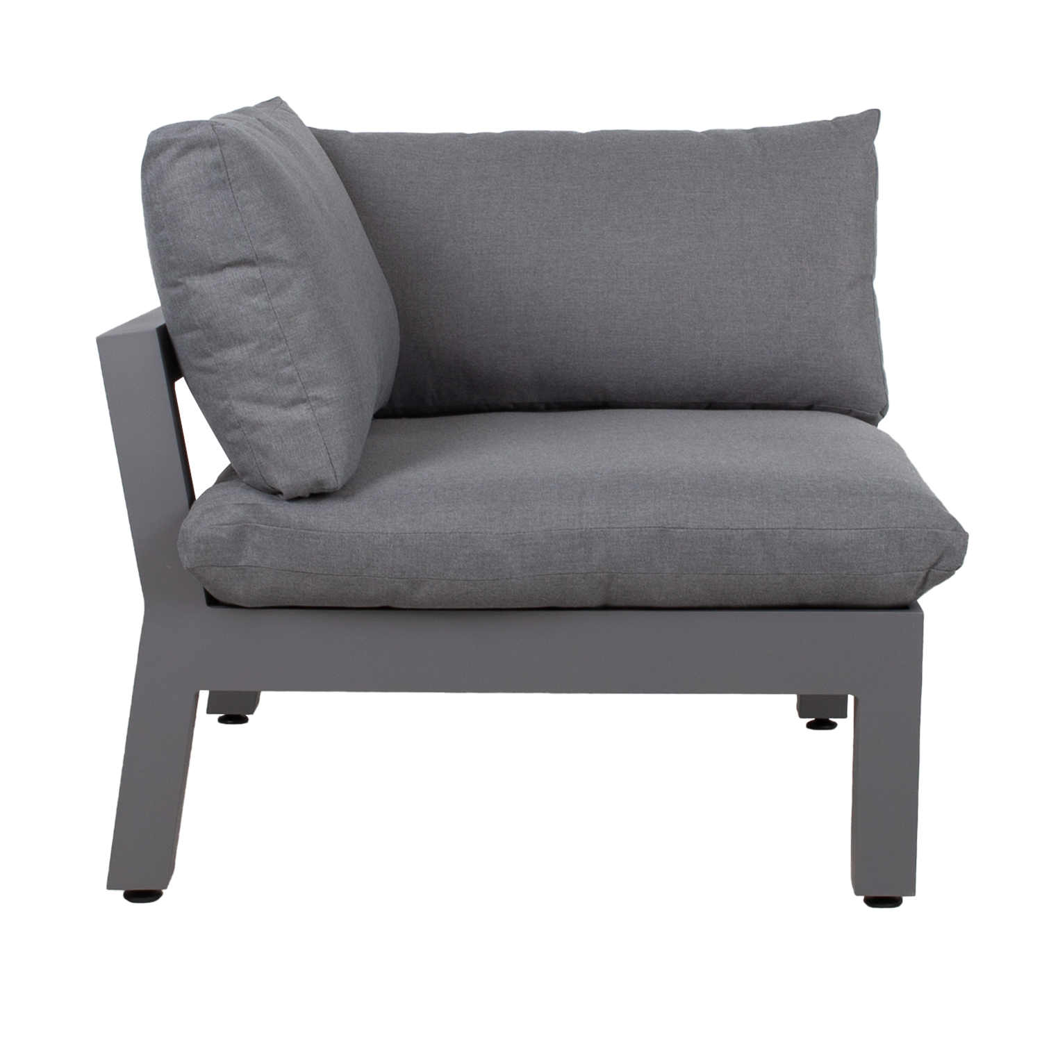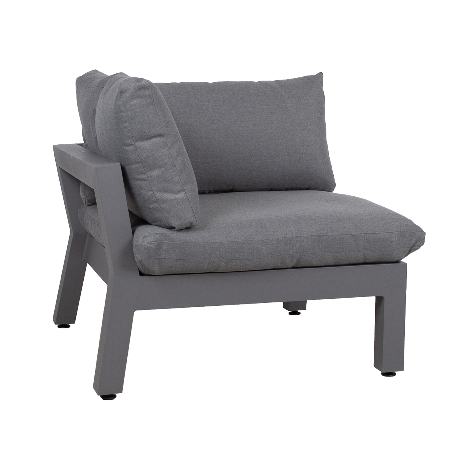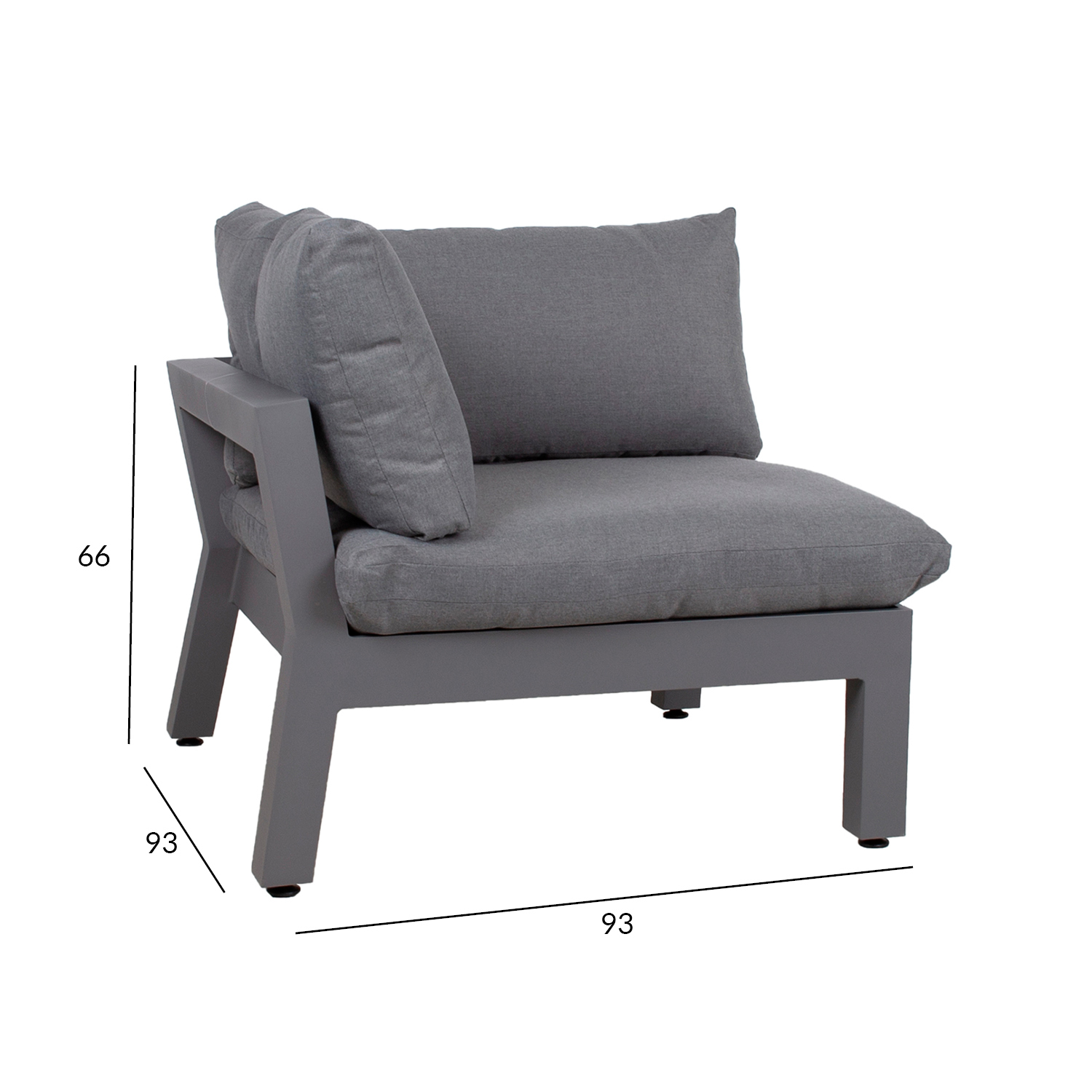 Kampinė sofa-lova FLUFFY 93x93xH66cm, pilka. Modulinė sofa – tai puikus būdas sukurti tinkamos formos ir dydžio sėdimąją vietą, kurią lengva keisti ir pertvarkyti. Sofos rėmas pagamintas iš aliuminio ir padengtas pilka milteline danga. Sėdynės pagrindas turi plačius pintus diržus, padengtus 3 cm porolono kilimėliu. Storos ir minkštos pagalvėlės bei elastingas sėdynės pagrindas užtikrina puikų sėdėjimo komfortą. Sėdynės aukštis iki rėmo krašto yra 35 cm, su pagalvėle – 51 cm. Sėdynės pagalvės matmenys 87x87xH16 cm, nugaros pagalvės 87x43x18 cm, nugaros pagalvės 72x43x16 cm. Pagalvių užvalkalai pagaminti iš pilko poliesterio audinio. Pagalvių užvalkalus galima nuimti ir skalbti. Gaminys labai atsparus besikeičiančioms oro sąlygoms ir lengvai prižiūrimas. Tik pagalvėles reikia apsaugoti nuo atmosferos poveikio. Užvalkalas pagalvėms yra geras sprendimas, jei norite kasdien laikyti čiužinius ir išlaikyti juos sausus. Norėdami prailginti lauko baldų tarnavimo laiką, rekomenduojame naudoti lauko baldų užvalkalus. PRIEŽIŪRA: pasibaigus vasaros sezonui, rekomenduojame sodo baldus laikyti patalpoje. Pasibaigus vasaros sezonui, rekomenduojame palikti sodo baldus žiemos mėnesiais. Sandėliavimui naudokite sausą ir gerai vėdinamą patalpą.