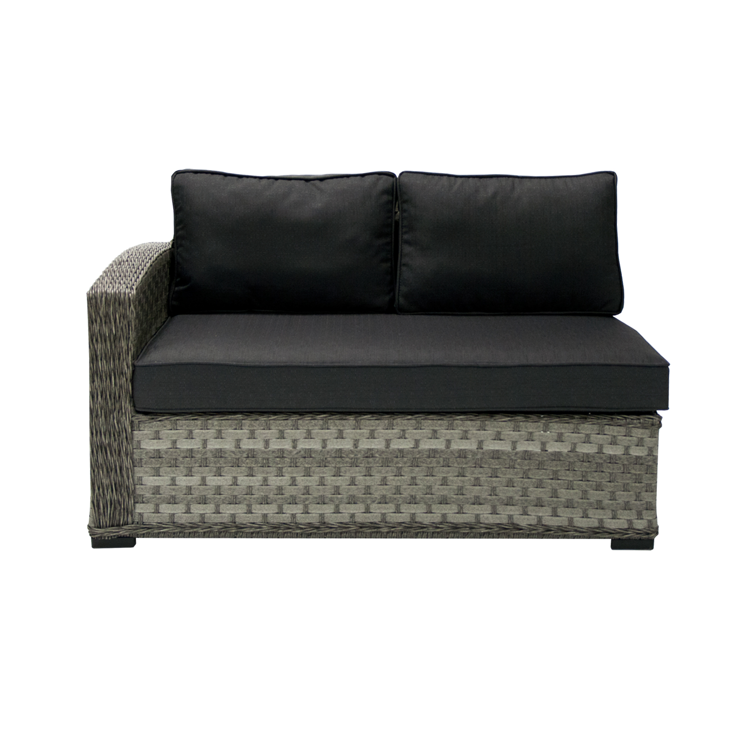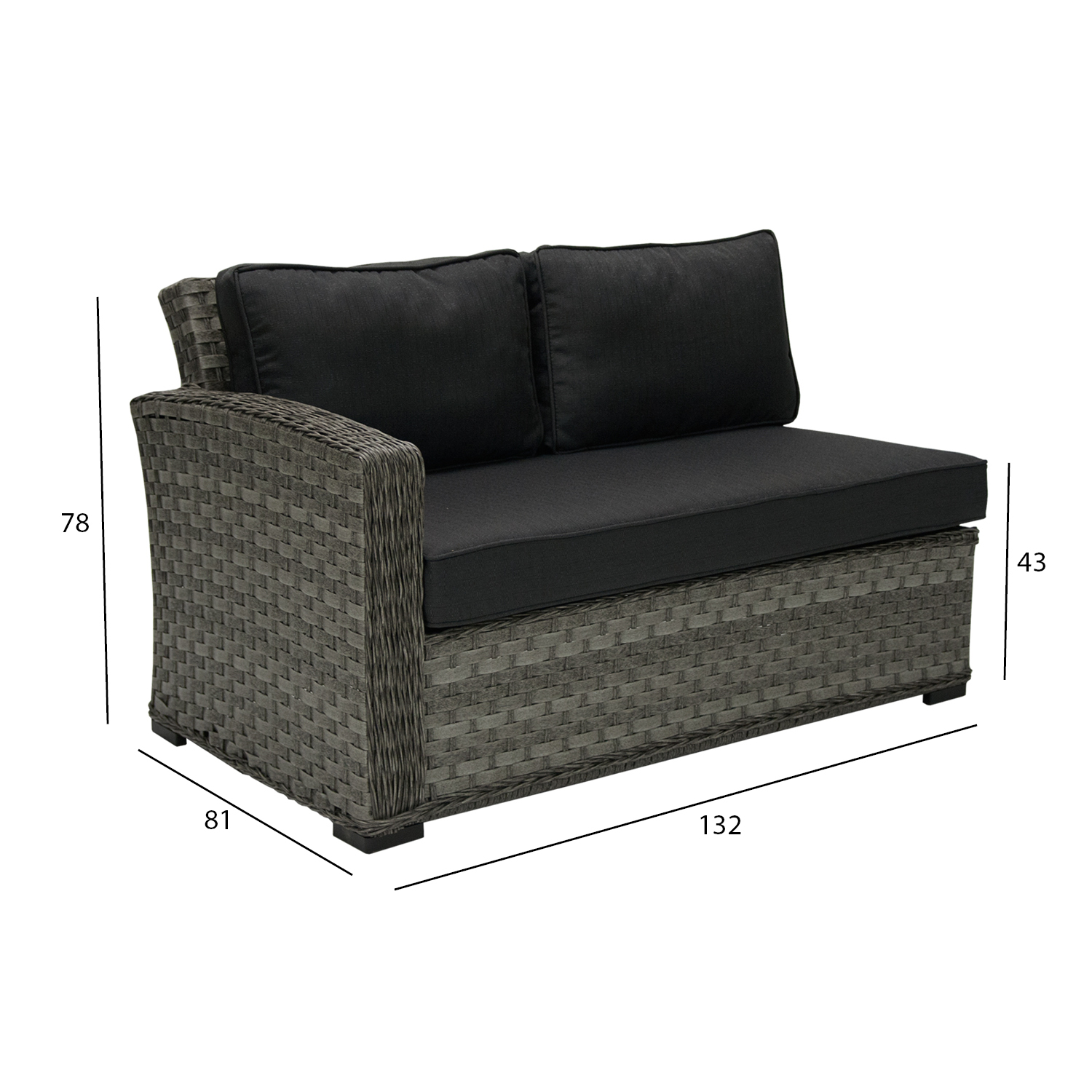 Modulinė sofa GENEVA 2 vietų 132x81xH78, kairysis fotelis, pilka. Modulinė sofa – puikus būdas sukurti tinkamos formos ir dydžio sėdimąją zoną, kurią lengva keisti ir pertvarkyti. Sofos aliumininis rėmas padengtas plastikine apyranke. Pagalvėlės pagamintos iš pilko poliesterio audinio. Sėdimosios pagalvės matmenys 122x63xH10 cm, atlošo pagalvės matmenys 64x45x10 cm – 2 vnt. Pagalvių užvalkalai nuimami ir skalbiami. Sėdynės aukštis iki rėmo krašto 33 cm, su pagalve – 43 cm. Gaminys labai atsparus besikeičiančioms oro sąlygoms ir lengvai prižiūrimas. Tik pagalvėles reikia apsaugoti nuo atmosferos poveikio. Rekomenduojame naudoti lauko baldų užvalkalus, kad prailgintumėte jų tarnavimo laiką. Modulių jungiamieji laikikliai į komplektą neįeina. PRIEŽIŪRA: pasibaigus vasaros sezonui, rekomenduojame sodo baldus laikyti patalpoje. Jei plaktuko sezonui, sodo baldus reikėtų laikyti namuose. Sandėliavimui naudokite sausą ir gerai vėdinamą patalpą.