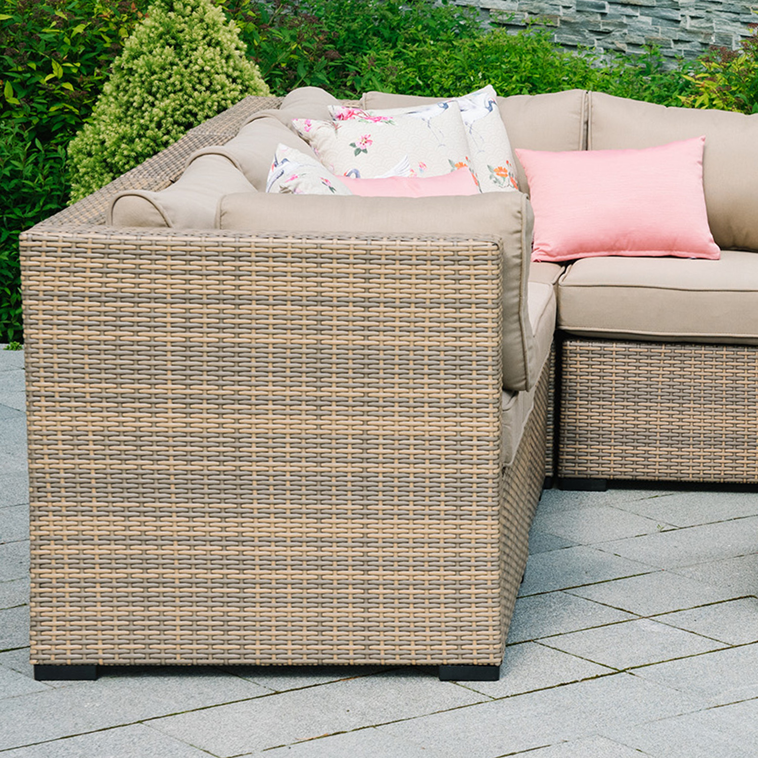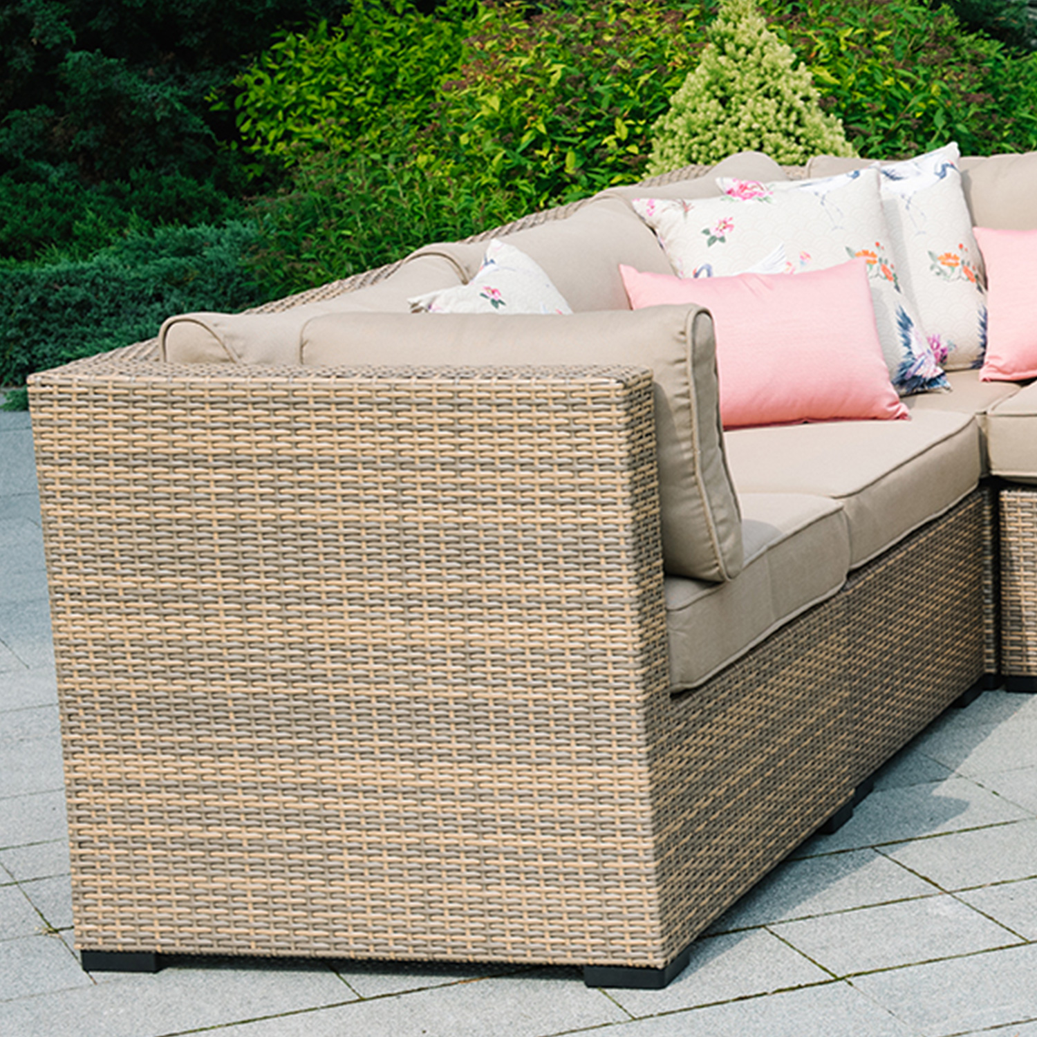 Gaminys labai atsparus besikeičiančioms oro sąlygoms ir lengvai prižiūrimas. Tik pagalvėles reikia apsaugoti nuo atmosferos poveikio.