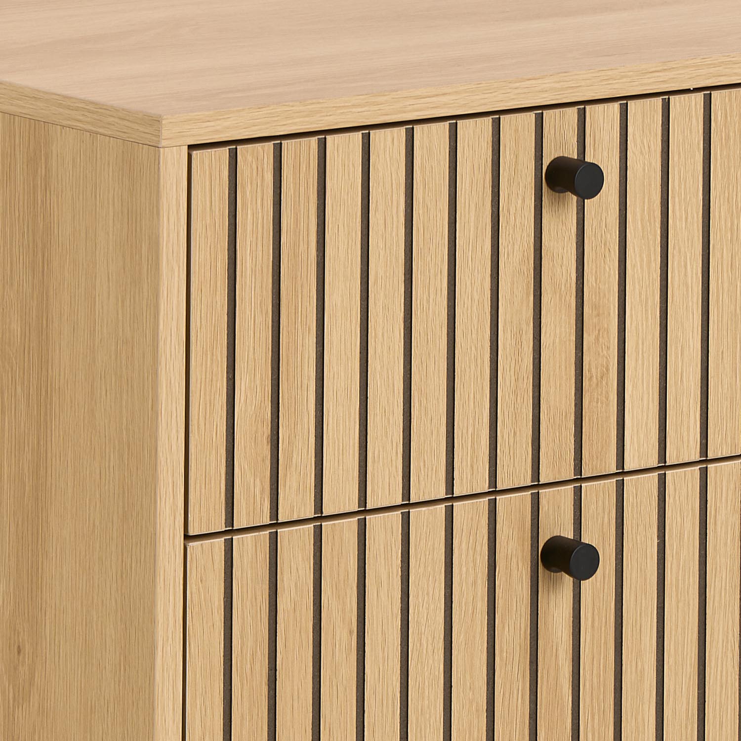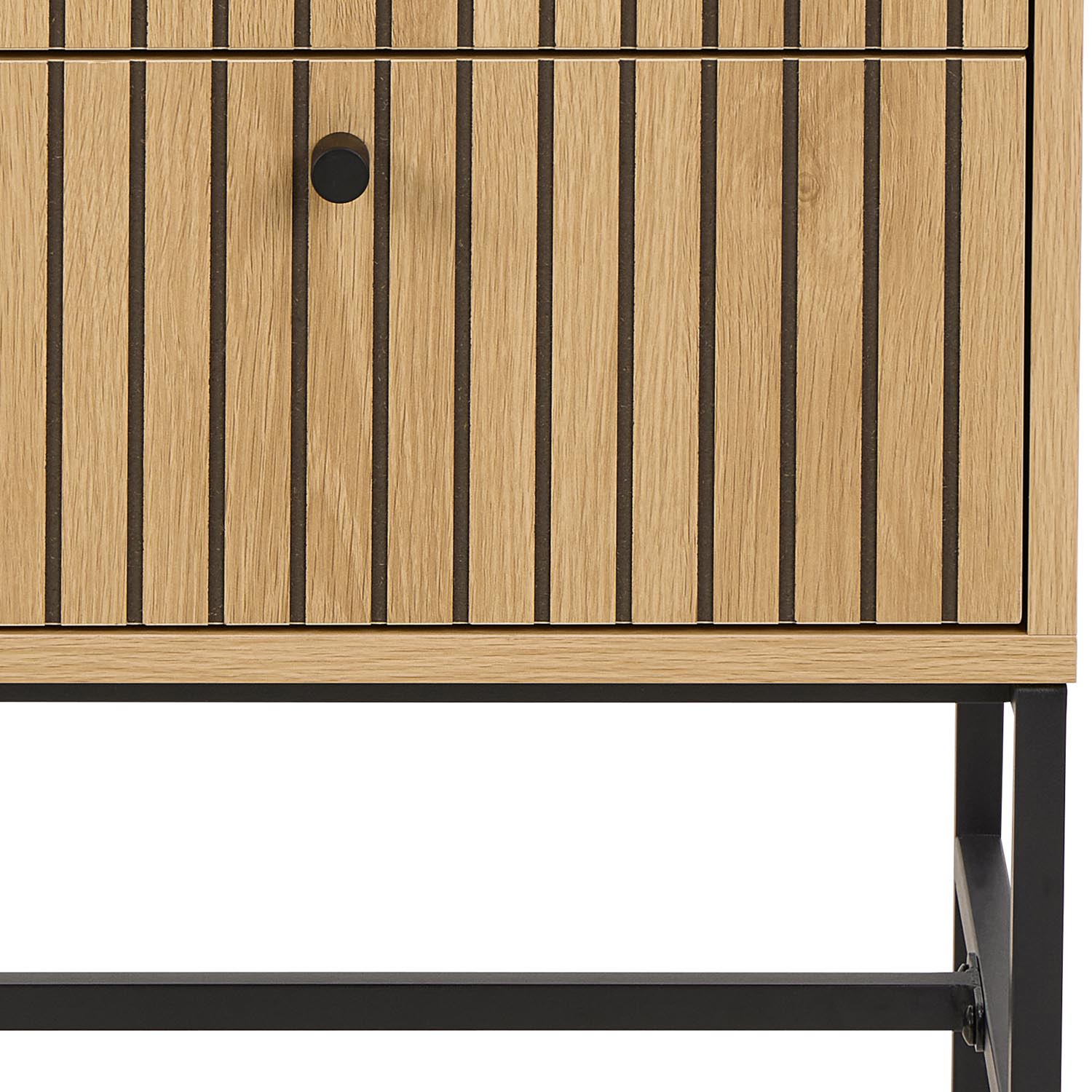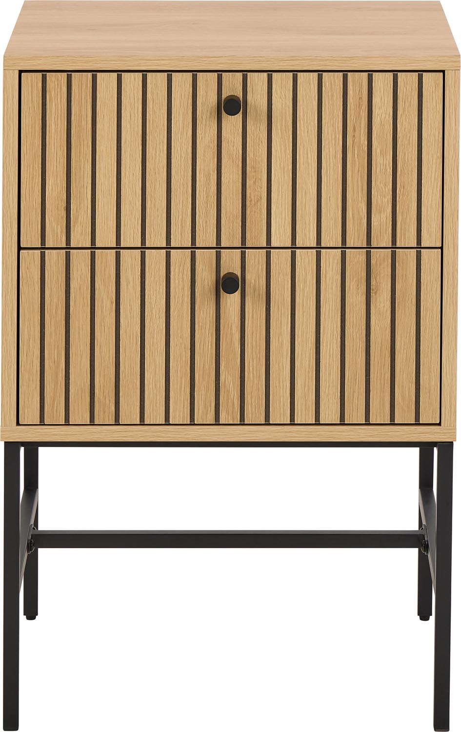 Stačiakampio formos ir geometrinio pagrindo naktinis staliukas patraukia dėmesį. Žaisdamas su kontrastais, ąžuolo išvaizda, papildyta juodais akcentais, sukuria gerai subalansuotą vizualinį patrauklumą. Ant staliuko yra 2 stalčiai, todėl jame galima laikyti būtiniausius daiktus. Lengvai prižiūrimas paviršius padidina jo praktiškumą. Naktinis staliukas pagamintas iš ąžuolo šiurkštaus melamino. Pagrindas pagamintas iš matinio juodo šiurkštaus milteliniu būdu dengto plieno. Matmenys: 45,6x40xH70 cm.