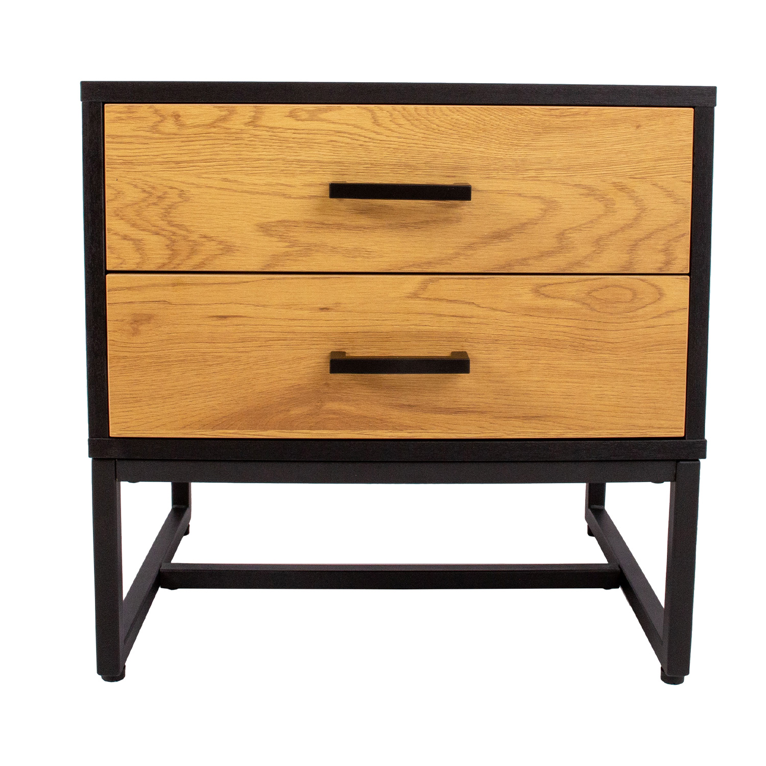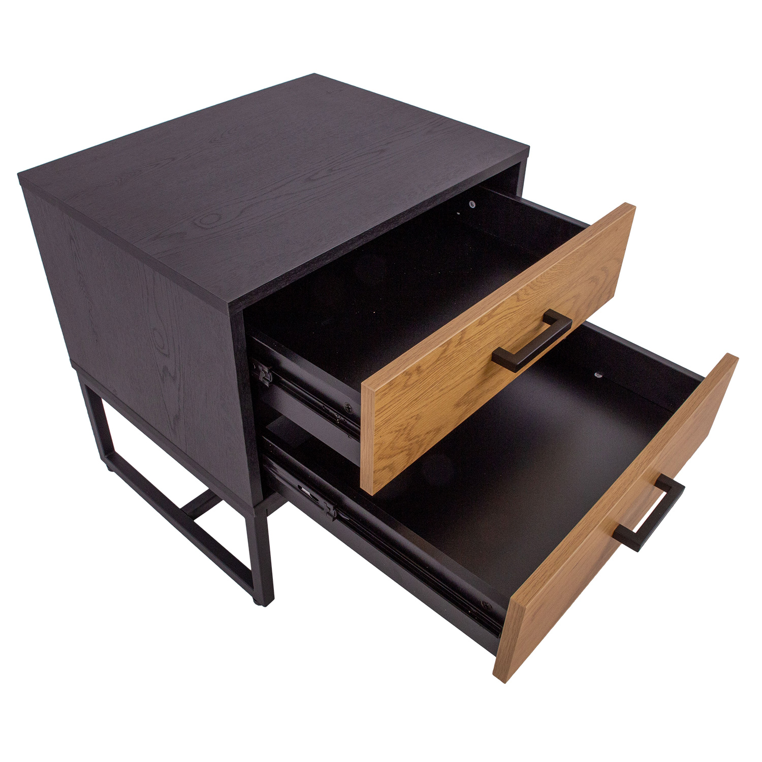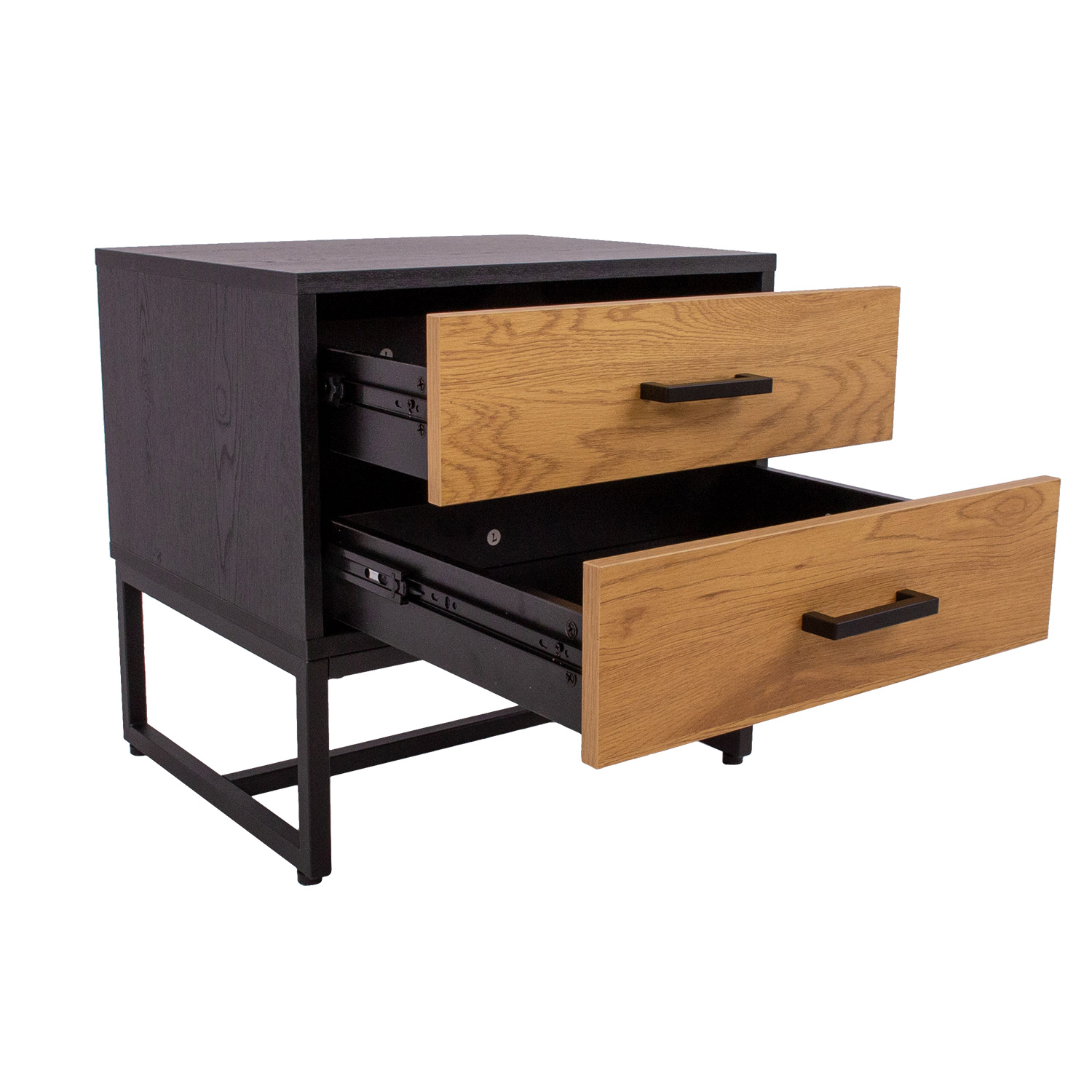 Öökapp AMSTERDAM 50x40xH50cm. Medžiaga: melaminas, spalva: ąžuolas/juoda. Juodos spalvos metalinis pagrindo rėmas. Tyliai užsidarantys stalčių bėgeliai. Juodos aliuminio rankenos.