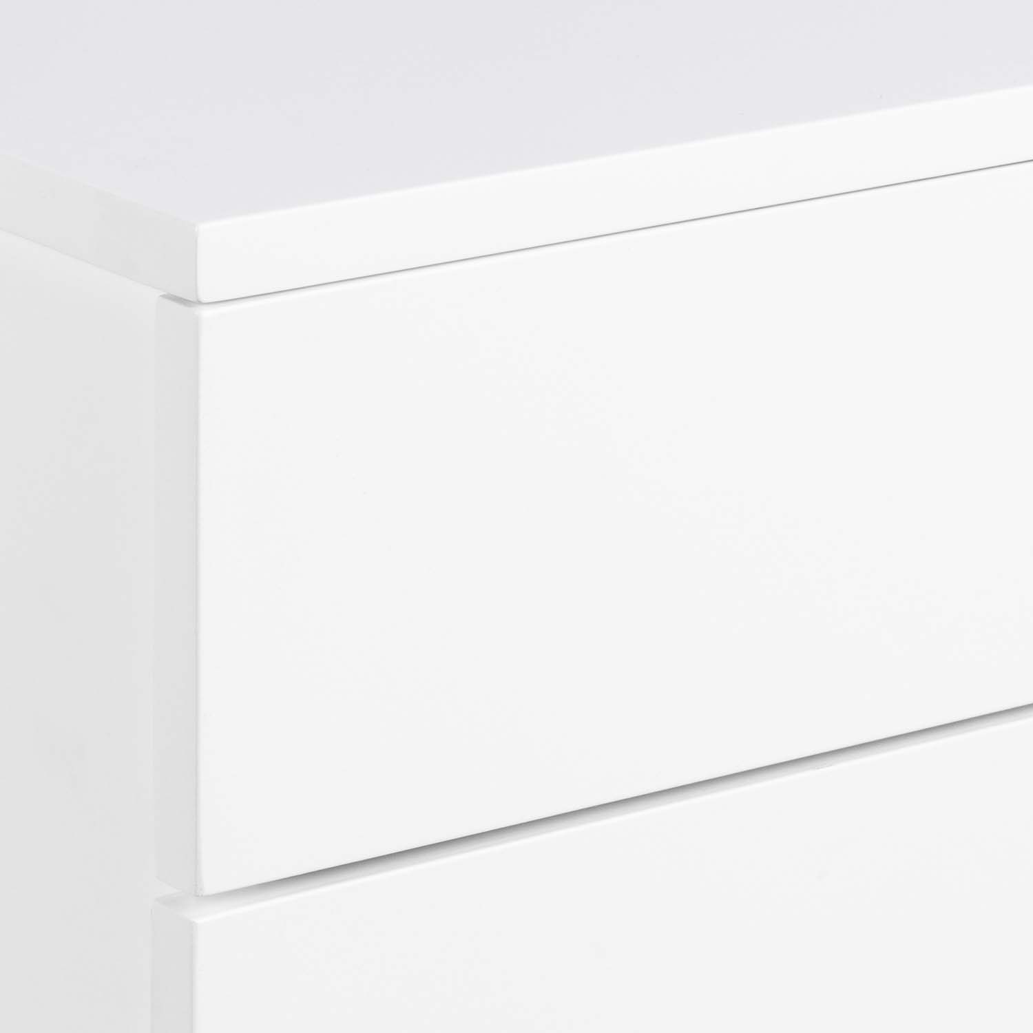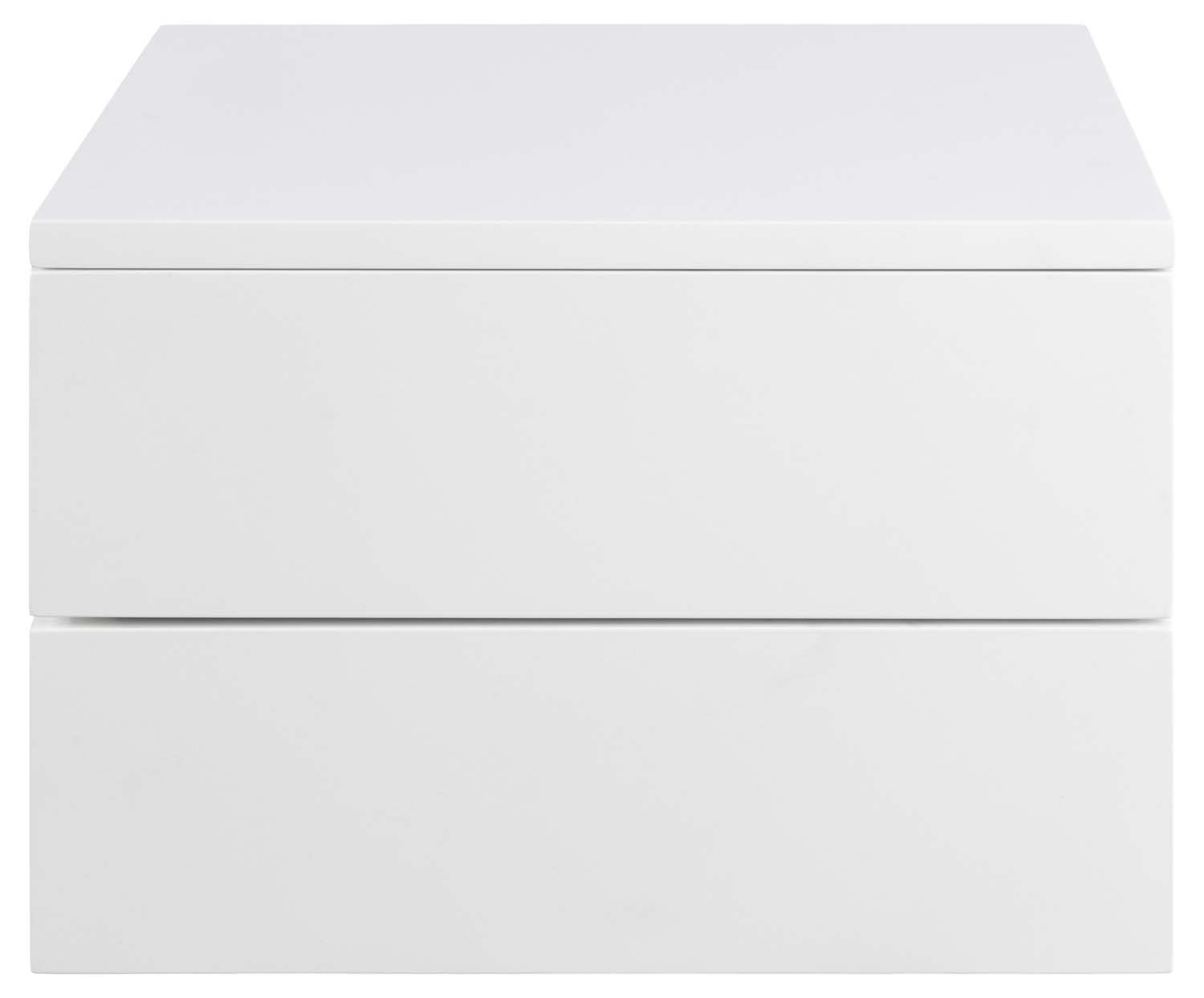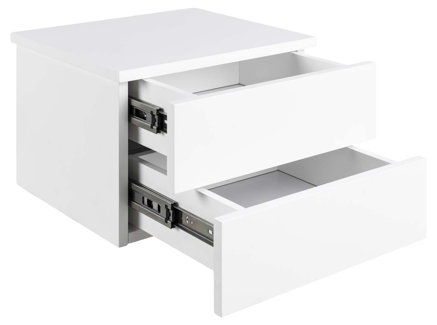 Tai idealus bet kurio miegamojo papildymas, jei mėgstate minimalistinę, elegantišką išvaizdą. Švarių linijų ir baltai dažyto paviršiaus. Naktinį staliuką lengva pritvirtinti šalia lovos pageidaujamame aukštyje. Su 2 stalčiais yra daug vietos knygoms, akiniams ir viskam, ko jums reikia. Dėl sklandžiai slankiojančio stalčiaus galėsite paslėpti būtiniausius daiktus. Stalčius turi metalinius bėgelius. Integruota rankena suteikia švarią išvaizdą. Naktinis staliukas pagamintas iš MDF. Išmatavimai: 37x32xH24,6 cm.
