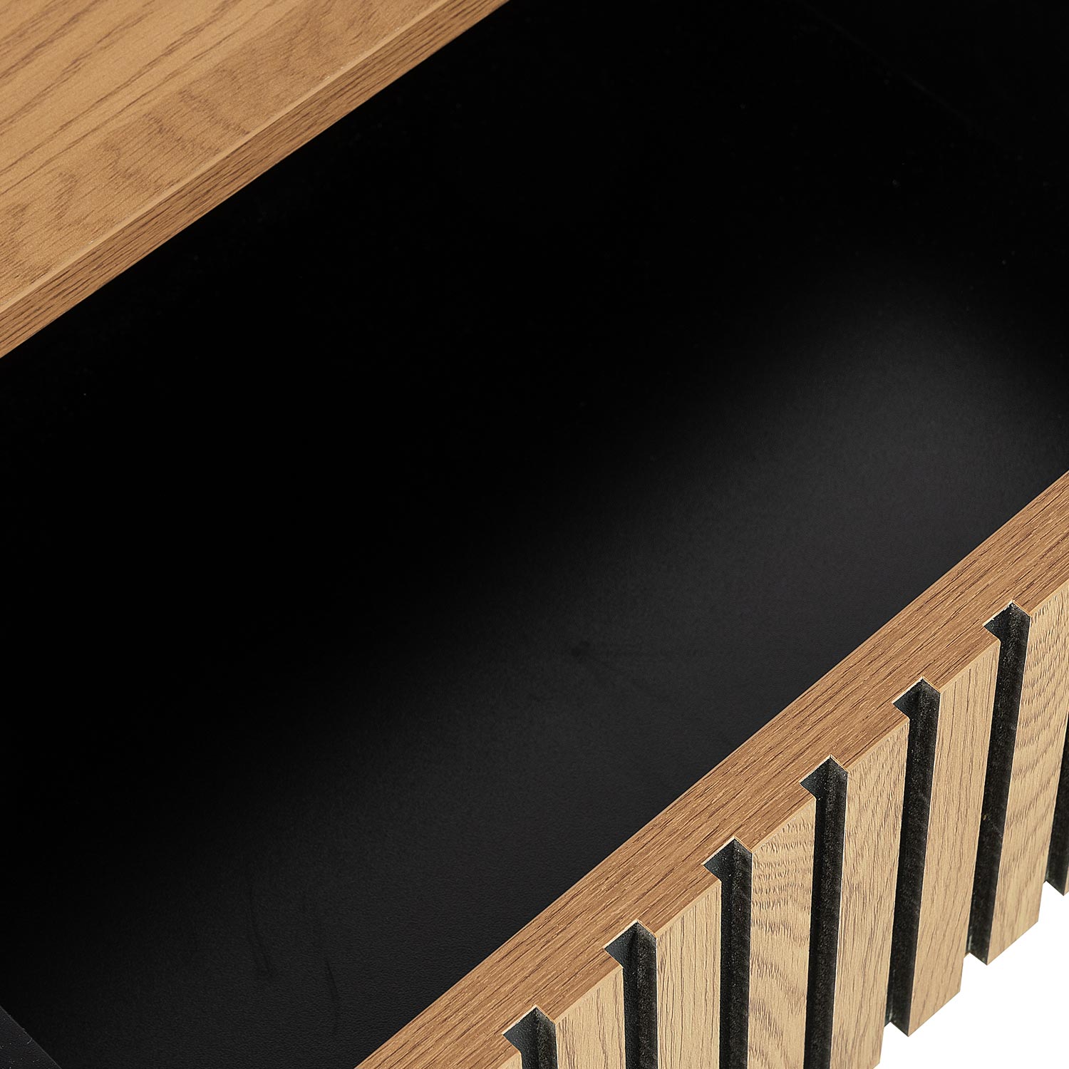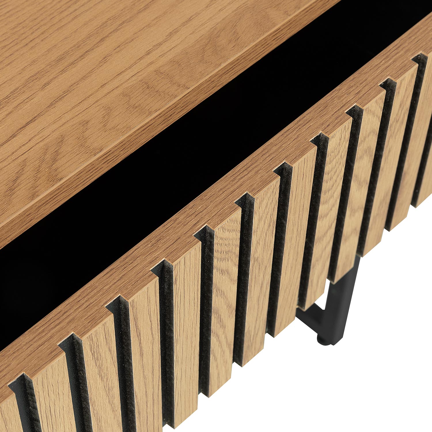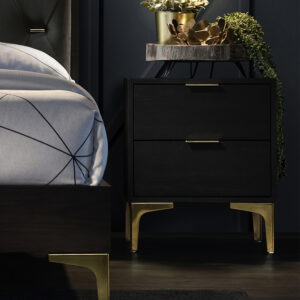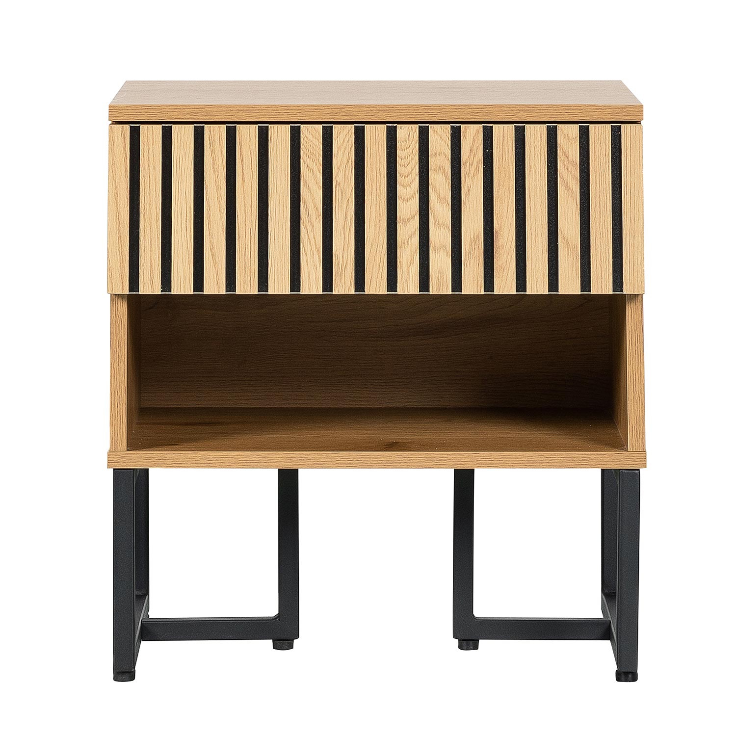Naktinis staliukas HAMPTON su stalčiumi ir atvira lentyna 50x40xH55cm. Naktinės spintelės korpusas pagamintas iš melamino plokštės su ąžuolo lukštu. Priekinė stalčiaus panelė dekoruota siauromis ąžuolo spalvos MDF juostelėmis juodame fone. Stalčius juda ant metalinių bėgelių. Metalinis naktinės spintelės pagrindo rėmas padengtas juoda milteline danga.