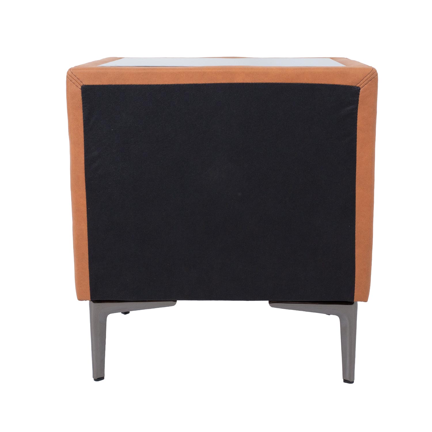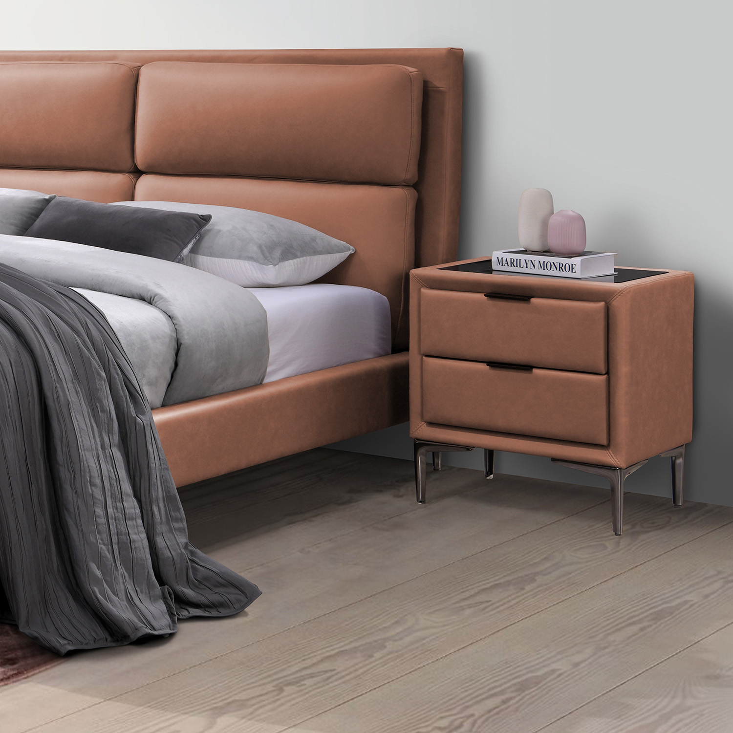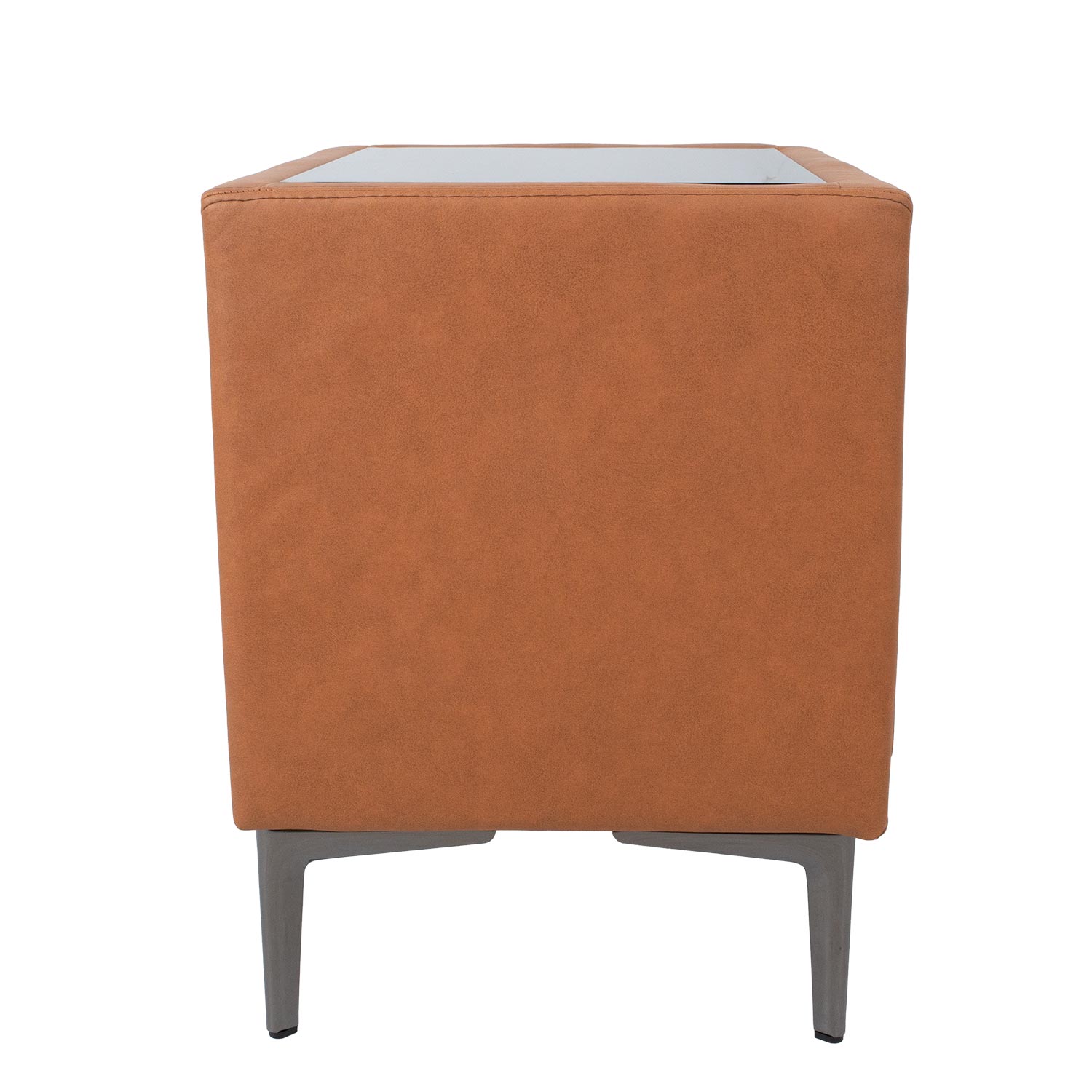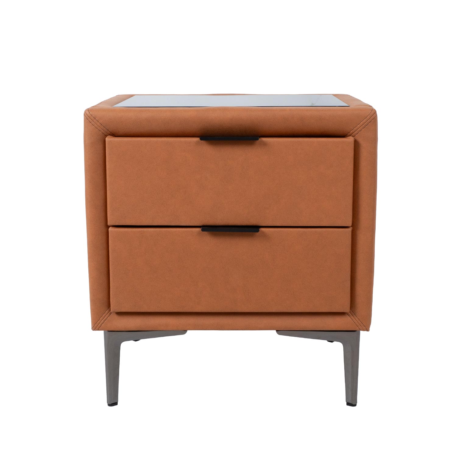 Naktinis staliukas LENA su 2 stalčiais 50,5x41xH54cm, konjako rudos spalvos. Naktinės spintelės korpusas pagamintas iš baldinės plokštės ir padengtas nauja į odą panašia medžiaga (Leathaire), kurioje dera graži odos tekstūra ir audinio šiluma. Leathaire yra ideali baldų dangos medžiaga, nes ji puikiai praleidžia orą, nepraleidžia vandens, yra atspari įbrėžimams ir labai patvari. Naktinės spintelės viršus padengtas tamsaus grūdinto stiklo stalviršiu. Naktinė spintelė turi tamsaus metalo kojeles ir stalčių rankenėles.