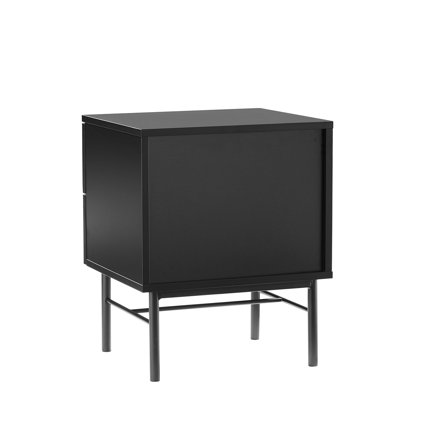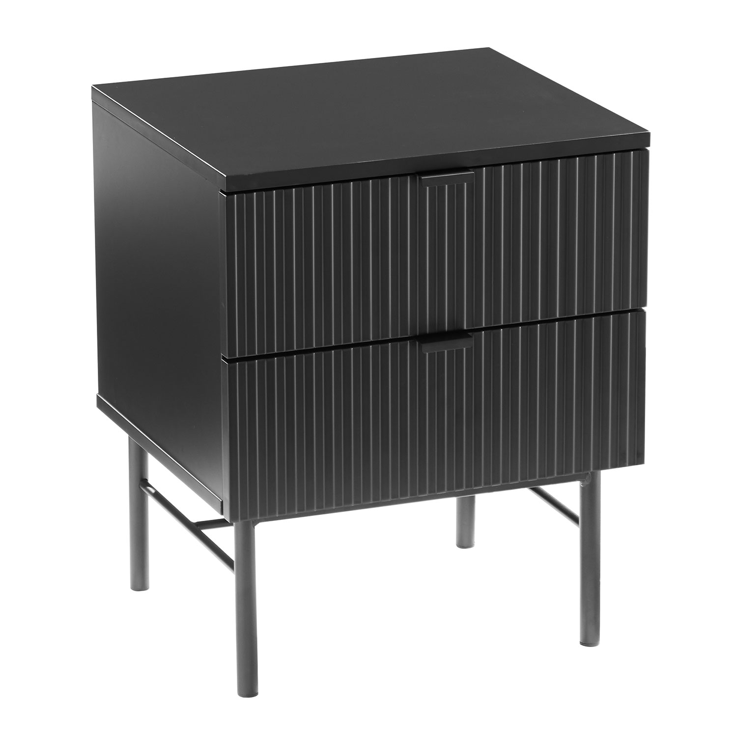 Naktinis staliukas SEQUENCE 2 stalčių 45x40xH55cm, juodos spalvos. Spintelės korpusas pagamintas iš MDF. Dryžuoti stalčių priekiai su reljefiniu paviršiumi suteikia spintai išskirtinę ir madingą išvaizdą. Stalčiai stumdomi ant metalinių šliaužiklių. Naktinės spintelės apdaila padengta patvariais poliuretano dažais. Metalinis pagrindo rėmas ir kojelės dažytos milteliniu būdu.