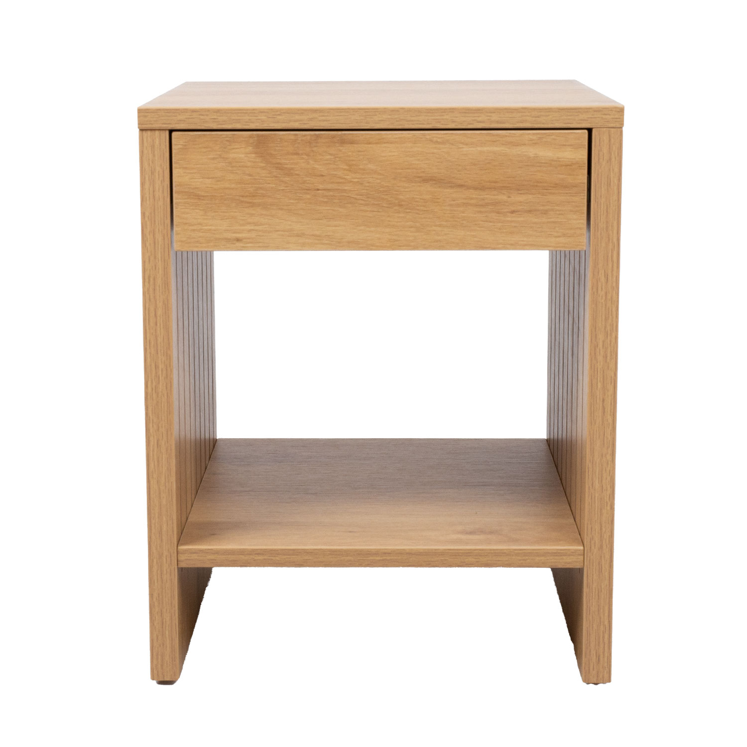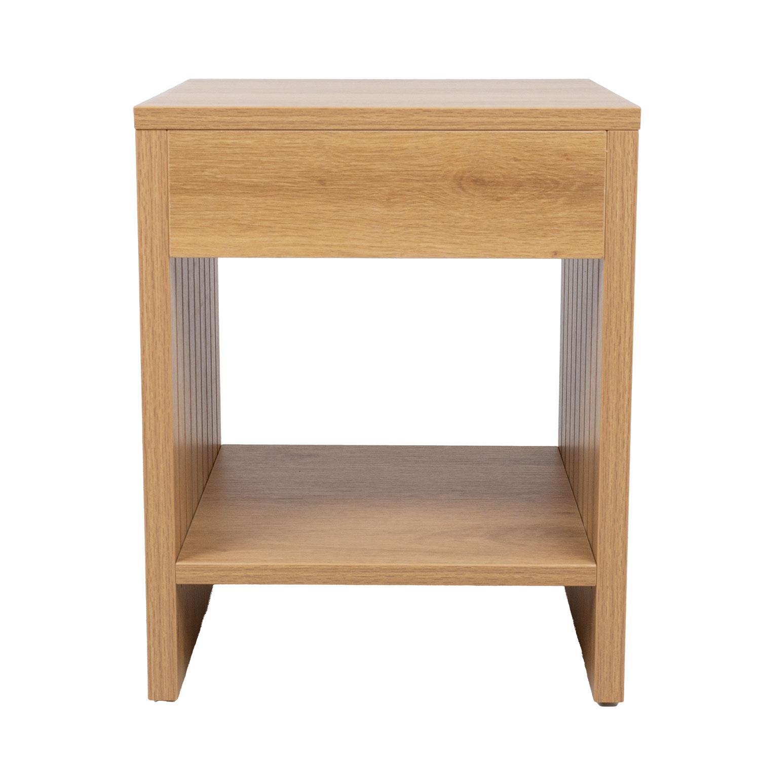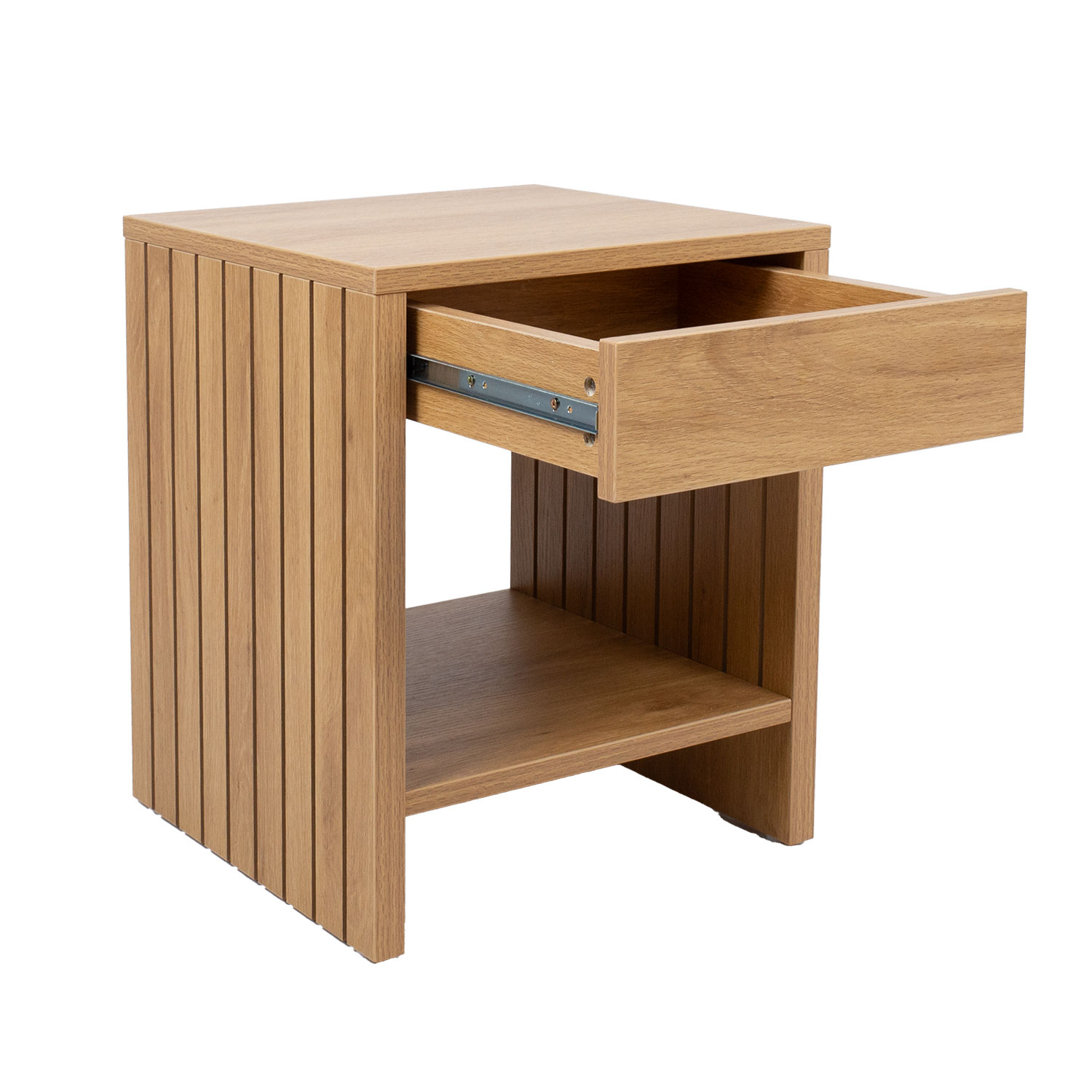 Naktinis staliukas SUNNY su stalčiumi ir lentyna 40x40xH50cm, melamino ąžuolas. Naktinis staliukas pagamintas iš šviesaus ąžuolo melamino viršaus. Galiniai skydeliai turi 3D apdailą.