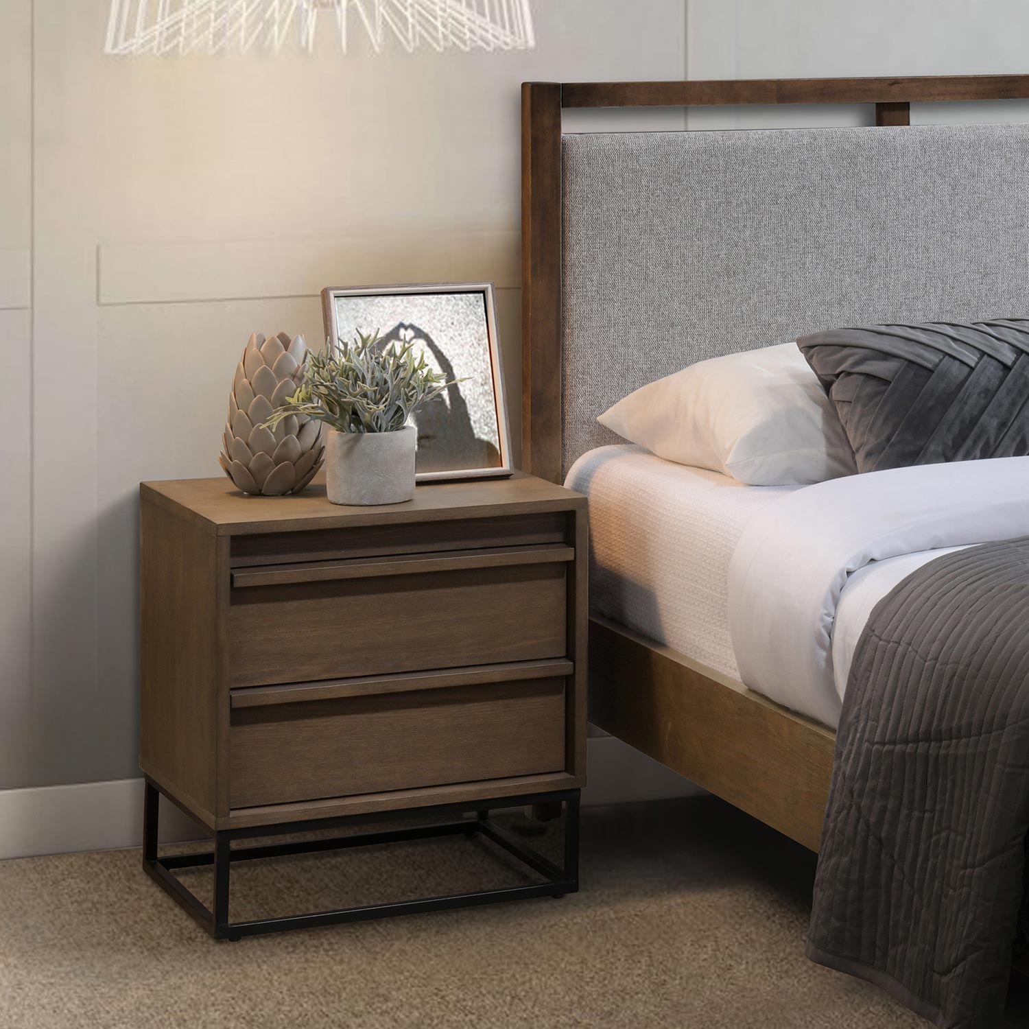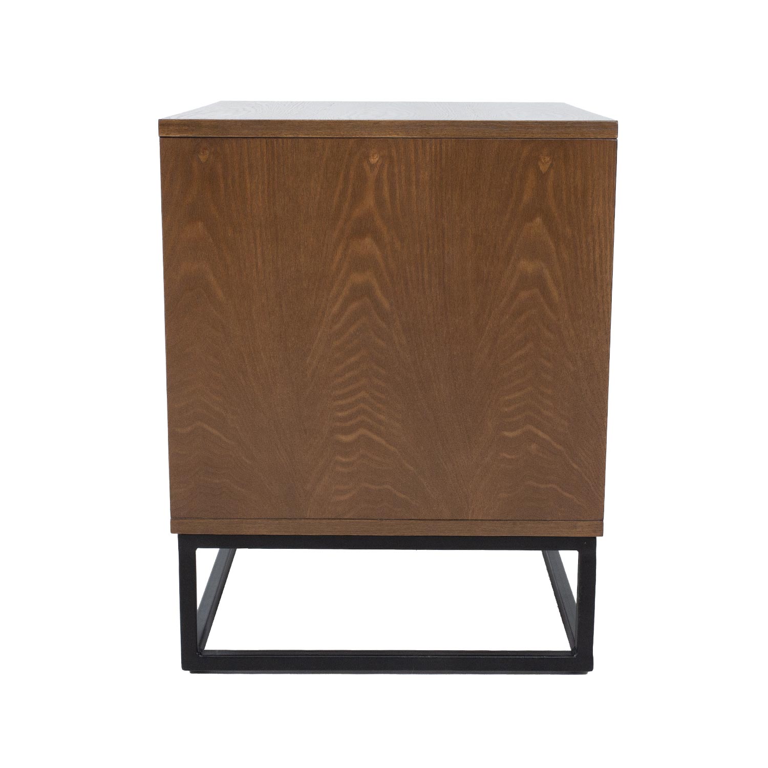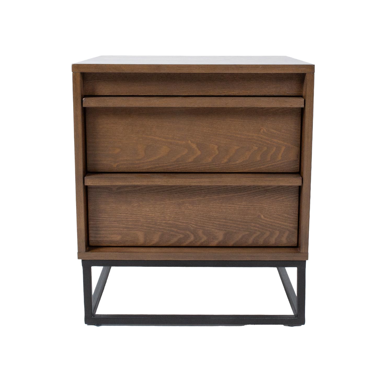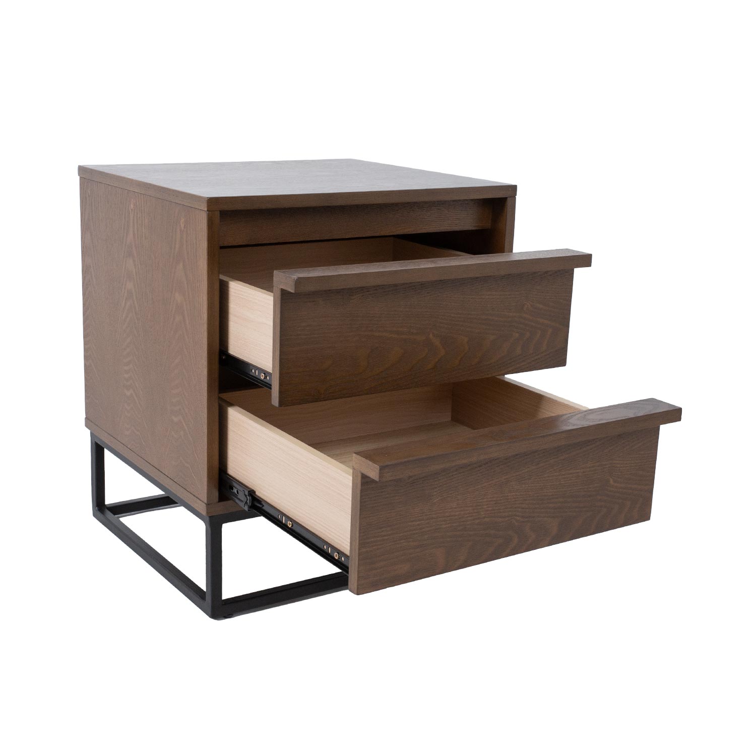 Naktinis staliukas VOKSI 2 stalčiai 40x45xH52cm, graikinis riešutas. Naktinis staliukas pagamintas iš baldinės plokštės su natūralia salos fanera ir padengtas tamsiu riešutmedžio laku. Metalinis naktinės spintelės pagrindo rėmas nudažytas juodais milteliniais dažais.