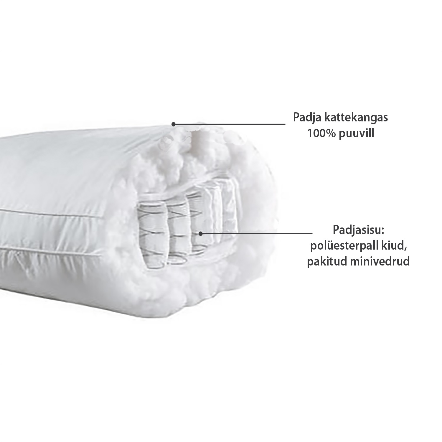 PERFECT SLEEP BY HOME4YOU. Pagalvės užvalkalas – 100 % medvilnė. Prabangiai minkšta pagalvė su viduje įdėtu miniatiūrinių spyruoklių bloku. Miniatiūrinės spyruoklės patikimai pritvirtintos pagalvės centre ir apsuptos storu aukštos kokybės poliesterio rutulinio pluošto sluoksniu. Pagalvė su spyruoklėmis yra labai elastinga ir ilgai išlaiko savo formą. Ritininė pakuotė.